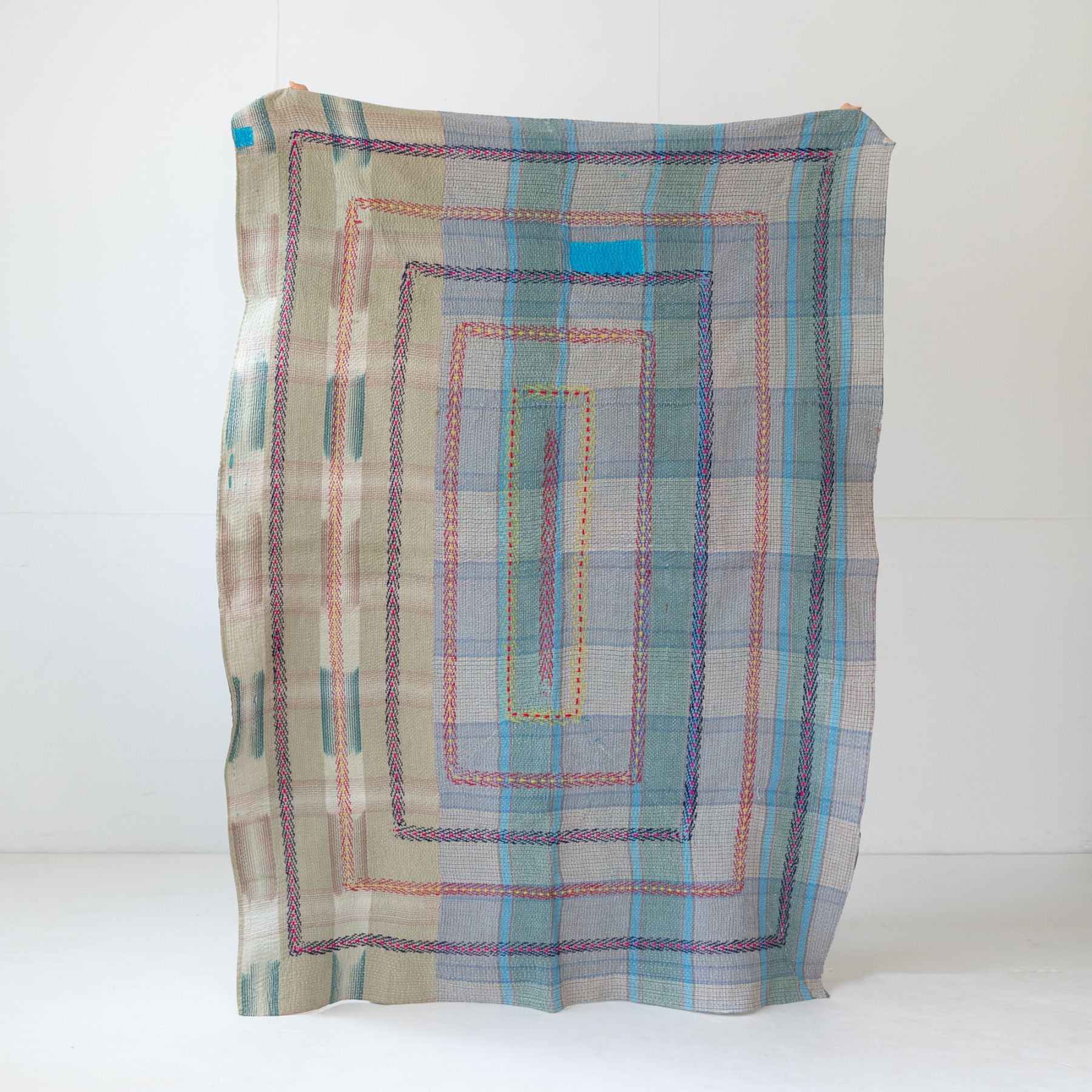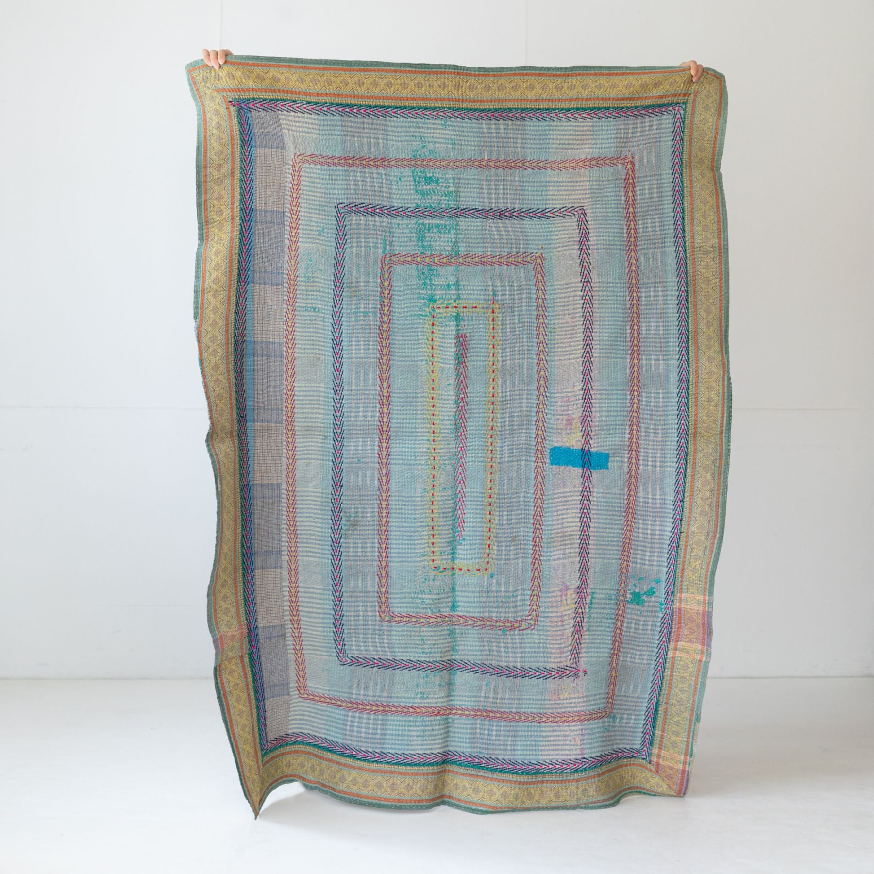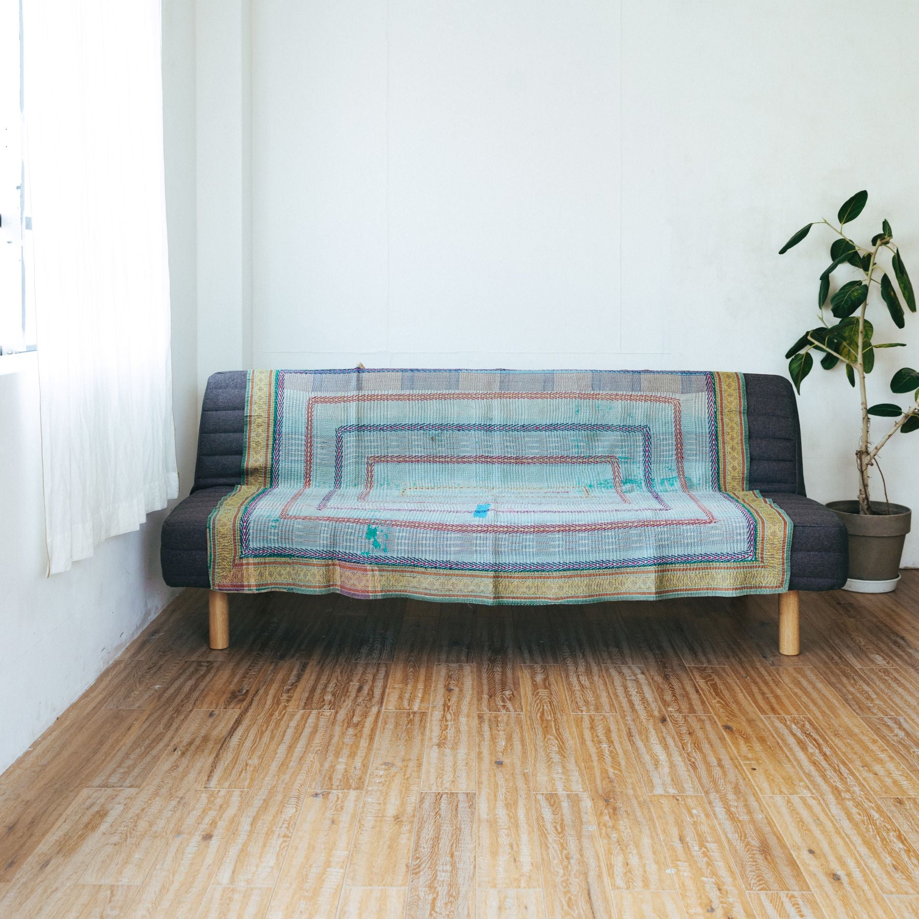 古いサリーに新たな命を吹き込むように、ひと針ひと針丁寧に手仕事で仕立てられたマルチカバーです。
