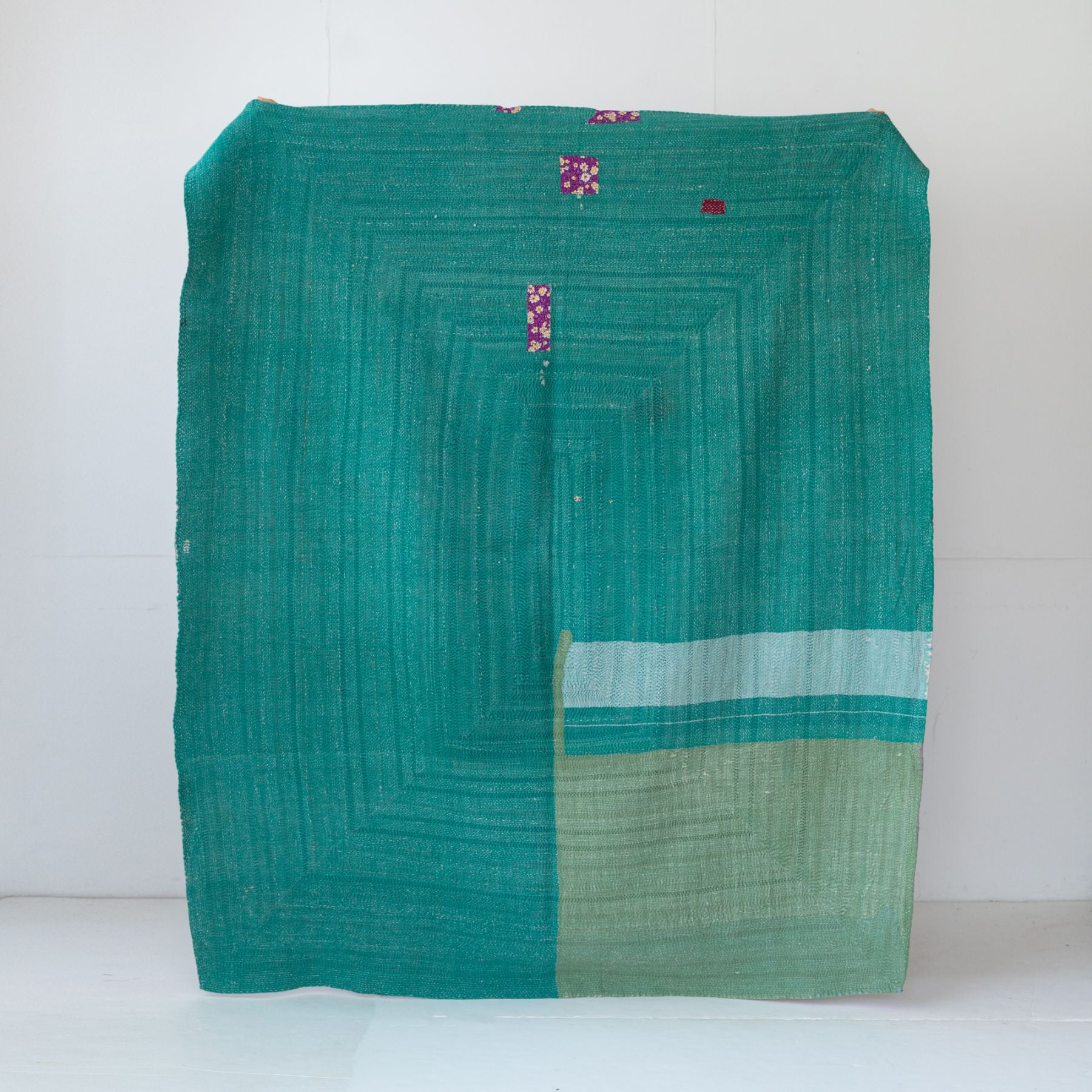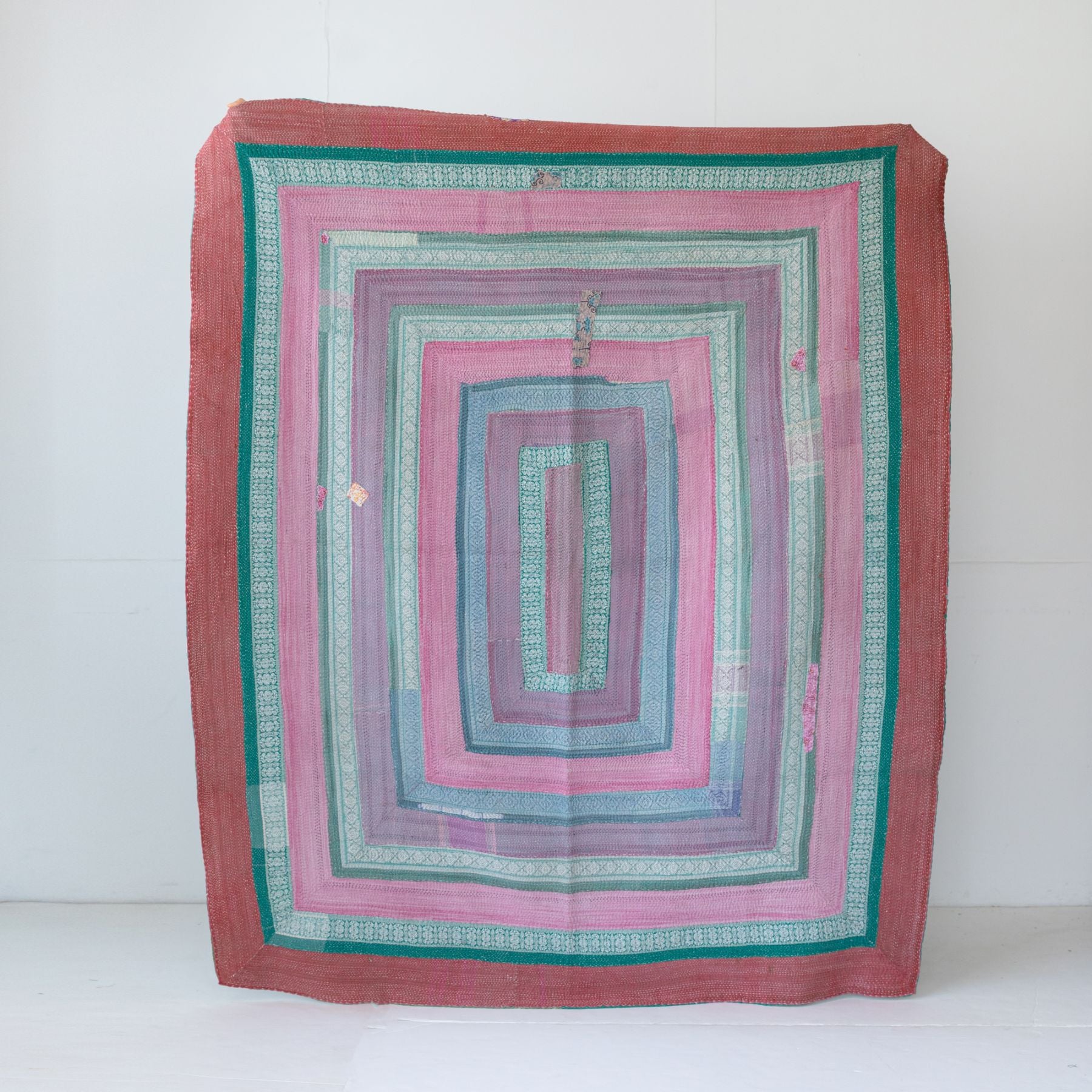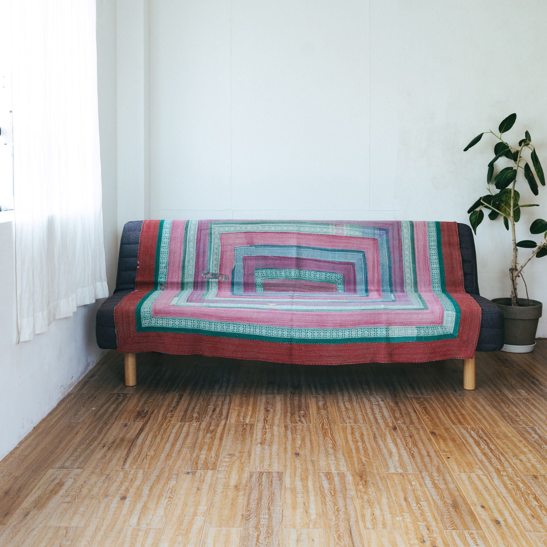 古いサリーに新たな命を吹き込むように、ひと針ひと針丁寧に手仕事で仕立てられたマルチカバーです。