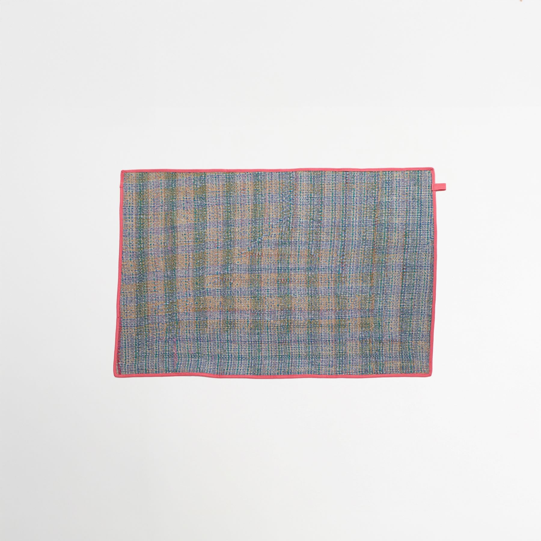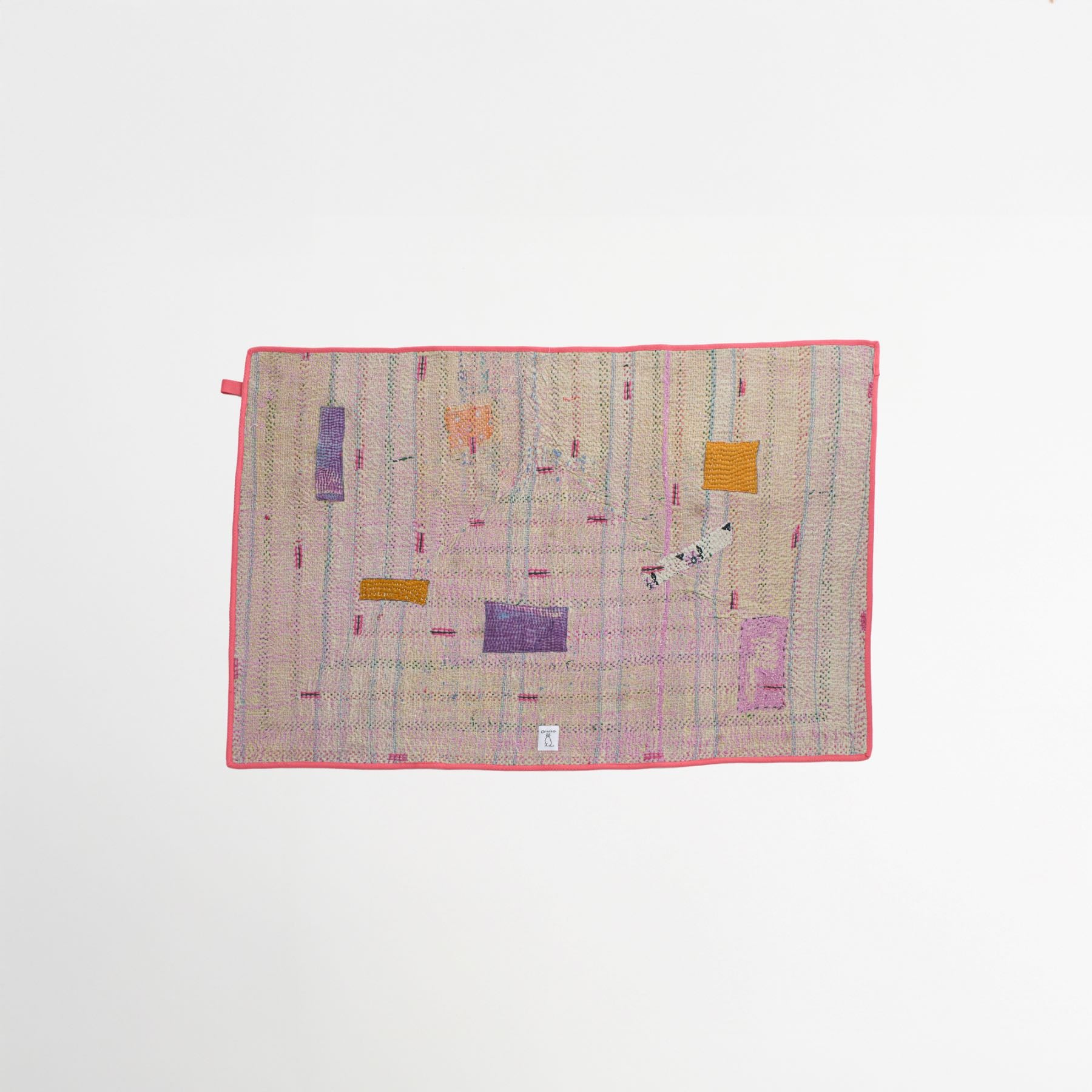 今回からフチにはフリンジではなく、パイピングテープを施しました。ネコちゃんのいたずらを防いで、強度もアップ。