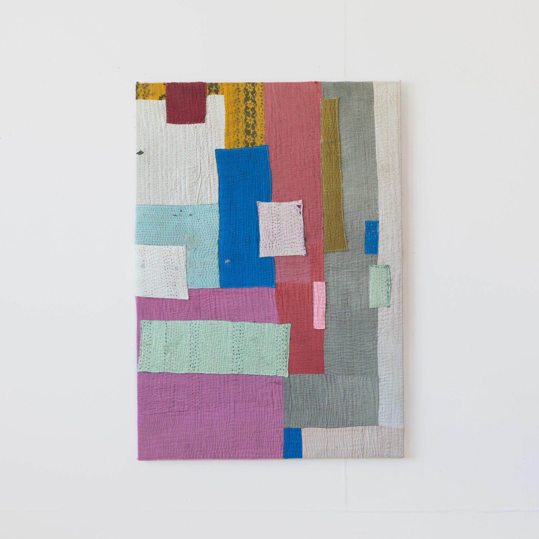 ヴィンテージの大判のカンタカバーは、全体の色合いが美しいものでも、部分的に穴やダメージがあることがよくあります。そこで、特に気に入った部分だけを切り取り、パネルに仕立てて、いつでも眺めらたらいいなと思いました。