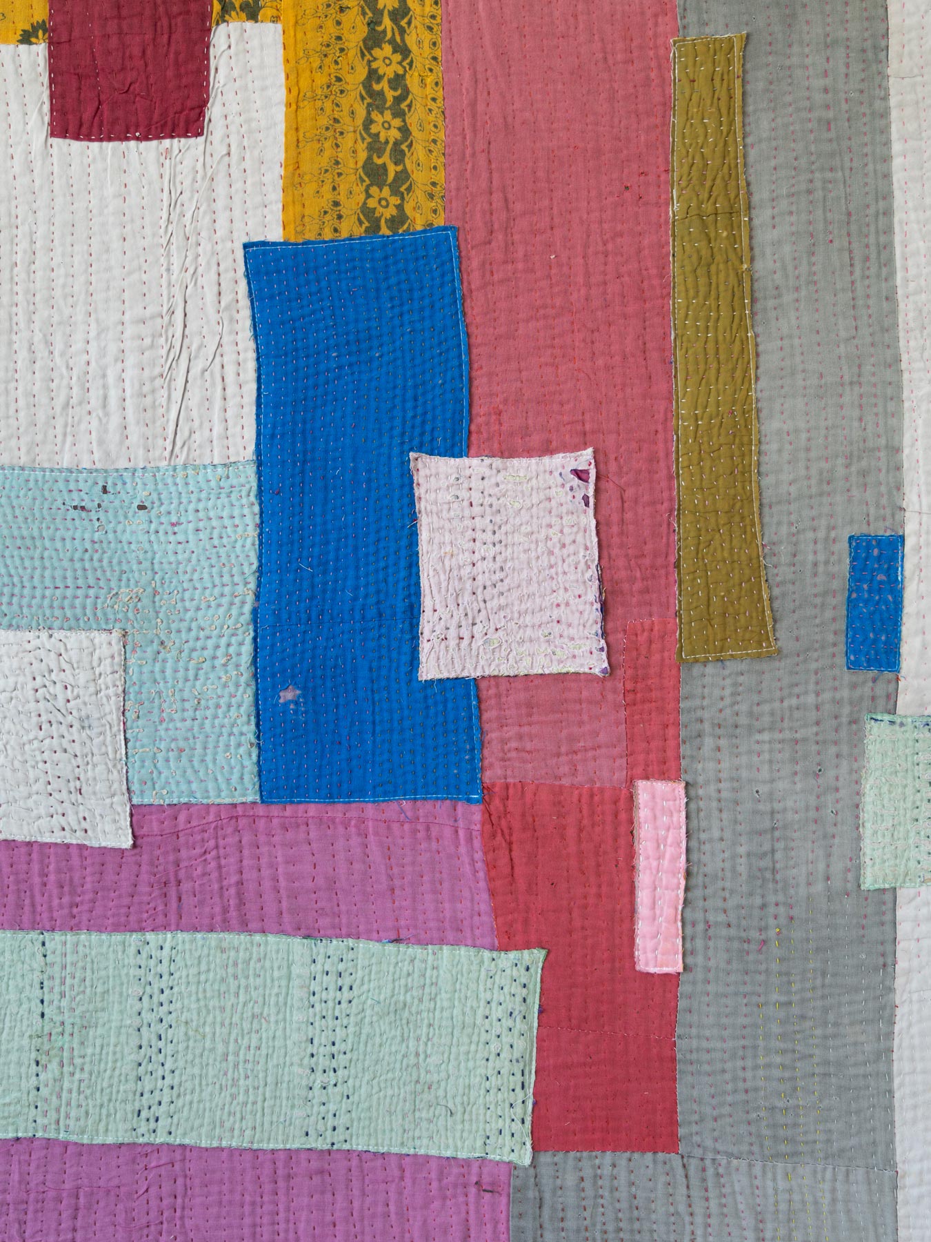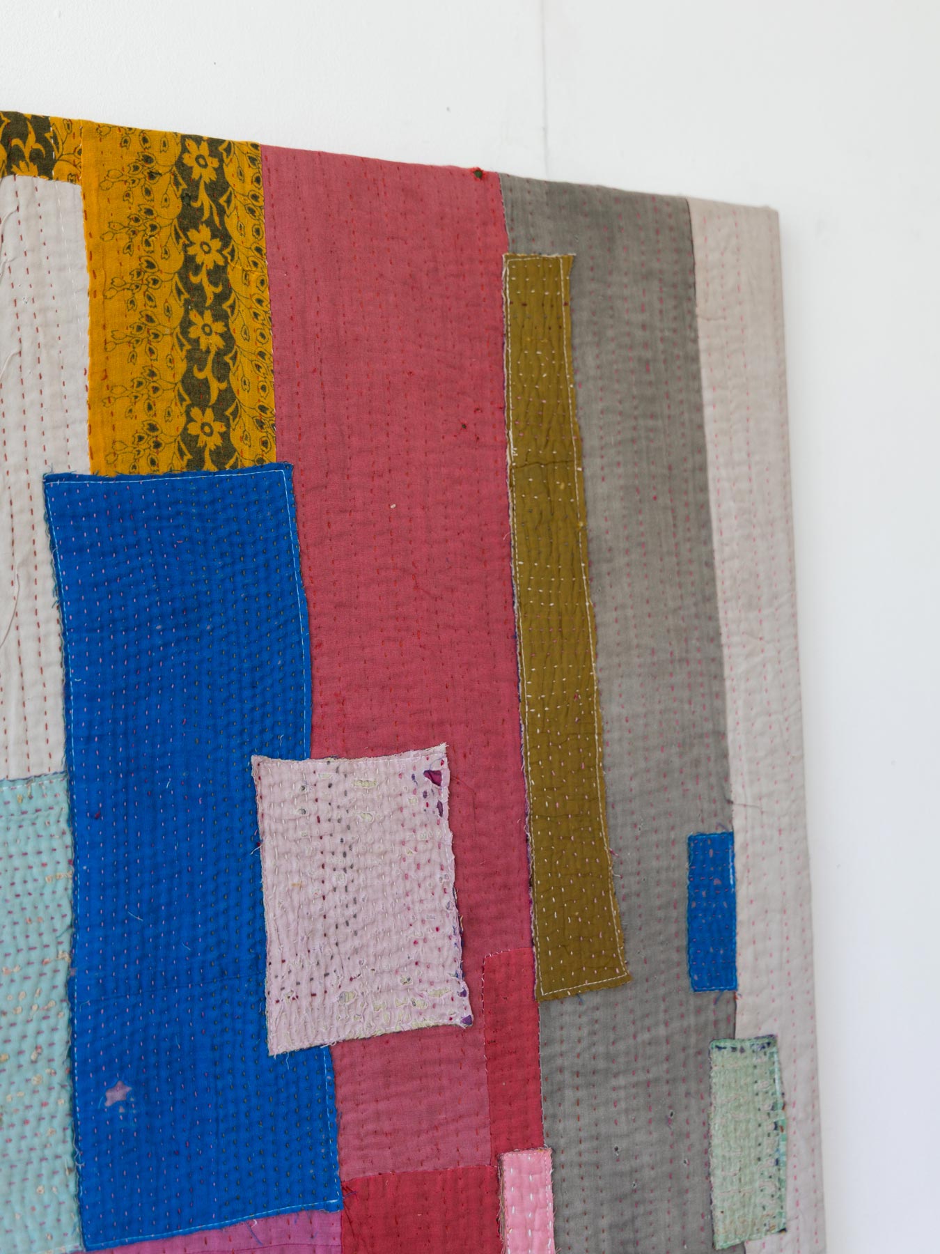 カンタとはインドのベンガル地方を中心に伝わる刺子刺繍のこと。古い布を合わせてひと針ひと針、手仕事で刺し子が施されています。布の補強と装飾を兼ねたカンタ刺繍により、魅力的なファブリックに生まれ変わっています。