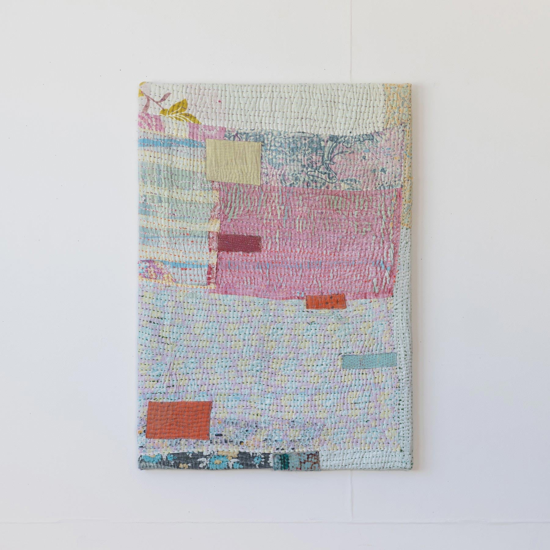ヴィンテージの大判のカンタカバーは、全体の色合いが美しいものでも、部分的に穴やダメージがあることがよくあります。そこで、特に気に入った部分だけを切り取り、パネルに仕立てて、いつでも眺めらたらいいなと思いました。