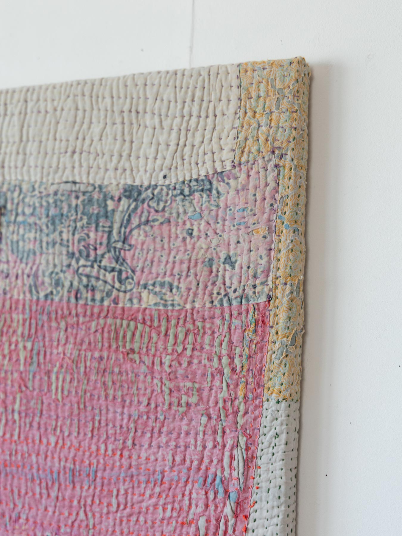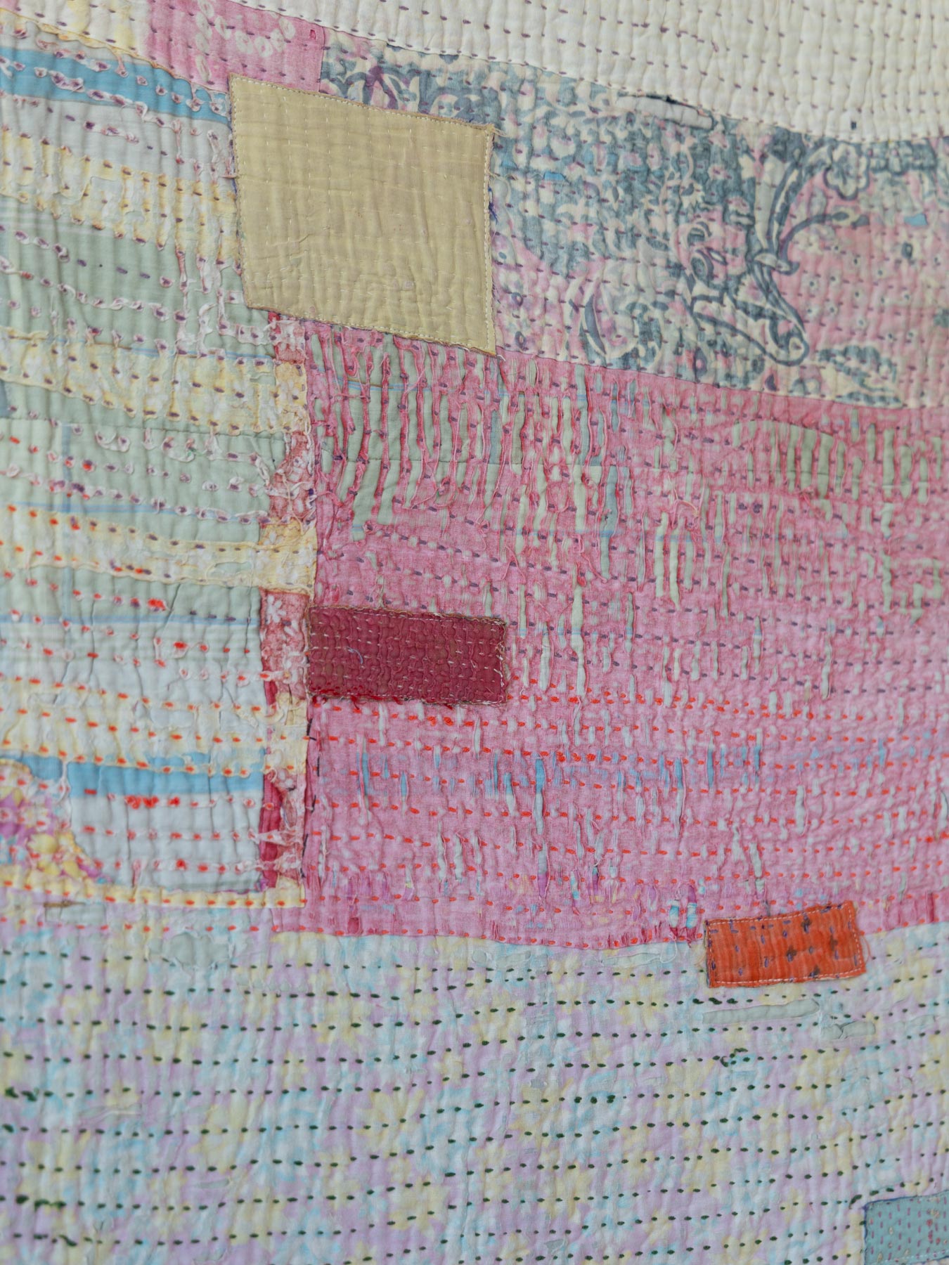 カンタとはインドのベンガル地方を中心に伝わる刺子刺繍のこと。古い布を合わせてひと針ひと針、手仕事で刺し子が施されています。布の補強と装飾を兼ねたカンタ刺繍により、魅力的なファブリックに生まれ変わっています。