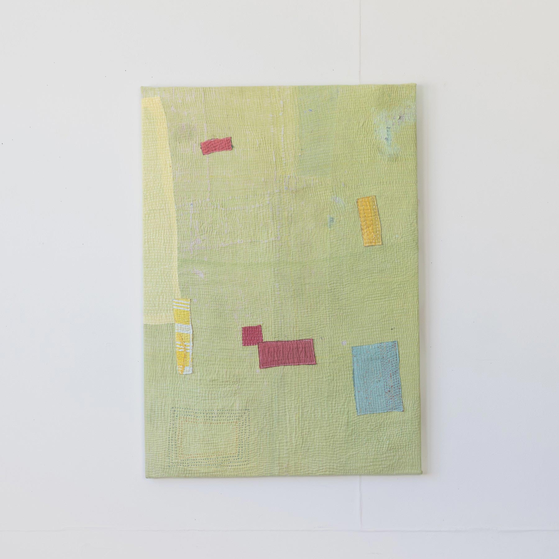 ヴィンテージの大判のカンタカバーは、全体の色合いが美しいものでも、部分的に穴やダメージがあることがよくあります。そこで、特に気に入った部分だけを切り取り、パネルに仕立てて、いつでも眺めらたらいいなと思いました。