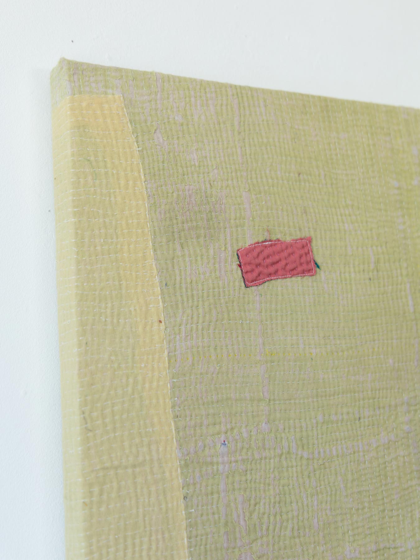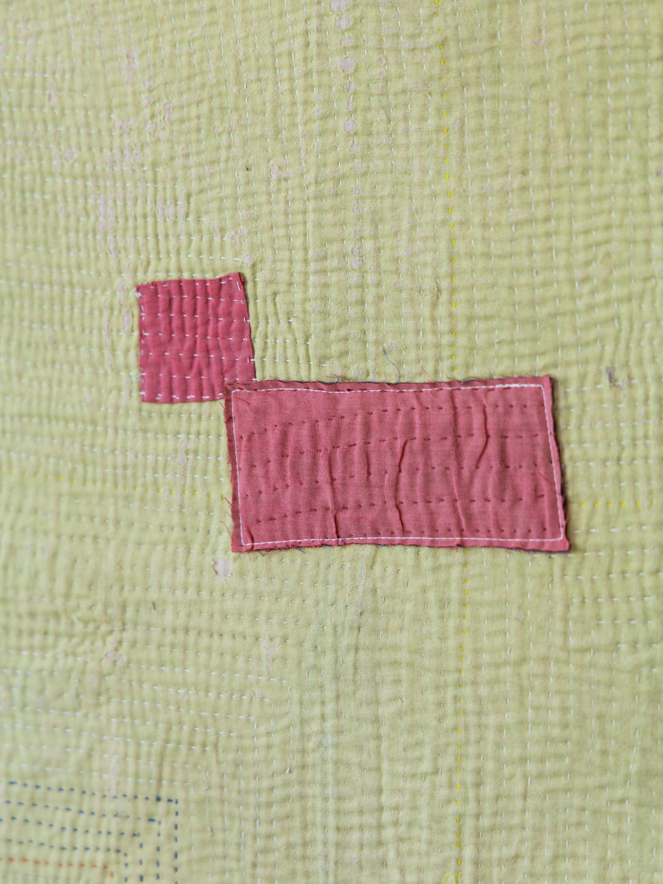 カンタとはインドのベンガル地方を中心に伝わる刺子刺繍のこと。古い布を合わせてひと針ひと針、手仕事で刺し子が施されています。布の補強と装飾を兼ねたカンタ刺繍により、魅力的なファブリックに生まれ変わっています。