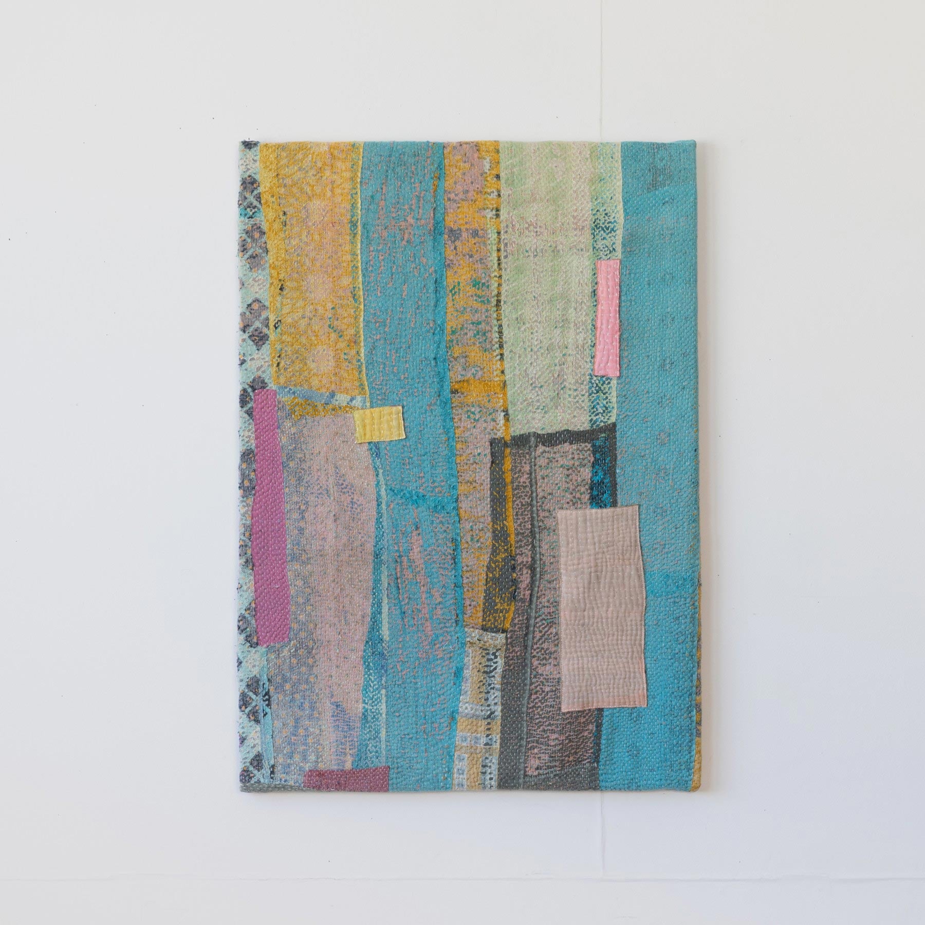 ヴィンテージの大判のカンタカバーは、全体の色合いが美しいものでも、部分的に穴やダメージがあることがよくあります。そこで、特に気に入った部分だけを切り取り、パネルに仕立てて、いつでも眺めらたらいいなと思いました。