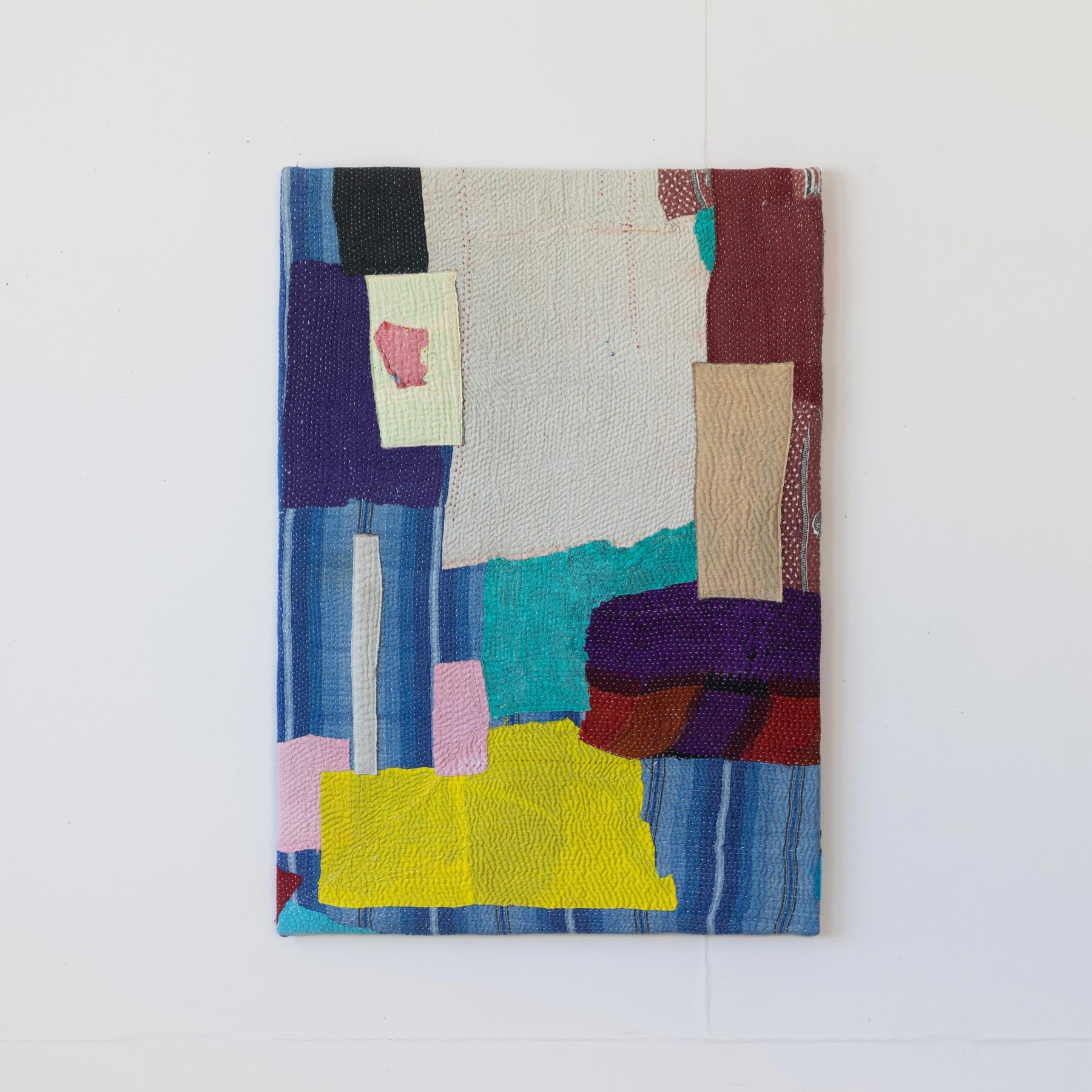 ヴィンテージの大判のカンタカバーは、全体の色合いが美しいものでも、部分的に穴やダメージがあることがよくあります。そこで、特に気に入った部分だけを切り取り、パネルに仕立てて、いつでも眺めらたらいいなと思いました。