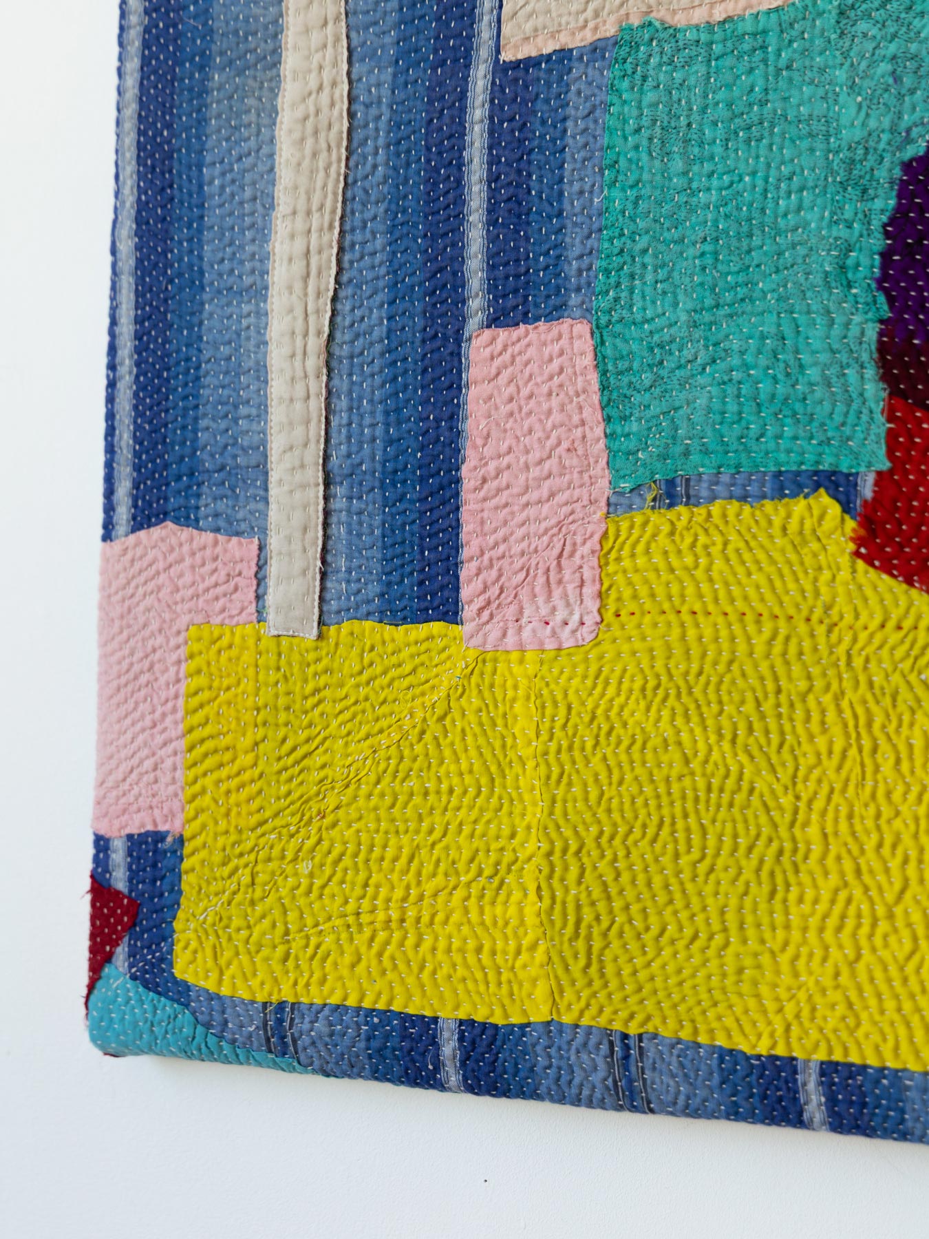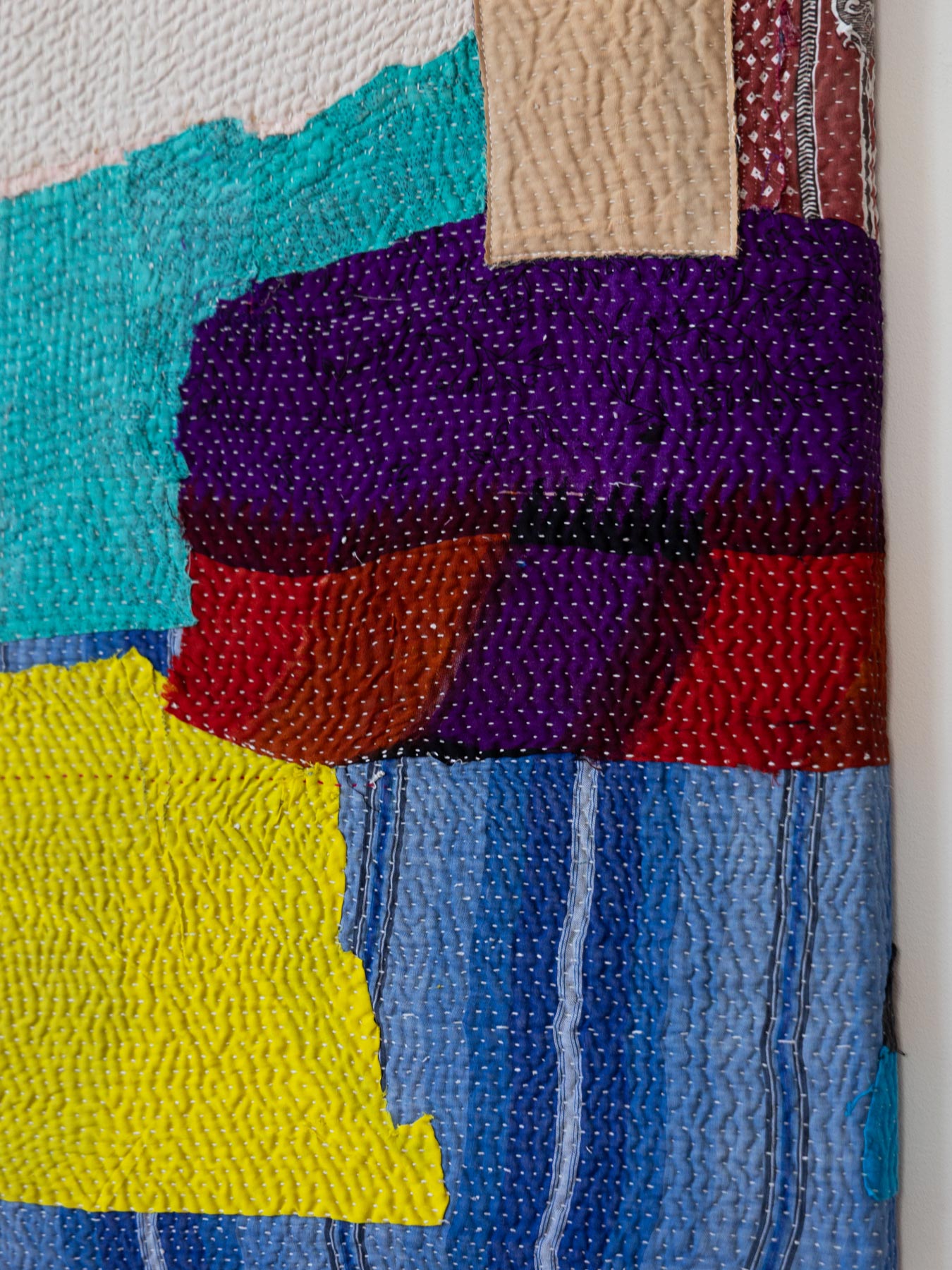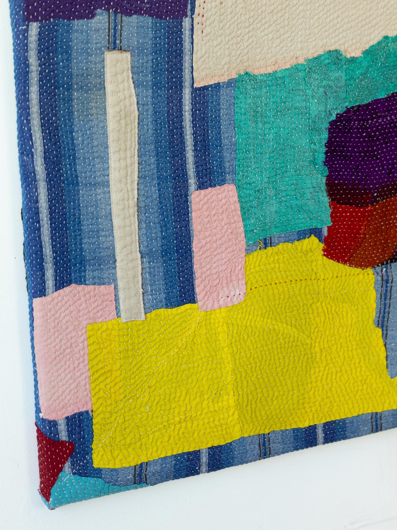 カンタとはインドのベンガル地方を中心に伝わる刺子刺繍のこと。古い布を合わせてひと針ひと針、手仕事で刺し子が施されています。布の補強と装飾を兼ねたカンタ刺繍により、魅力的なファブリックに生まれ変わっています。