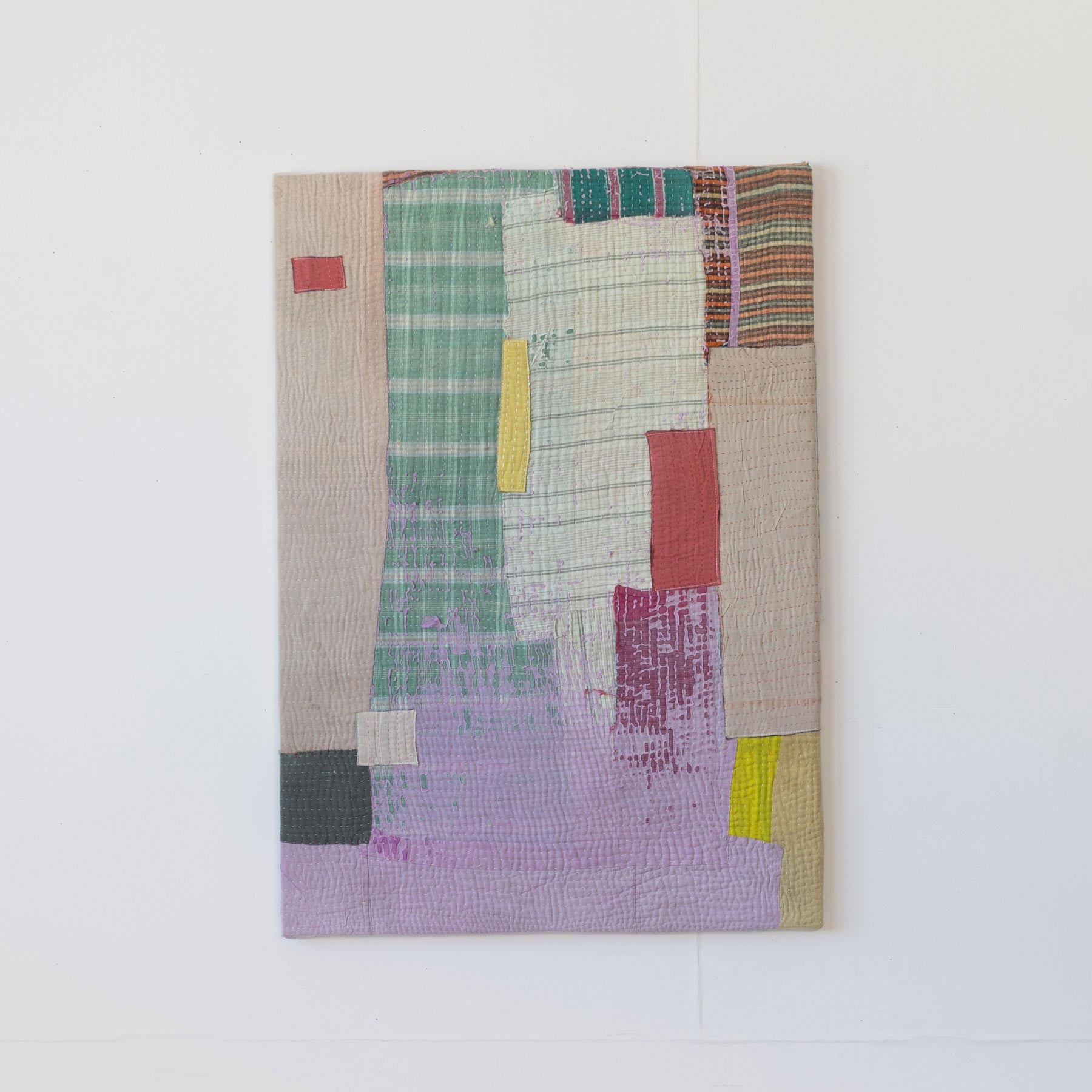 ヴィンテージの大判のカンタカバーは、全体の色合いが美しいものでも、部分的に穴やダメージがあることがよくあります。そこで、特に気に入った部分だけを切り取り、パネルに仕立てて、いつでも眺めらたらいいなと思いました。