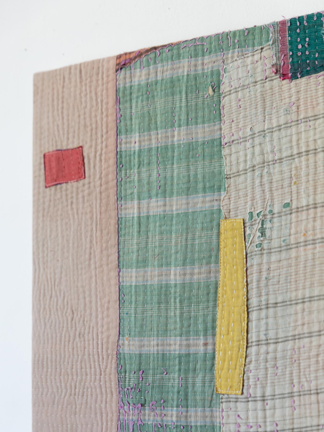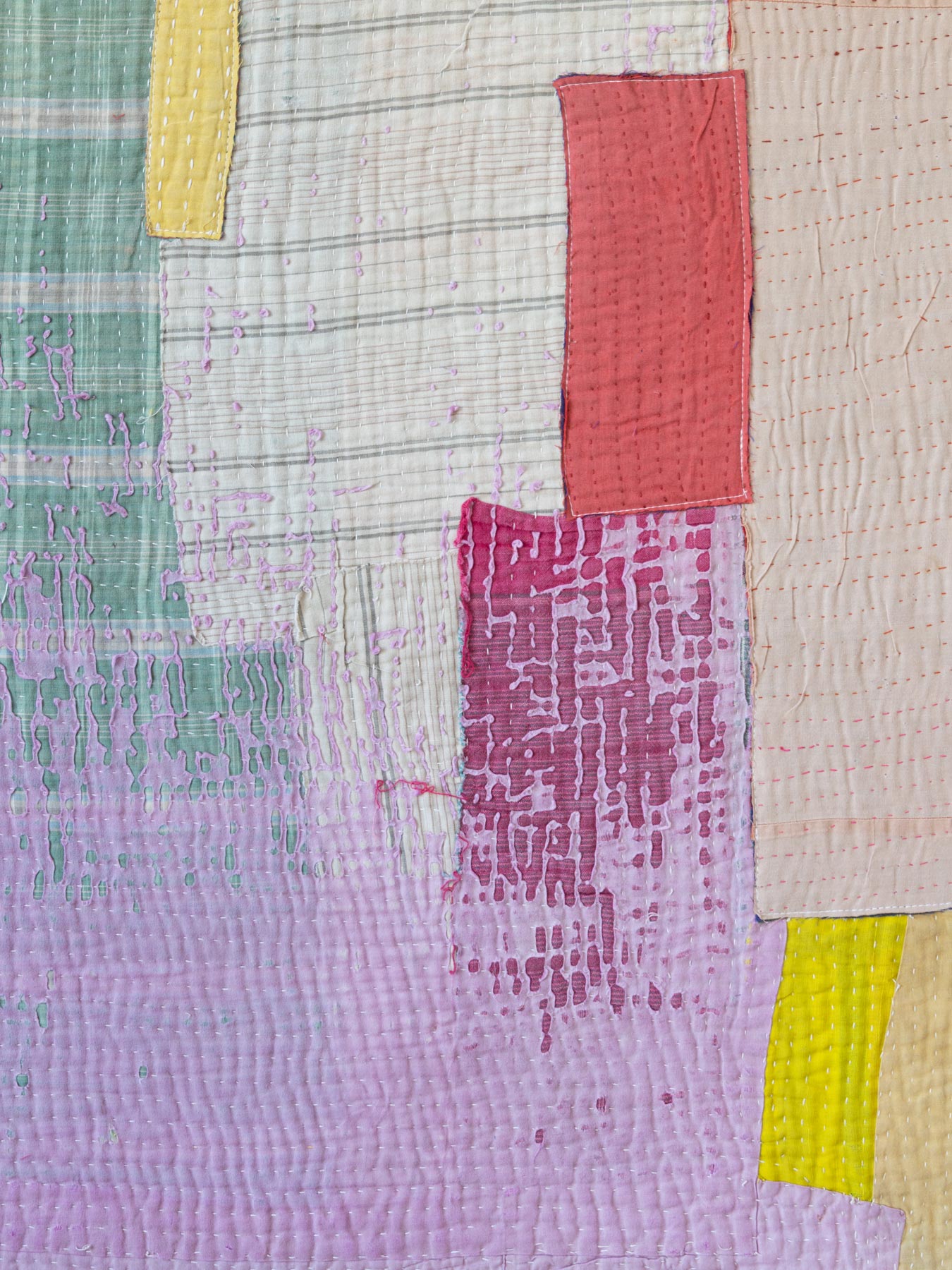カンタとはインドのベンガル地方を中心に伝わる刺子刺繍のこと。古い布を合わせてひと針ひと針、手仕事で刺し子が施されています。布の補強と装飾を兼ねたカンタ刺繍により、魅力的なファブリックに生まれ変わっています。