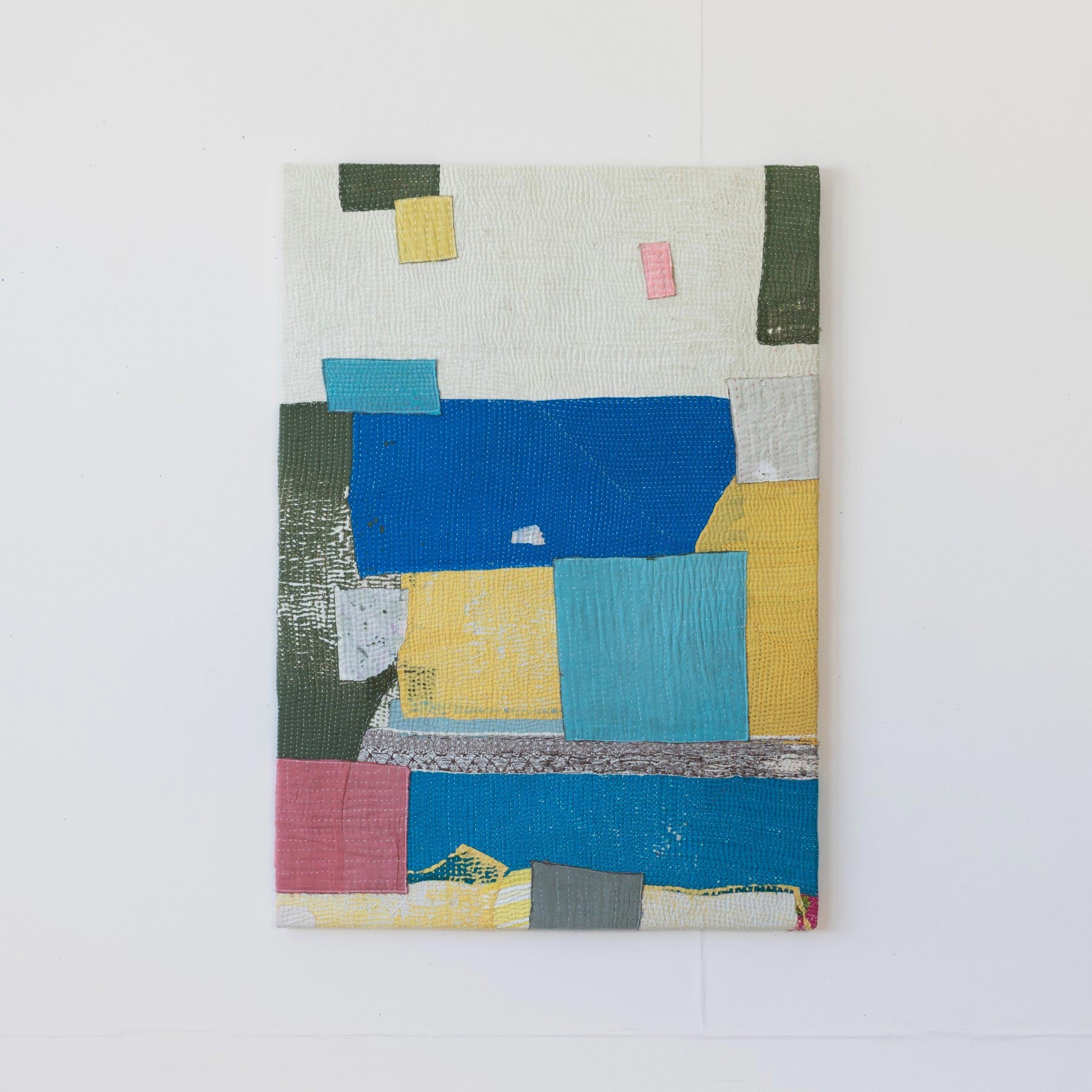 ヴィンテージの大判のカンタカバーは、全体の色合いが美しいものでも、部分的に穴やダメージがあることがよくあります。そこで、特に気に入った部分だけを切り取り、パネルに仕立てて、いつでも眺めらたらいいなと思いました。