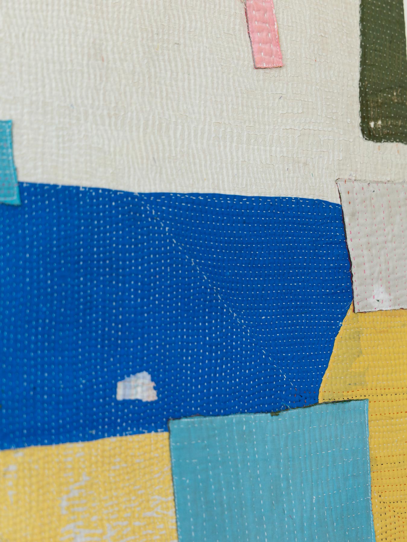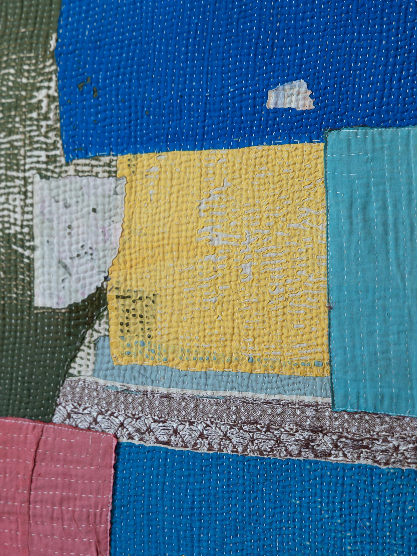 カンタとはインドのベンガル地方を中心に伝わる刺子刺繍のこと。古い布を合わせてひと針ひと針、手仕事で刺し子が施されています。布の補強と装飾を兼ねたカンタ刺繍により、魅力的なファブリックに生まれ変わっています。