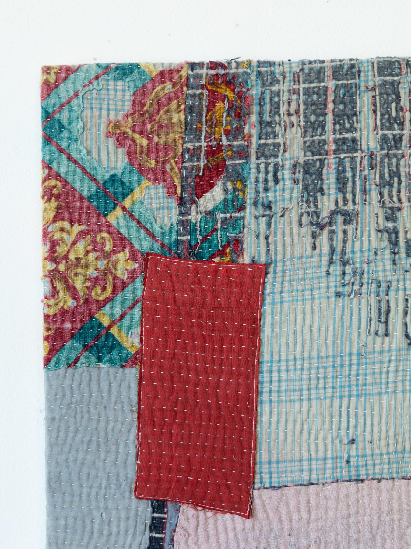 カンタとはインドのベンガル地方を中心に伝わる刺子刺繍のこと。古い布を合わせてひと針ひと針、手仕事で刺し子が施されています。布の補強と装飾を兼ねたカンタ刺繍により、魅力的なファブリックに生まれ変わっています。