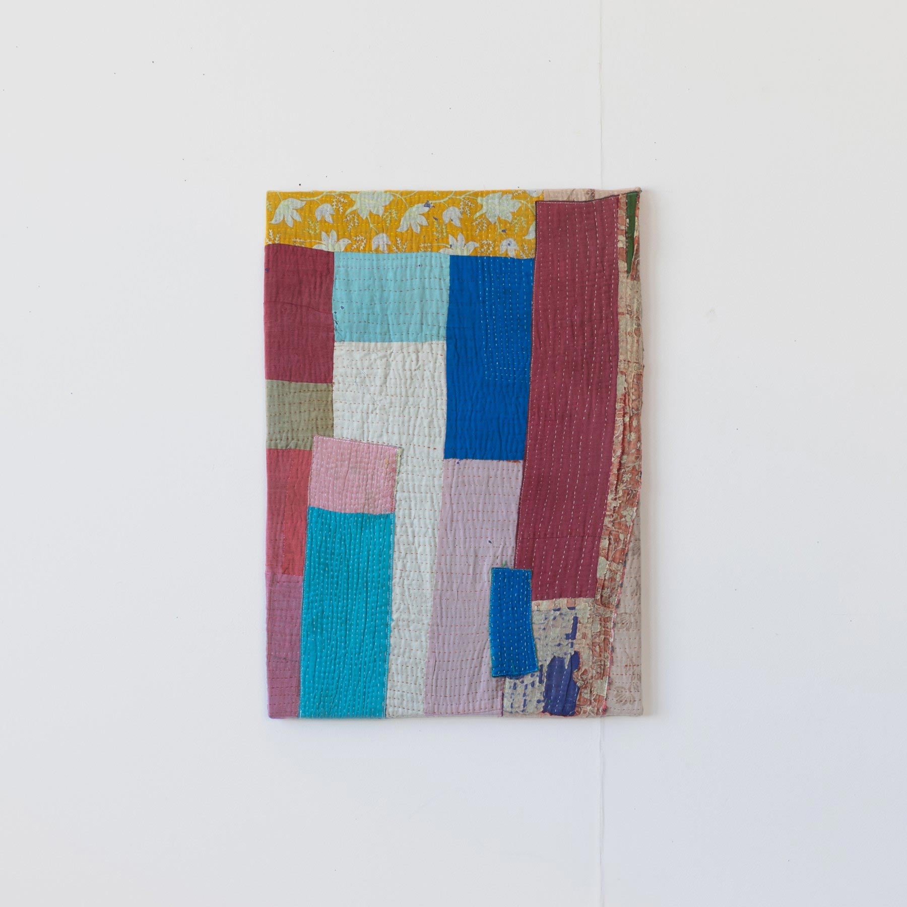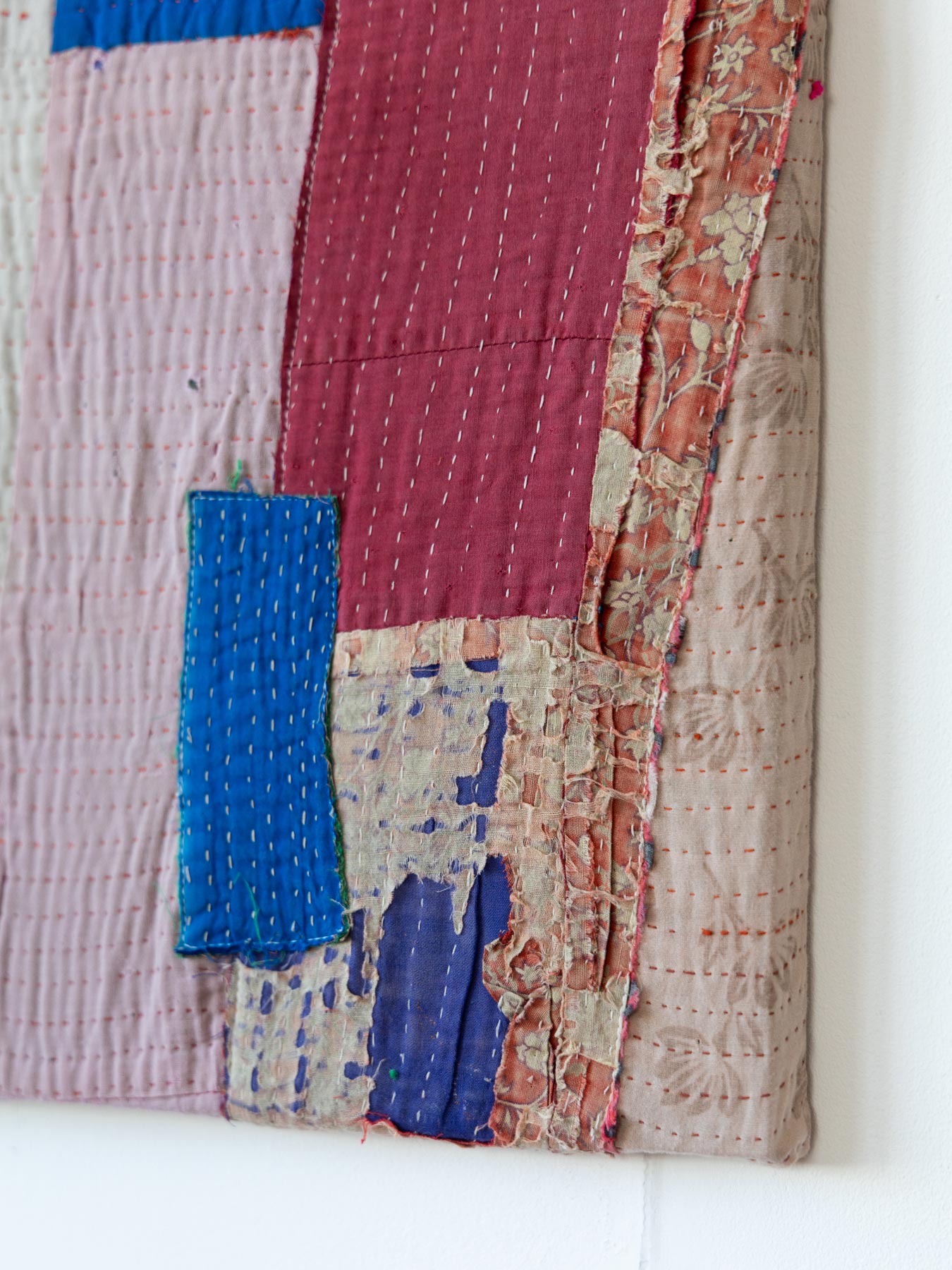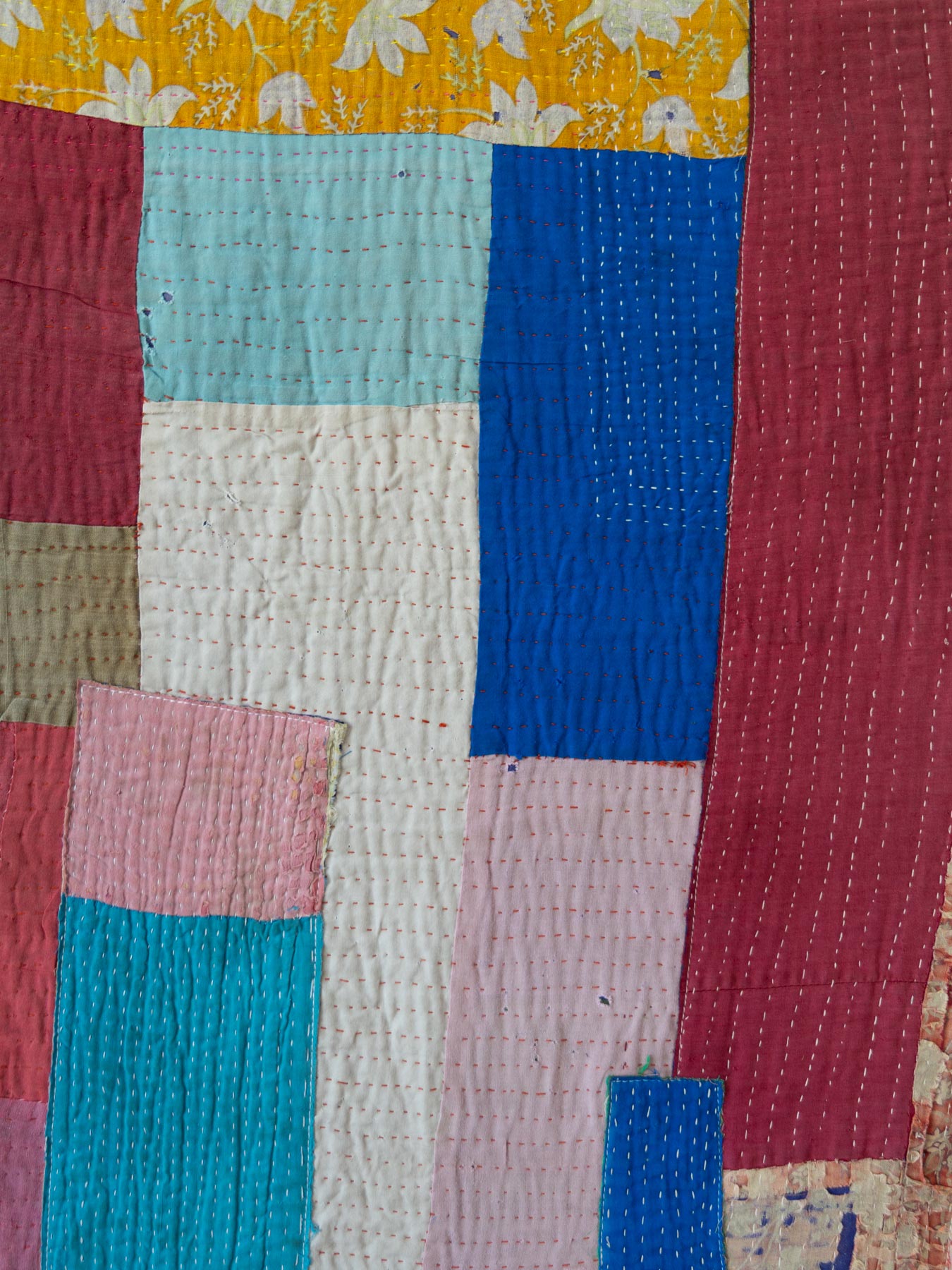 カンタとはインドのベンガル地方を中心に伝わる刺子刺繍のこと。古い布を合わせてひと針ひと針、手仕事で刺し子が施されています。布の補強と装飾を兼ねたカンタ刺繍により、魅力的なファブリックに生まれ変わっています。