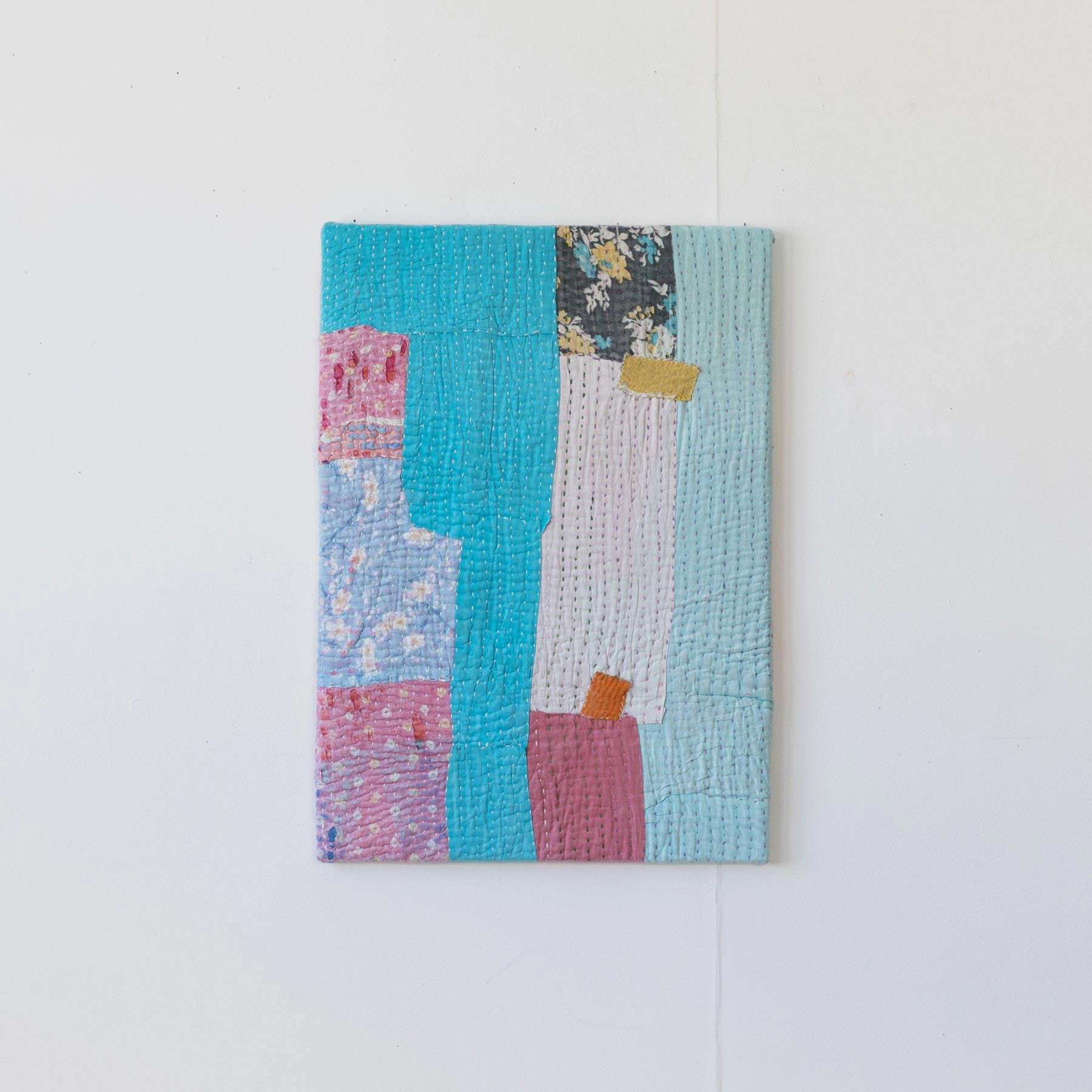 ヴィンテージの大判のカンタカバーは、全体の色合いが美しいものでも、部分的に穴やダメージがあることがよくあります。そこで、特に気に入った部分だけを切り取り、パネルに仕立てて、いつでも眺めらたらいいなと思いました。
