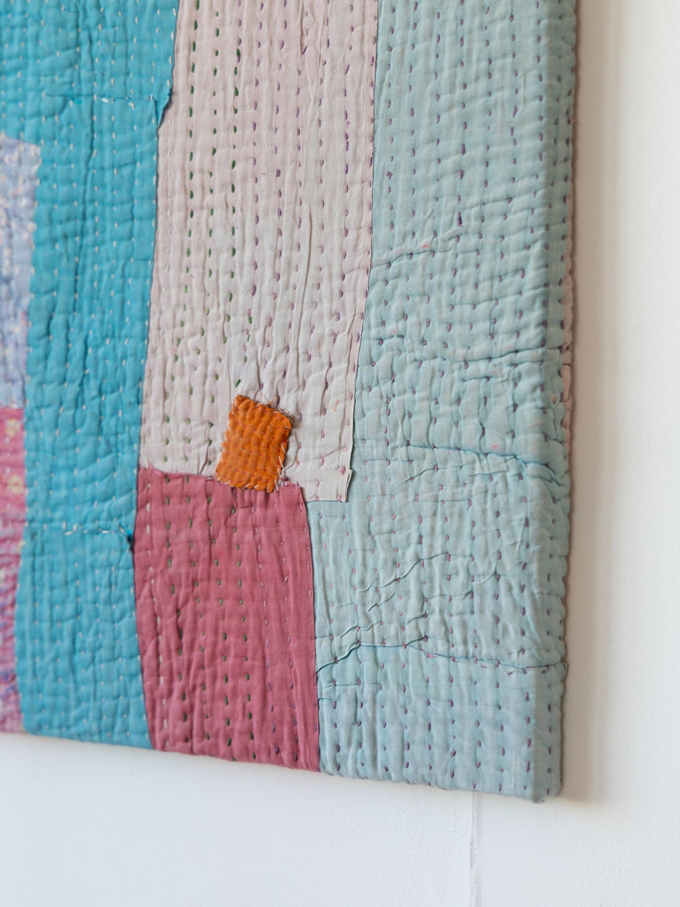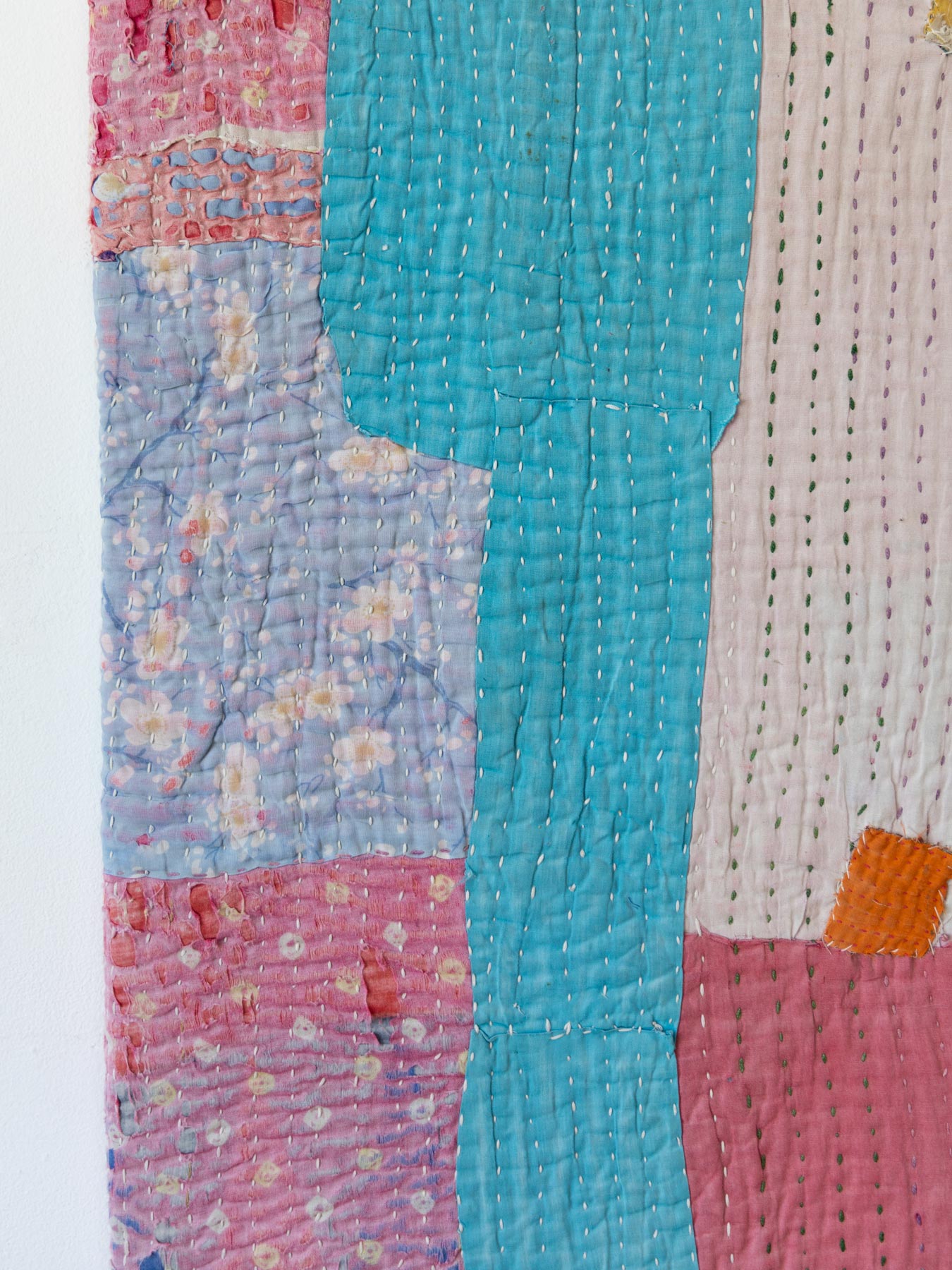 カンタとはインドのベンガル地方を中心に伝わる刺子刺繍のこと。古い布を合わせてひと針ひと針、手仕事で刺し子が施されています。布の補強と装飾を兼ねたカンタ刺繍により、魅力的なファブリックに生まれ変わっています。