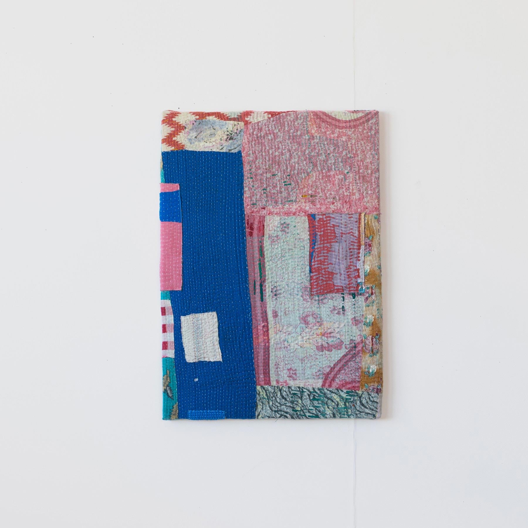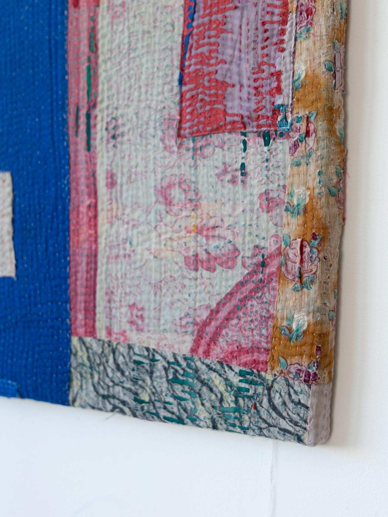 ヴィンテージの大判のカンタカバーは、全体の色合いが美しいものでも、部分的に穴やダメージがあることがよくあります。そこで、特に気に入った部分だけを切り取り、パネルに仕立てて、いつでも眺めらたらいいなと思いました。