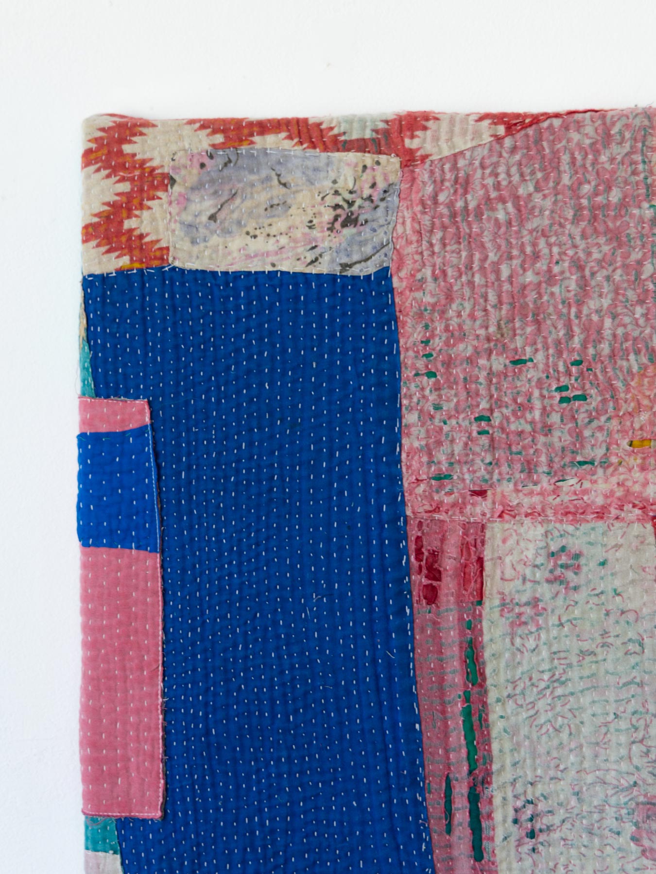 カンタとはインドのベンガル地方を中心に伝わる刺子刺繍のこと。古い布を合わせてひと針ひと針、手仕事で刺し子が施されています。布の補強と装飾を兼ねたカンタ刺繍により、魅力的なファブリックに生まれ変わっています。