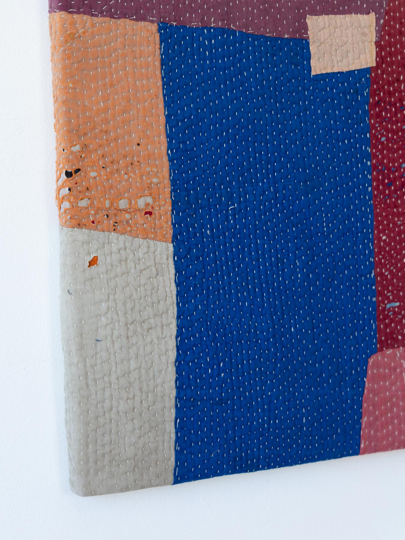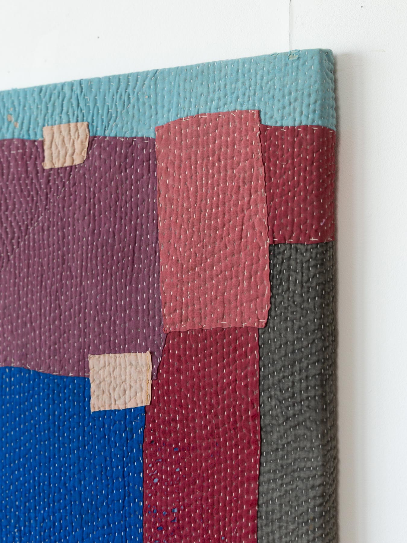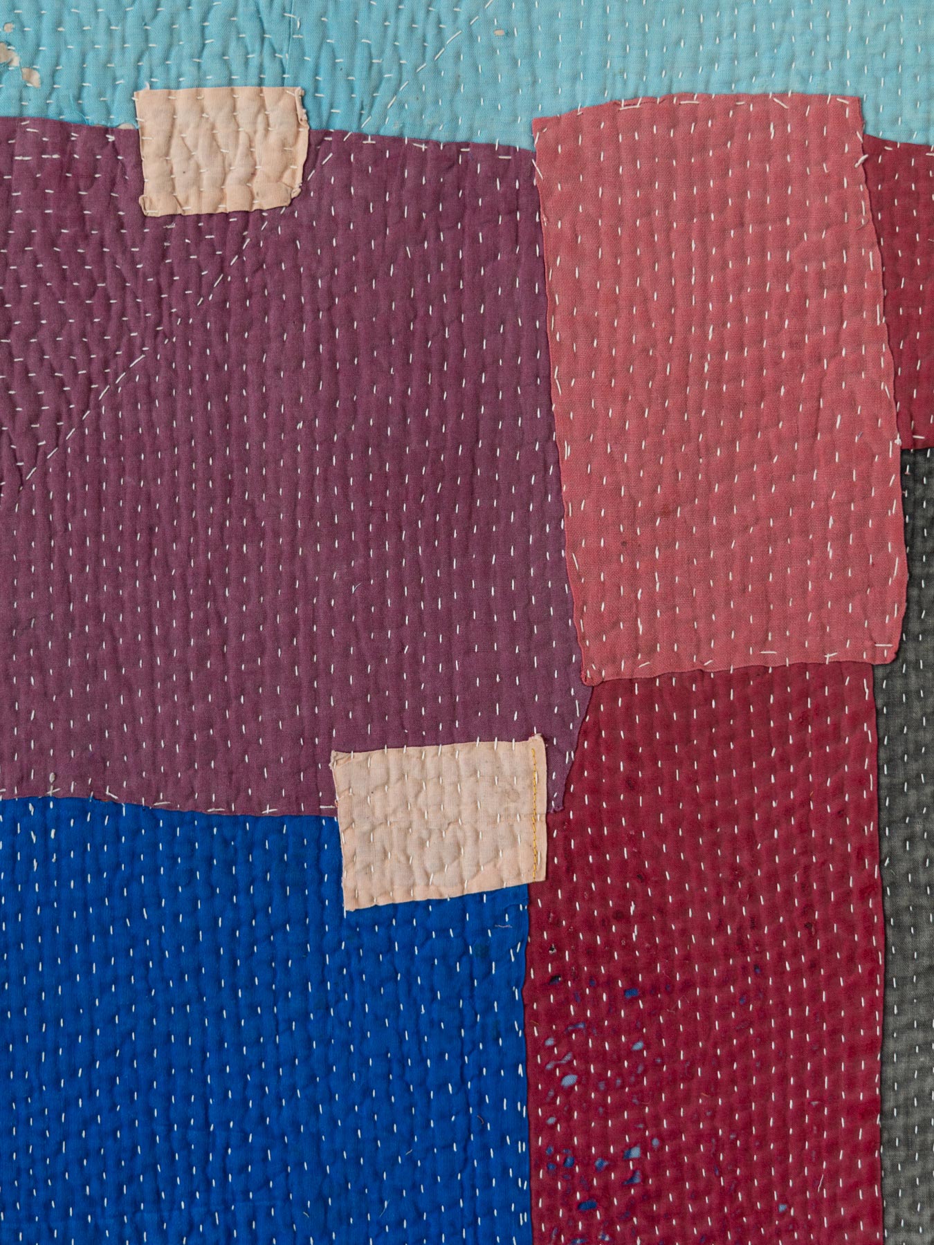 カンタとはインドのベンガル地方を中心に伝わる刺子刺繍のこと。古い布を合わせてひと針ひと針、手仕事で刺し子が施されています。布の補強と装飾を兼ねたカンタ刺繍により、魅力的なファブリックに生まれ変わっています。