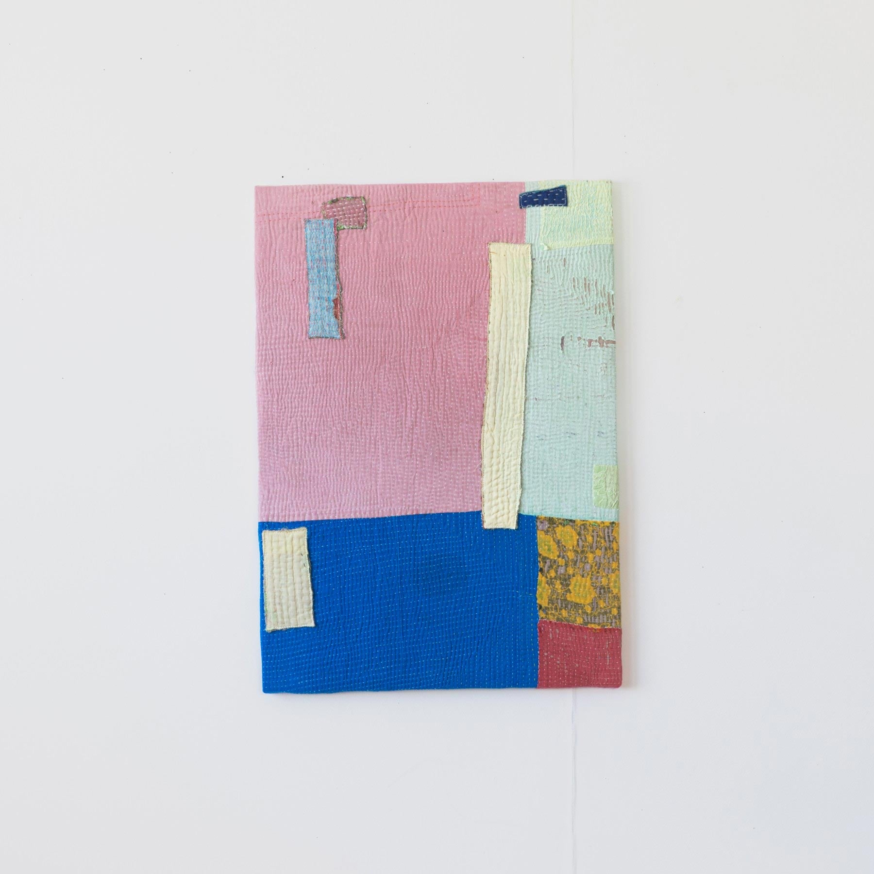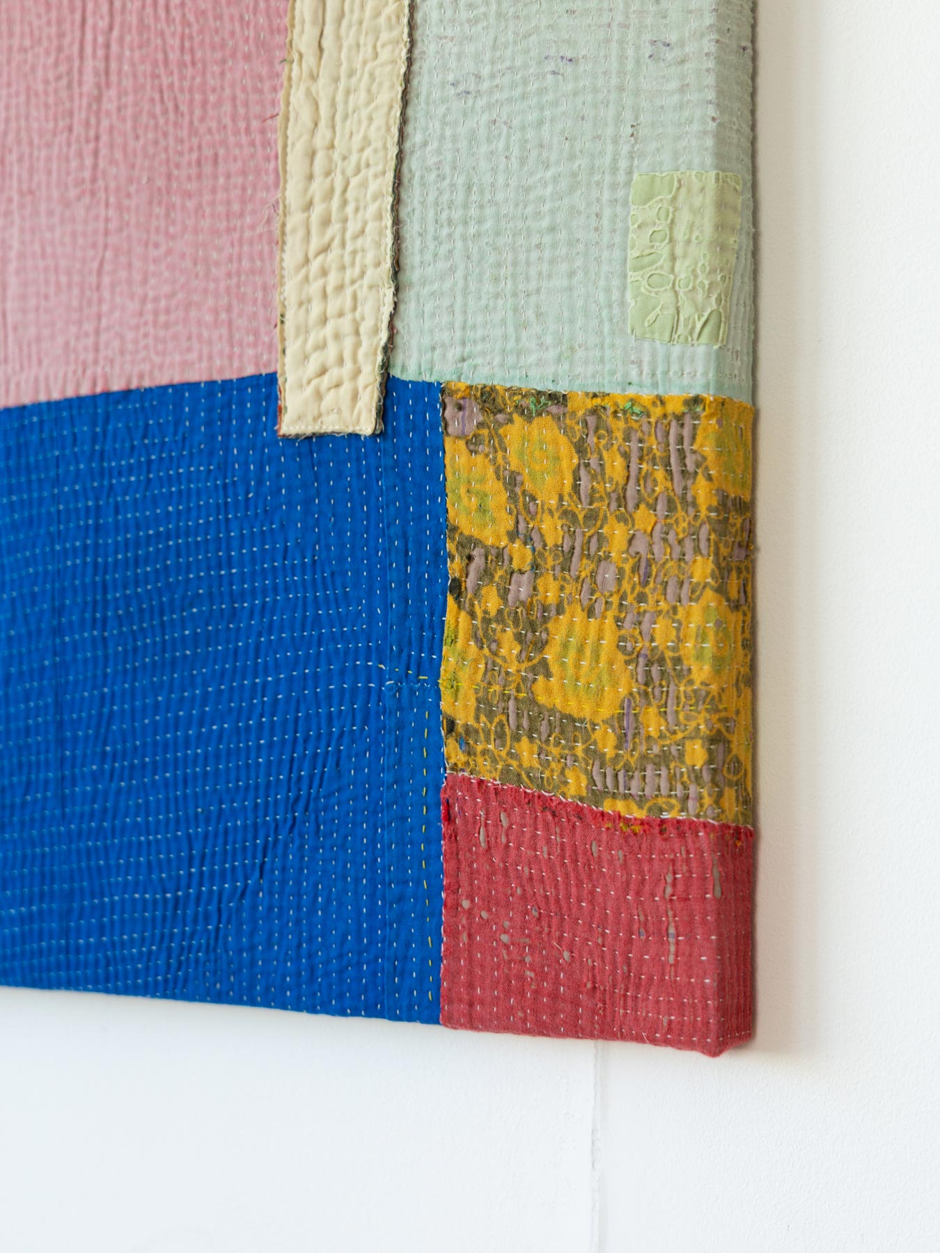 ヴィンテージの大判のカンタカバーは、全体の色合いが美しいものでも、部分的に穴やダメージがあることがよくあります。そこで、特に気に入った部分だけを切り取り、パネルに仕立てて、いつでも眺めらたらいいなと思いました。