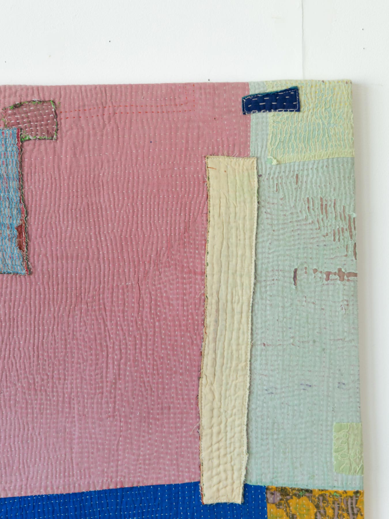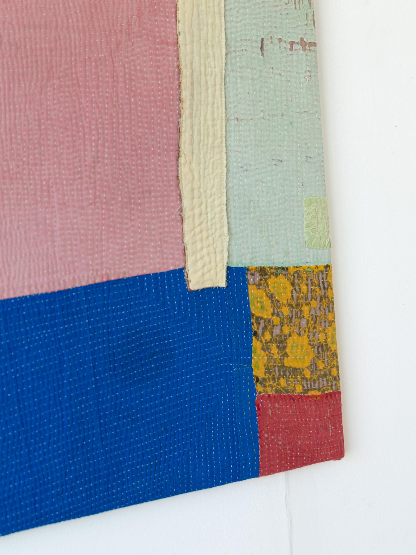 カンタとはインドのベンガル地方を中心に伝わる刺子刺繍のこと。古い布を合わせてひと針ひと針、手仕事で刺し子が施されています。布の補強と装飾を兼ねたカンタ刺繍により、魅力的なファブリックに生まれ変わっています。