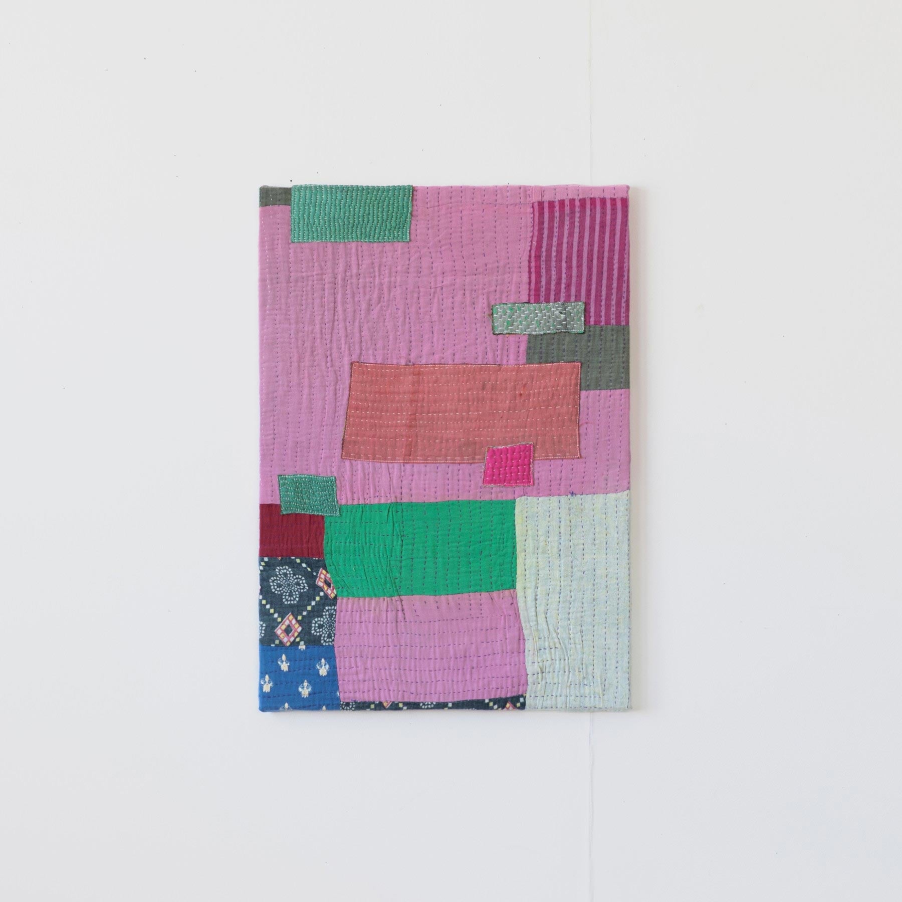 ヴィンテージの大判のカンタカバーは、全体の色合いが美しいものでも、部分的に穴やダメージがあることがよくあります。そこで、特に気に入った部分だけを切り取り、パネルに仕立てて、いつでも眺めらたらいいなと思いました。