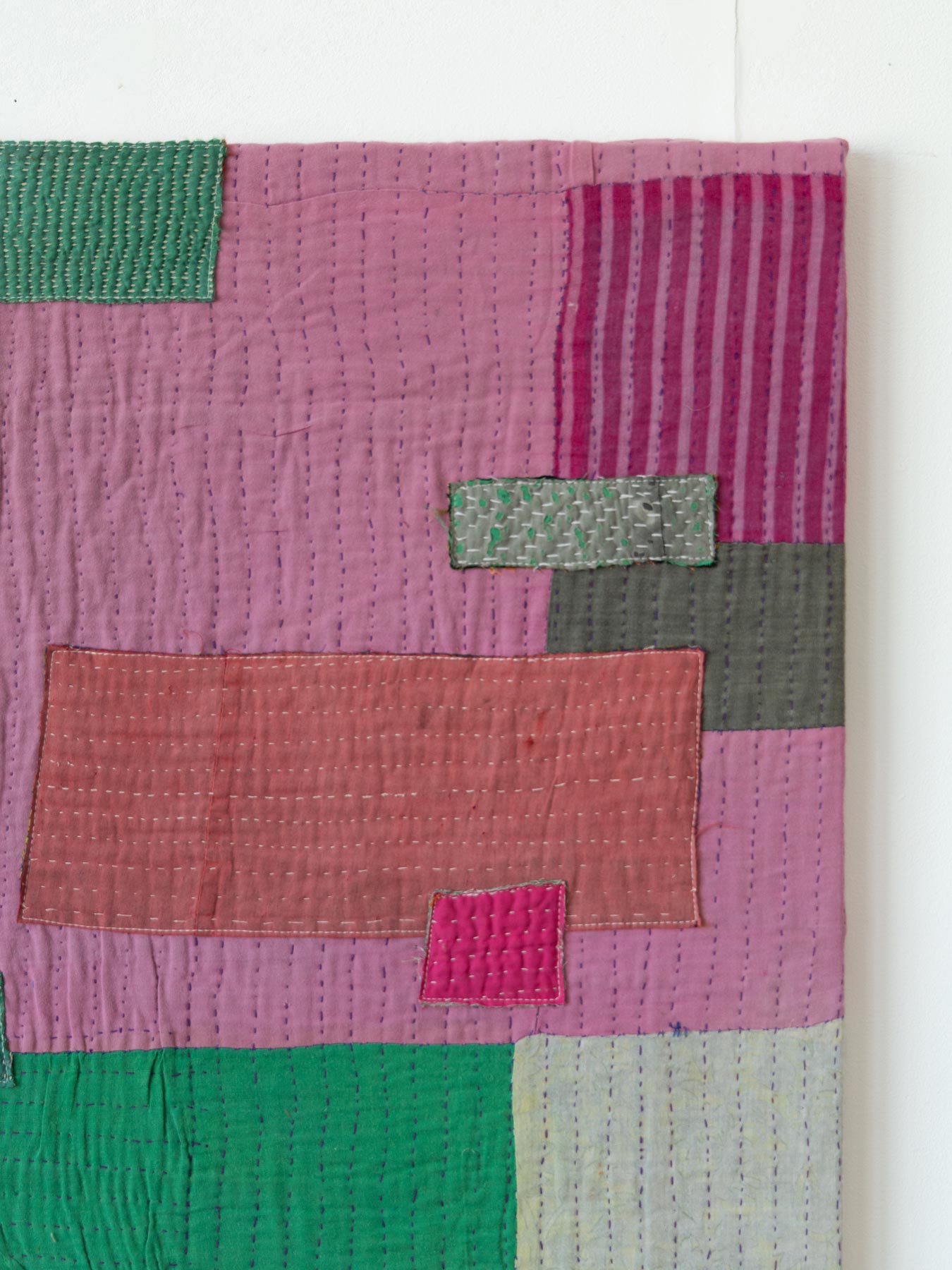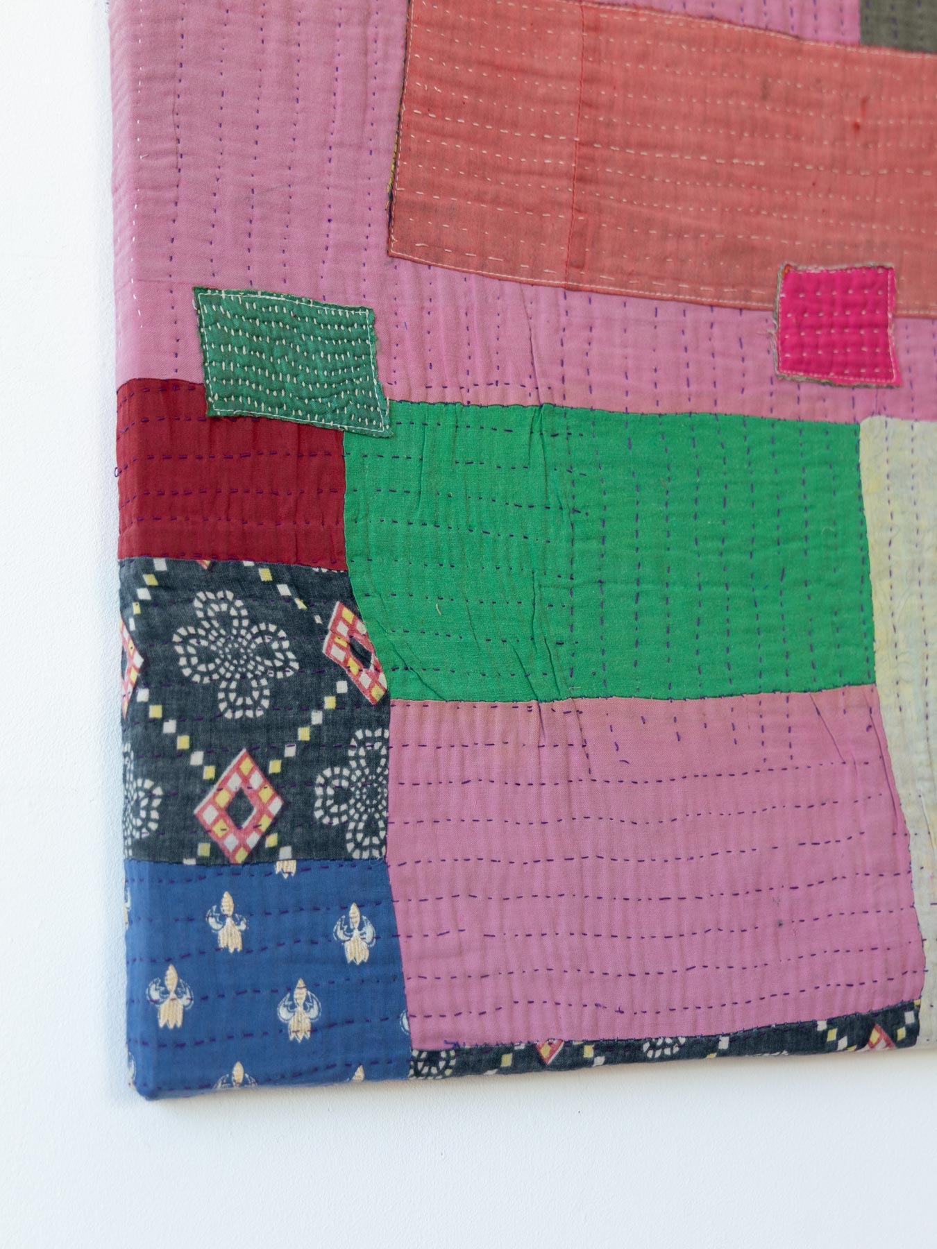 カンタとはインドのベンガル地方を中心に伝わる刺子刺繍のこと。古い布を合わせてひと針ひと針、手仕事で刺し子が施されています。布の補強と装飾を兼ねたカンタ刺繍により、魅力的なファブリックに生まれ変わっています。