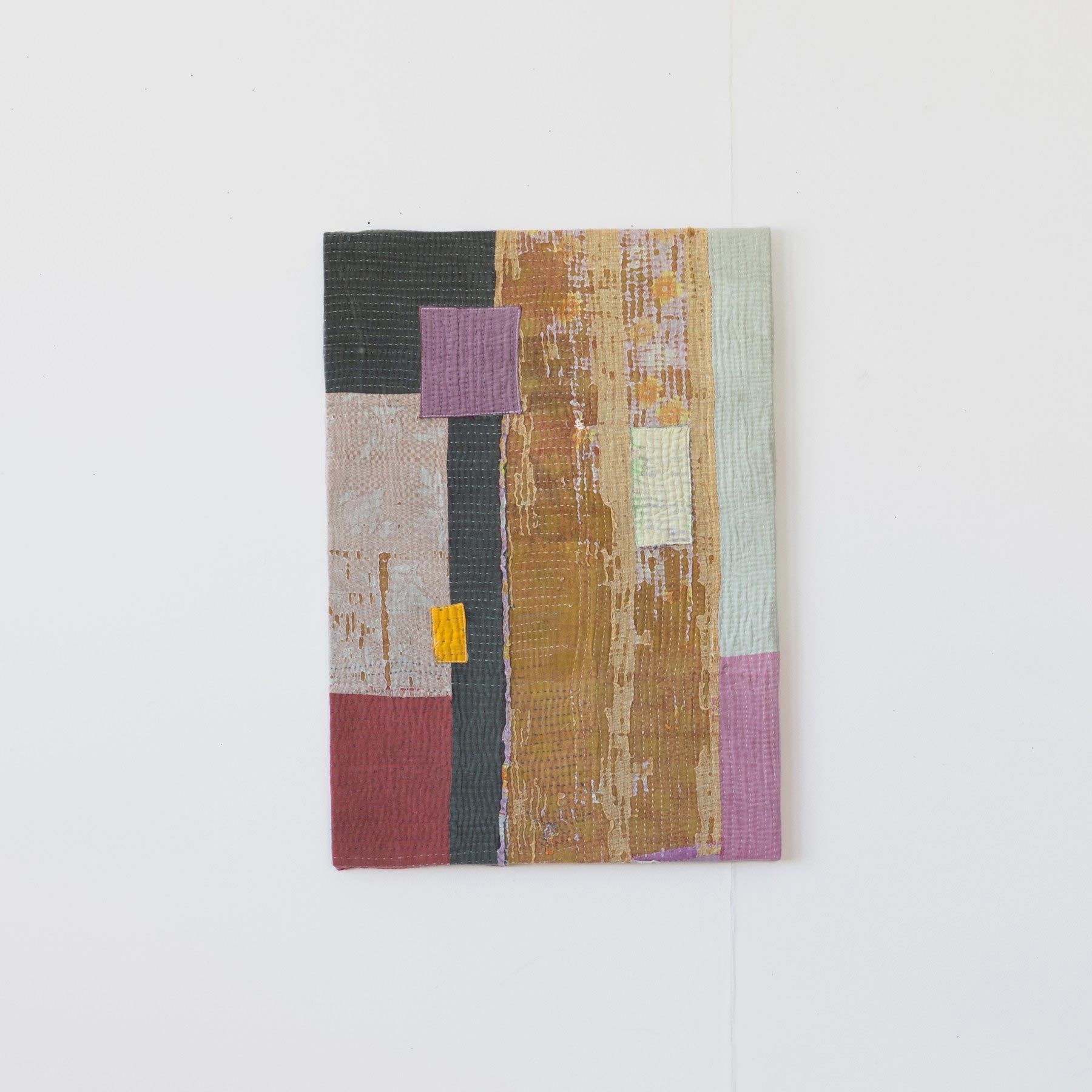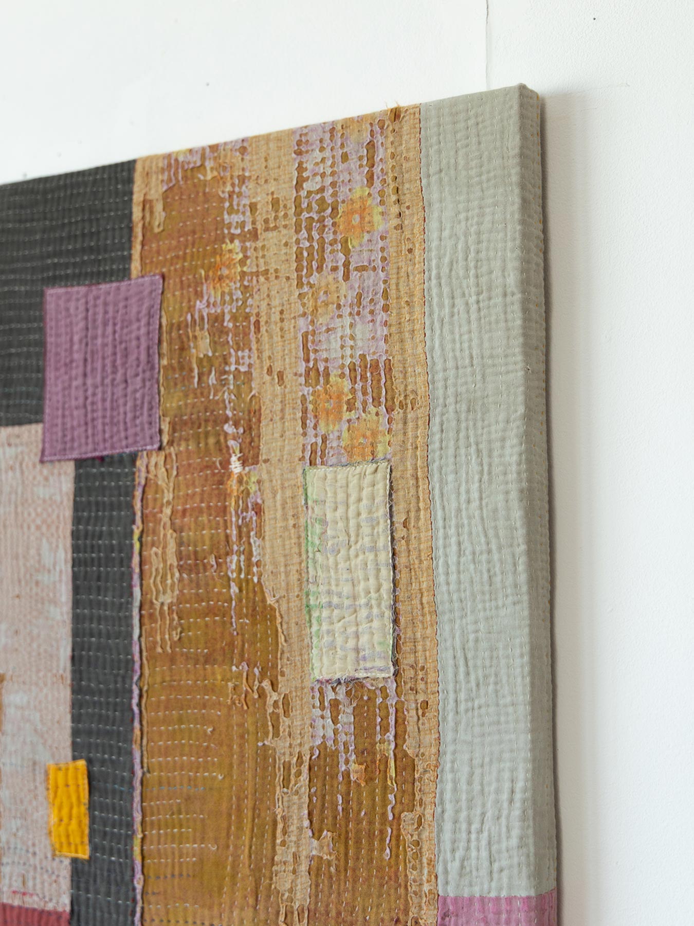 ヴィンテージの大判のカンタカバーは、全体の色合いが美しいものでも、部分的に穴やダメージがあることがよくあります。そこで、特に気に入った部分だけを切り取り、パネルに仕立てて、いつでも眺めらたらいいなと思いました。