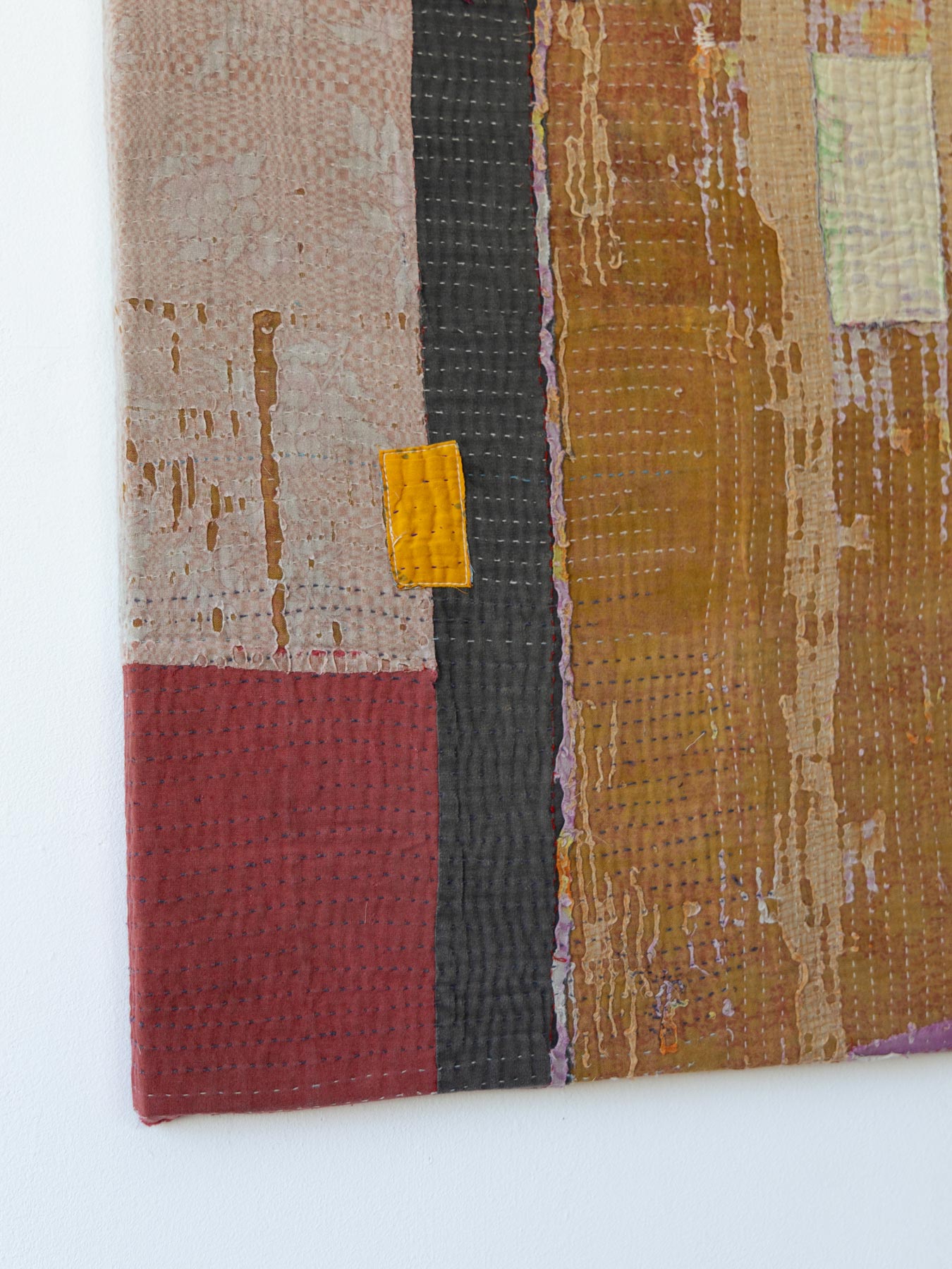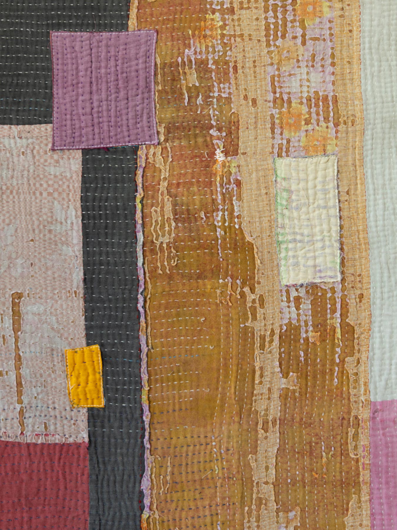 カンタとはインドのベンガル地方を中心に伝わる刺子刺繍のこと。古い布を合わせてひと針ひと針、手仕事で刺し子が施されています。布の補強と装飾を兼ねたカンタ刺繍により、魅力的なファブリックに生まれ変わっています。