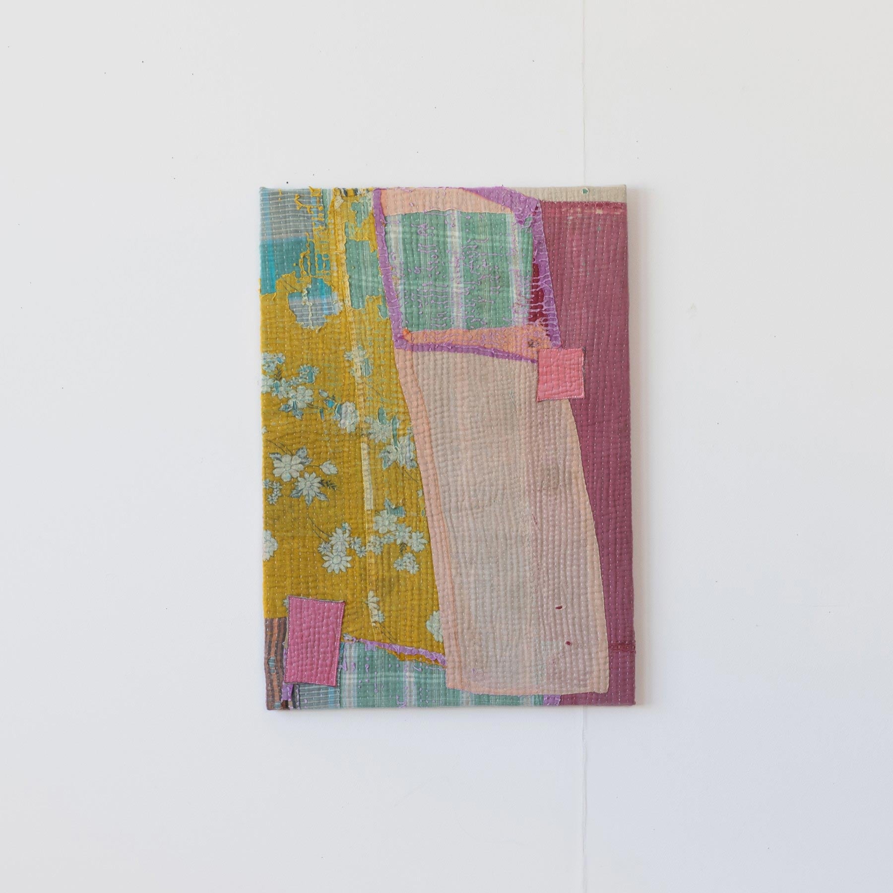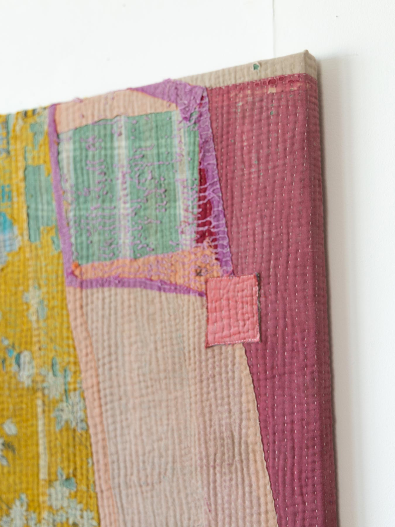 ヴィンテージの大判のカンタカバーは、全体の色合いが美しいものでも、部分的に穴やダメージがあることがよくあります。そこで、特に気に入った部分だけを切り取り、パネルに仕立てて、いつでも眺めらたらいいなと思いました。