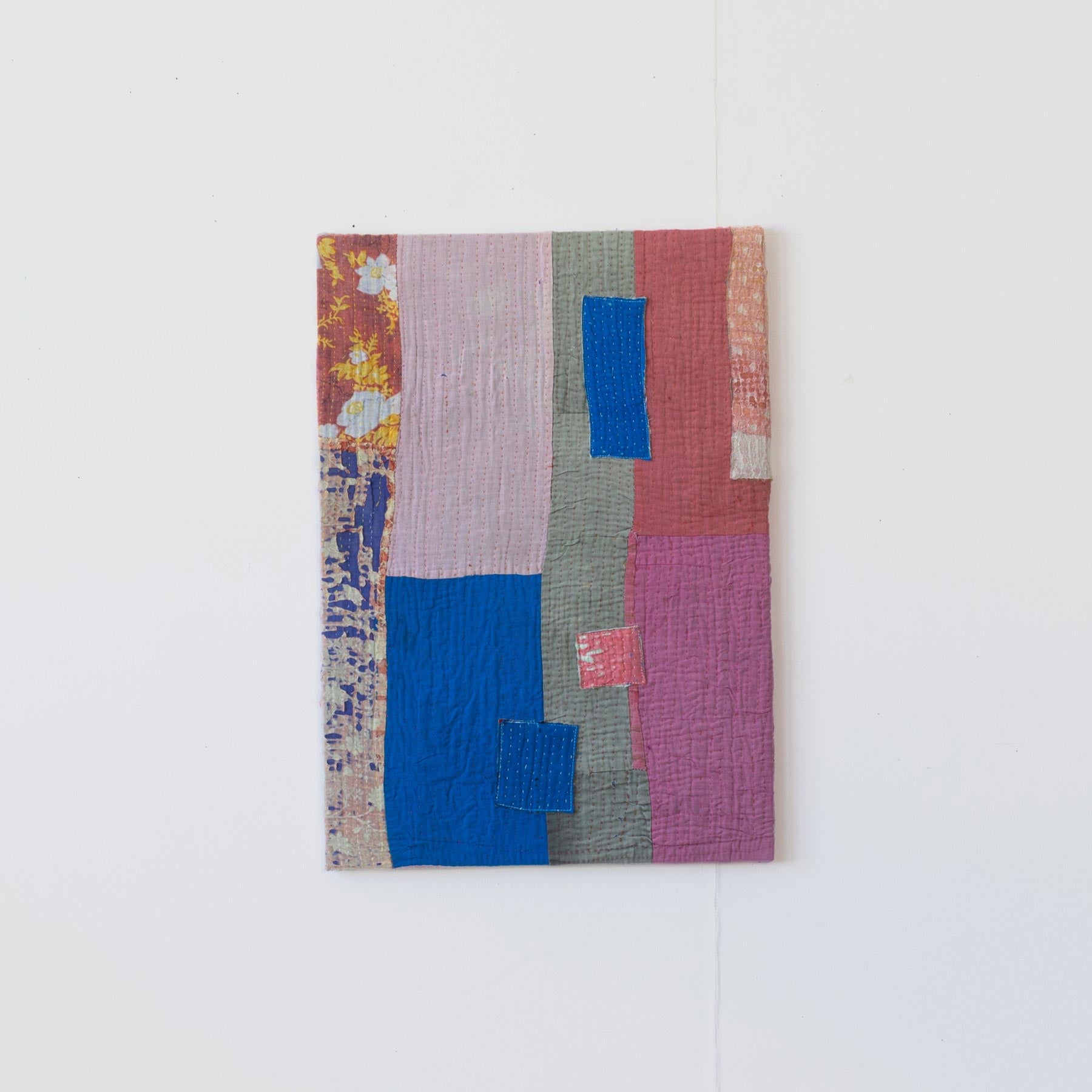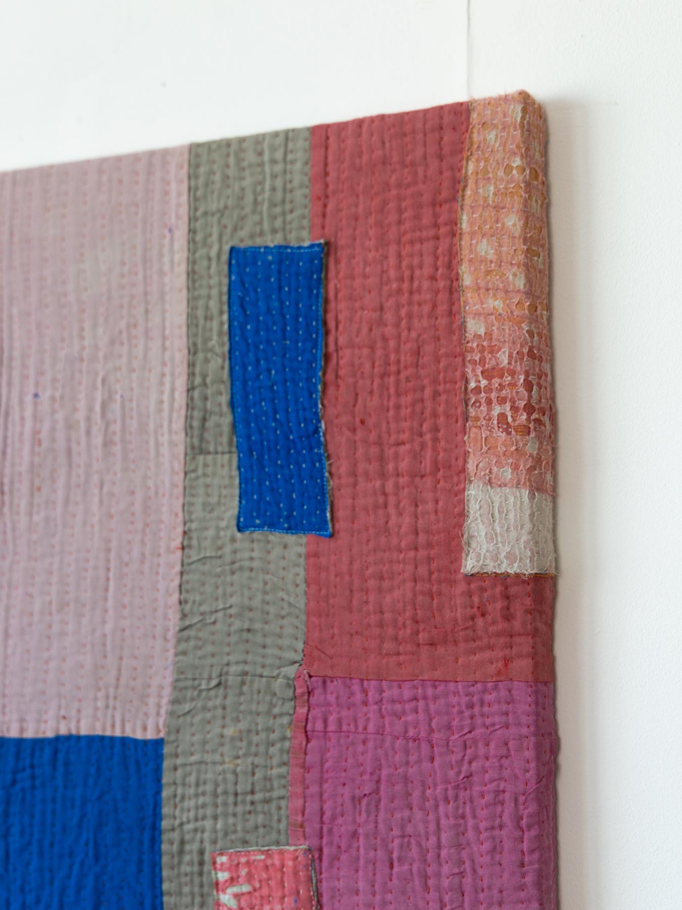 ヴィンテージの大判のカンタカバーは、全体の色合いが美しいものでも、部分的に穴やダメージがあることがよくあります。そこで、特に気に入った部分だけを切り取り、パネルに仕立てて、いつでも眺めらたらいいなと思いました。
