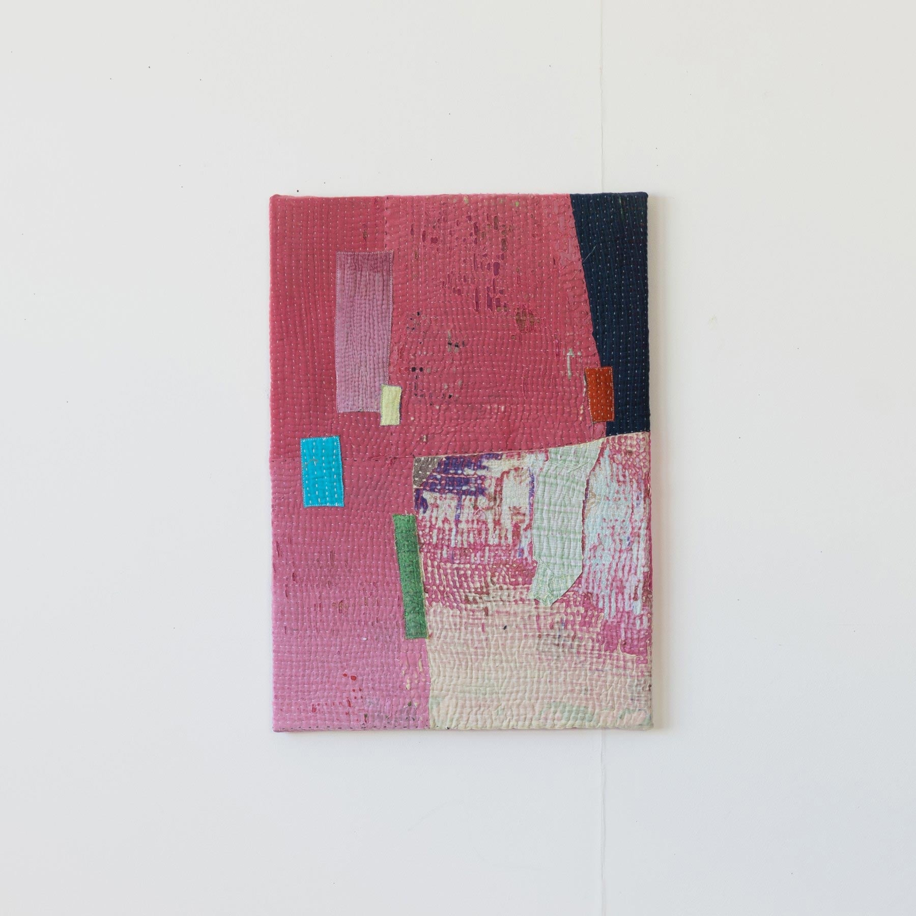 ヴィンテージの大判のカンタカバーは、全体の色合いが美しいものでも、部分的に穴やダメージがあることがよくあります。そこで、特に気に入った部分だけを切り取り、パネルに仕立てて、いつでも眺めらたらいいなと思いました。