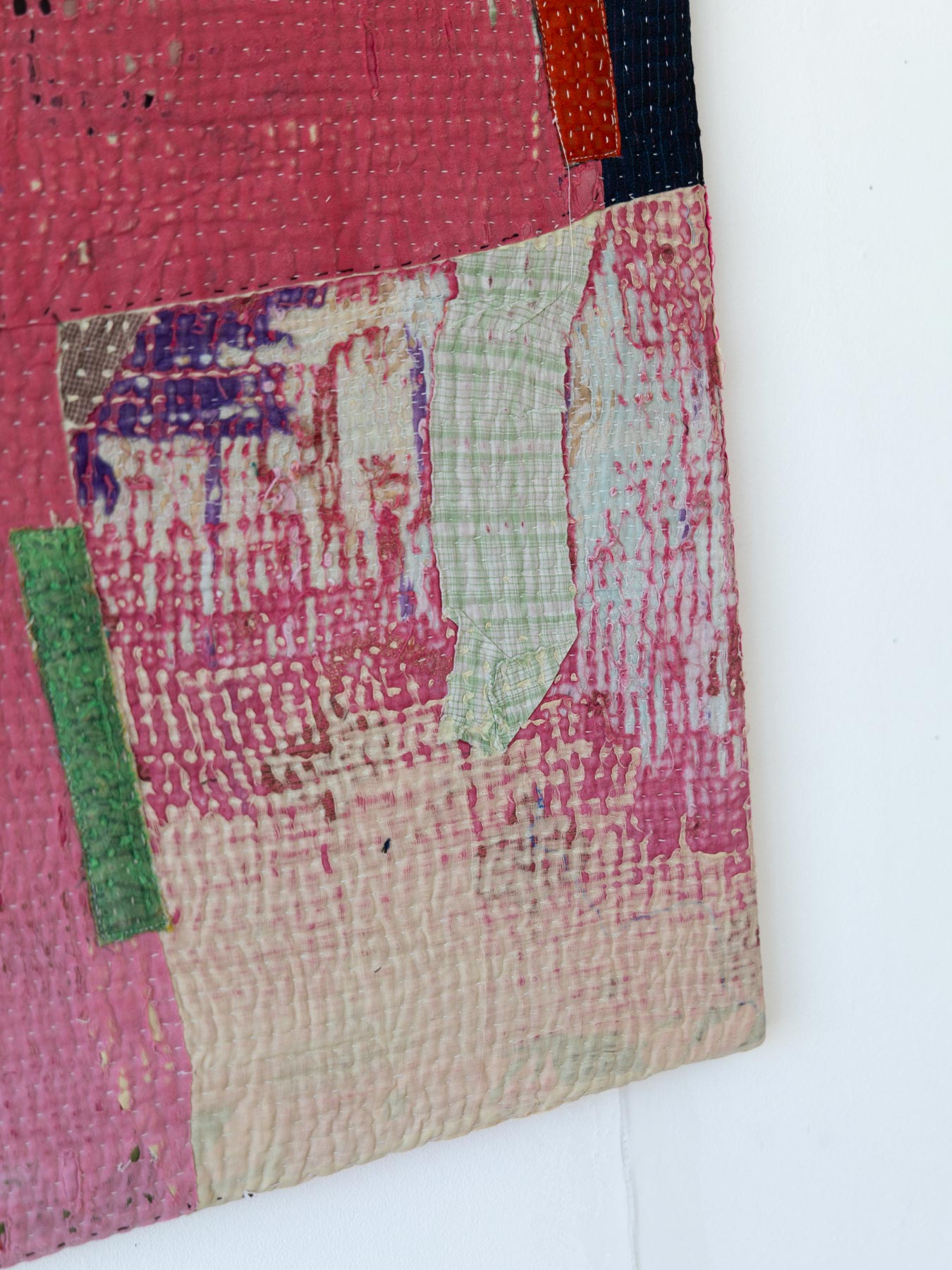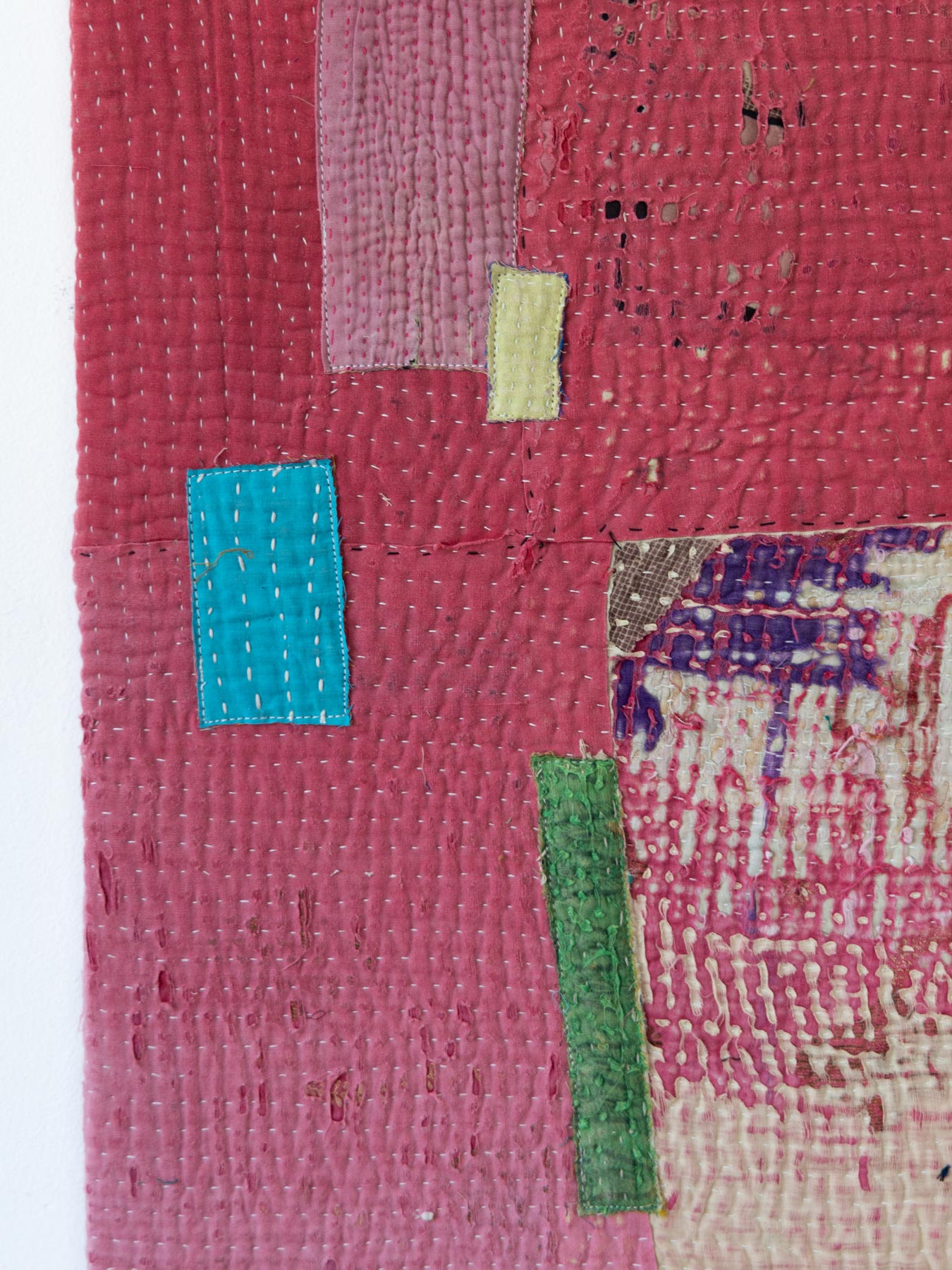 カンタとはインドのベンガル地方を中心に伝わる刺子刺繍のこと。古い布を合わせてひと針ひと針、手仕事で刺し子が施されています。布の補強と装飾を兼ねたカンタ刺繍により、魅力的なファブリックに生まれ変わっています。