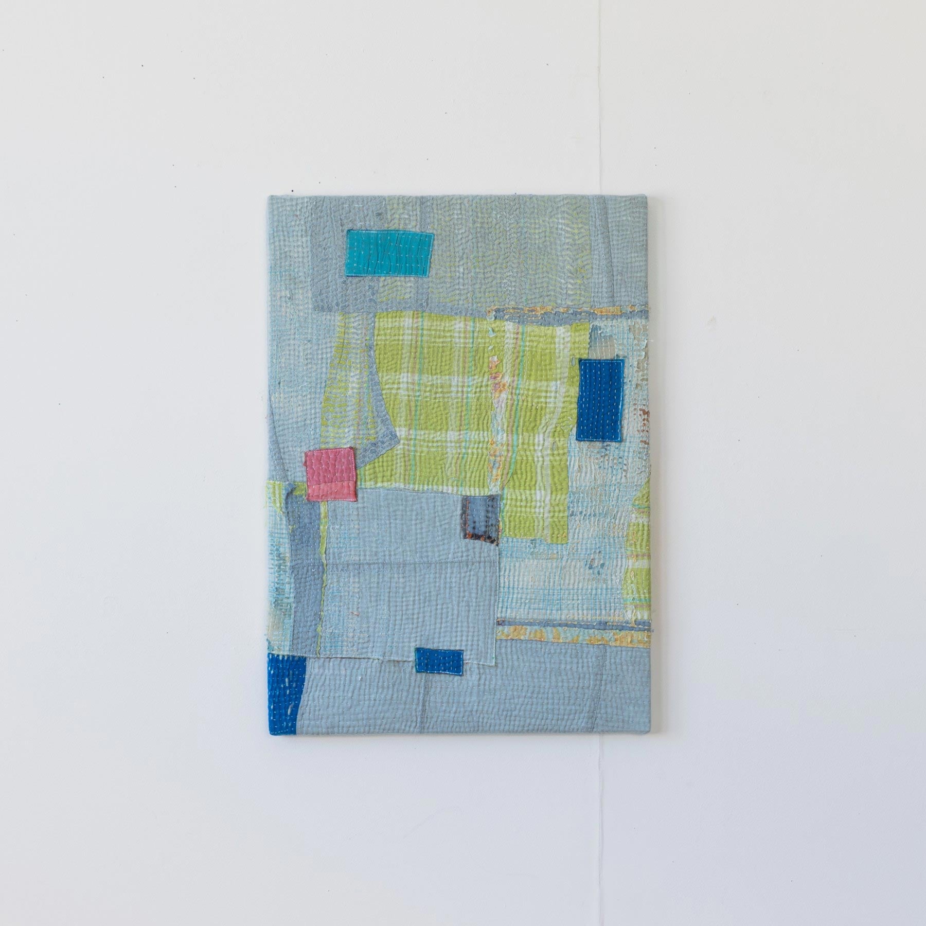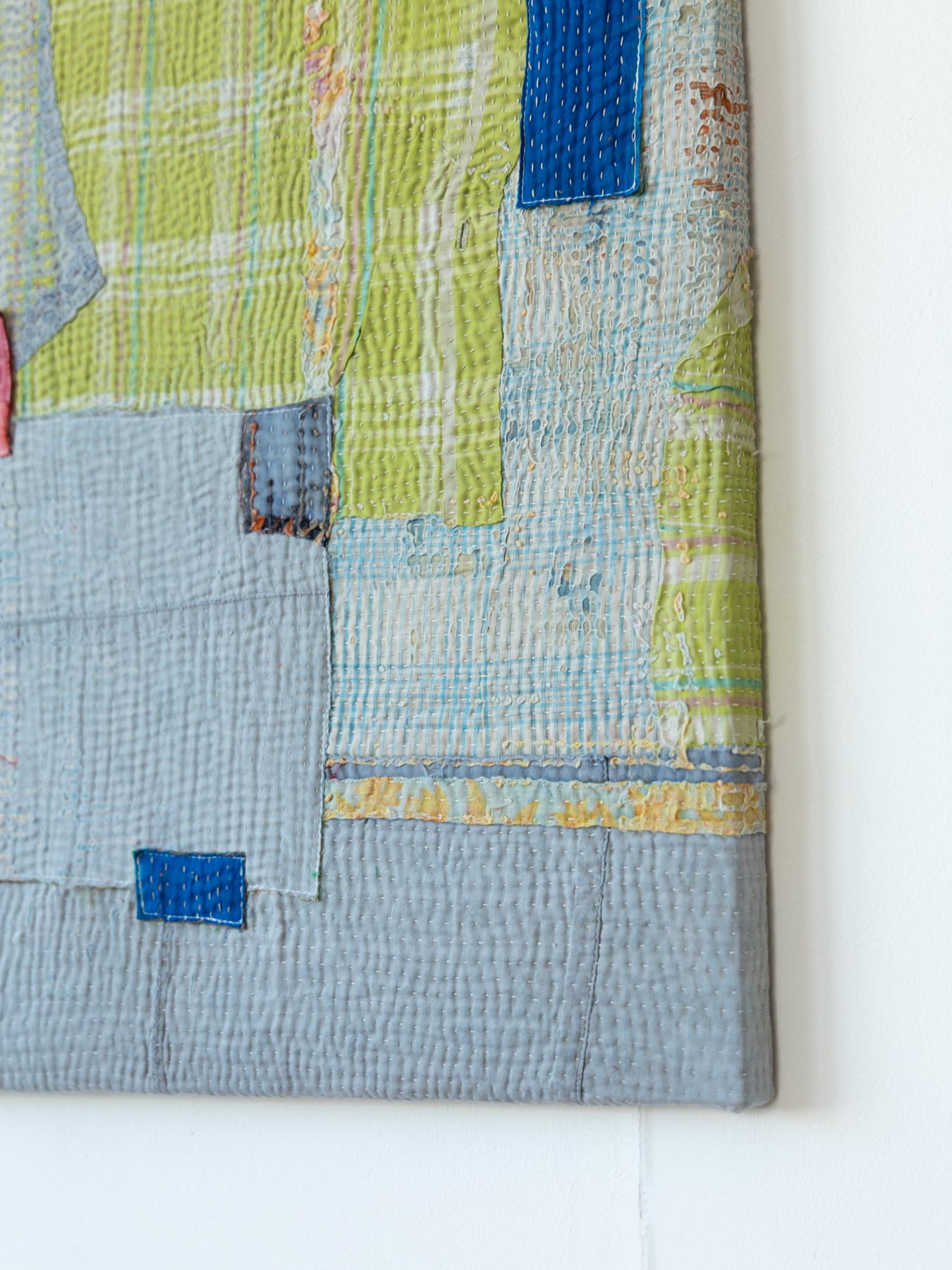 ヴィンテージの大判のカンタカバーは、全体の色合いが美しいものでも、部分的に穴やダメージがあることがよくあります。そこで、特に気に入った部分だけを切り取り、パネルに仕立てて、いつでも眺めらたらいいなと思いました。