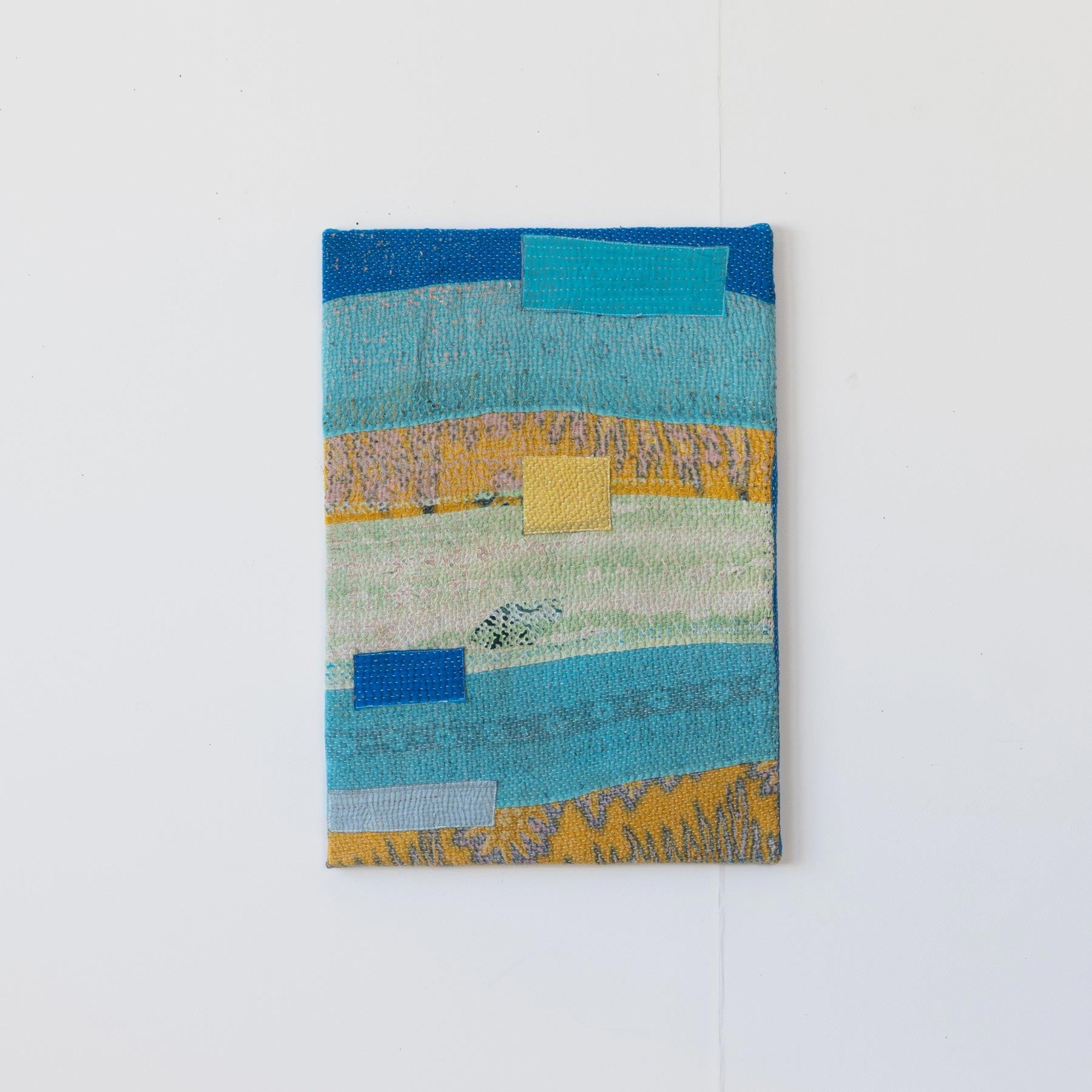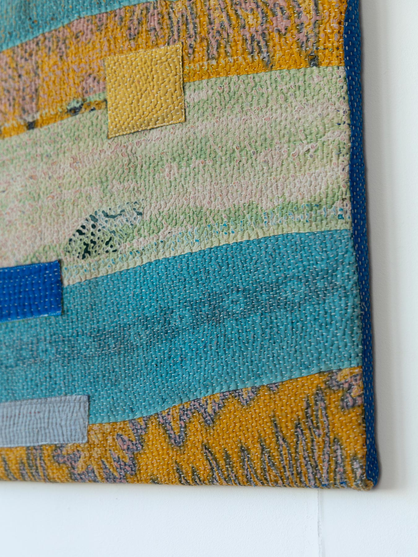 ヴィンテージの大判のカンタカバーは、全体の色合いが美しいものでも、部分的に穴やダメージがあることがよくあります。そこで、特に気に入った部分だけを切り取り、パネルに仕立てて、いつでも眺めらたらいいなと思いました。
