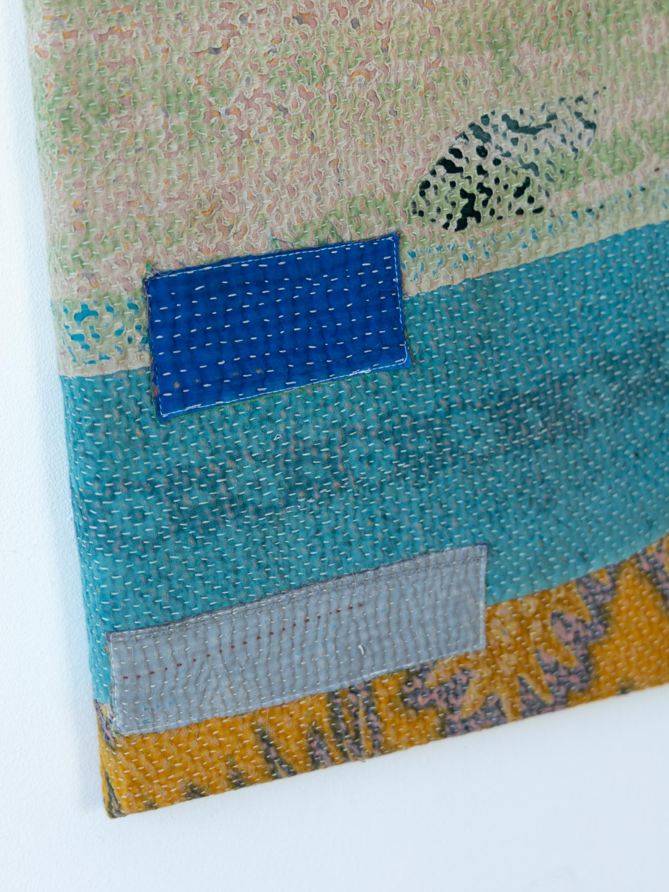カンタとはインドのベンガル地方を中心に伝わる刺子刺繍のこと。古い布を合わせてひと針ひと針、手仕事で刺し子が施されています。布の補強と装飾を兼ねたカンタ刺繍により、魅力的なファブリックに生まれ変わっています。