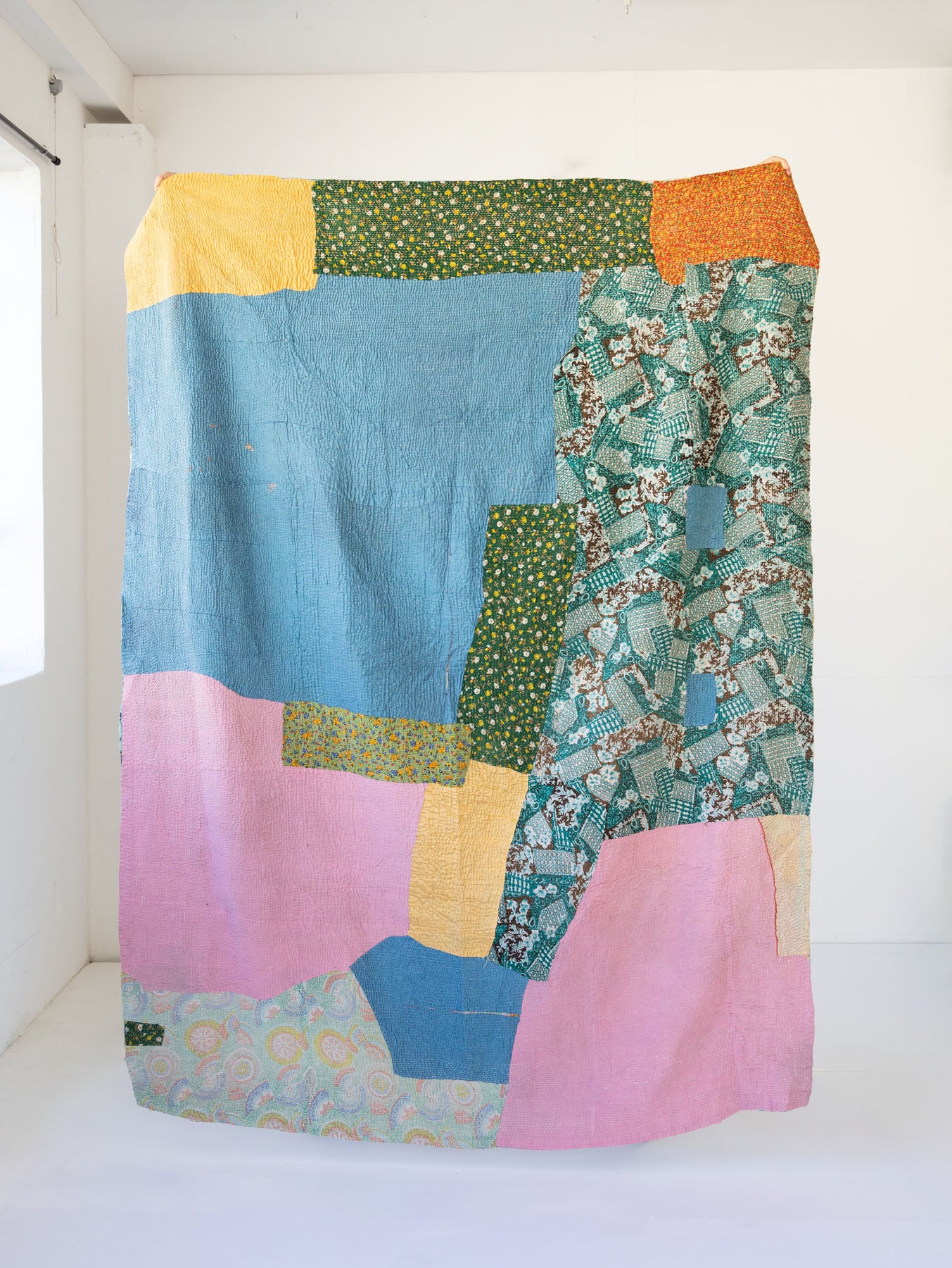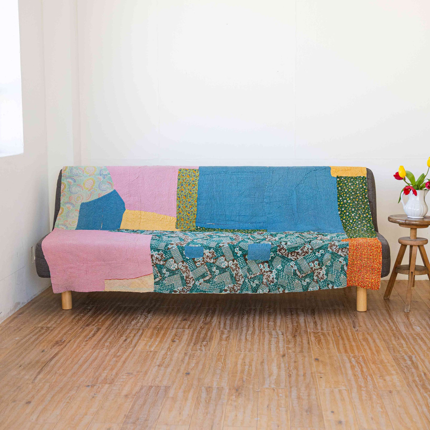 古いサリーに新たな命を吹き込むように、ひと針ひと針丁寧に手仕事で仕立てられたマルチカバーです。