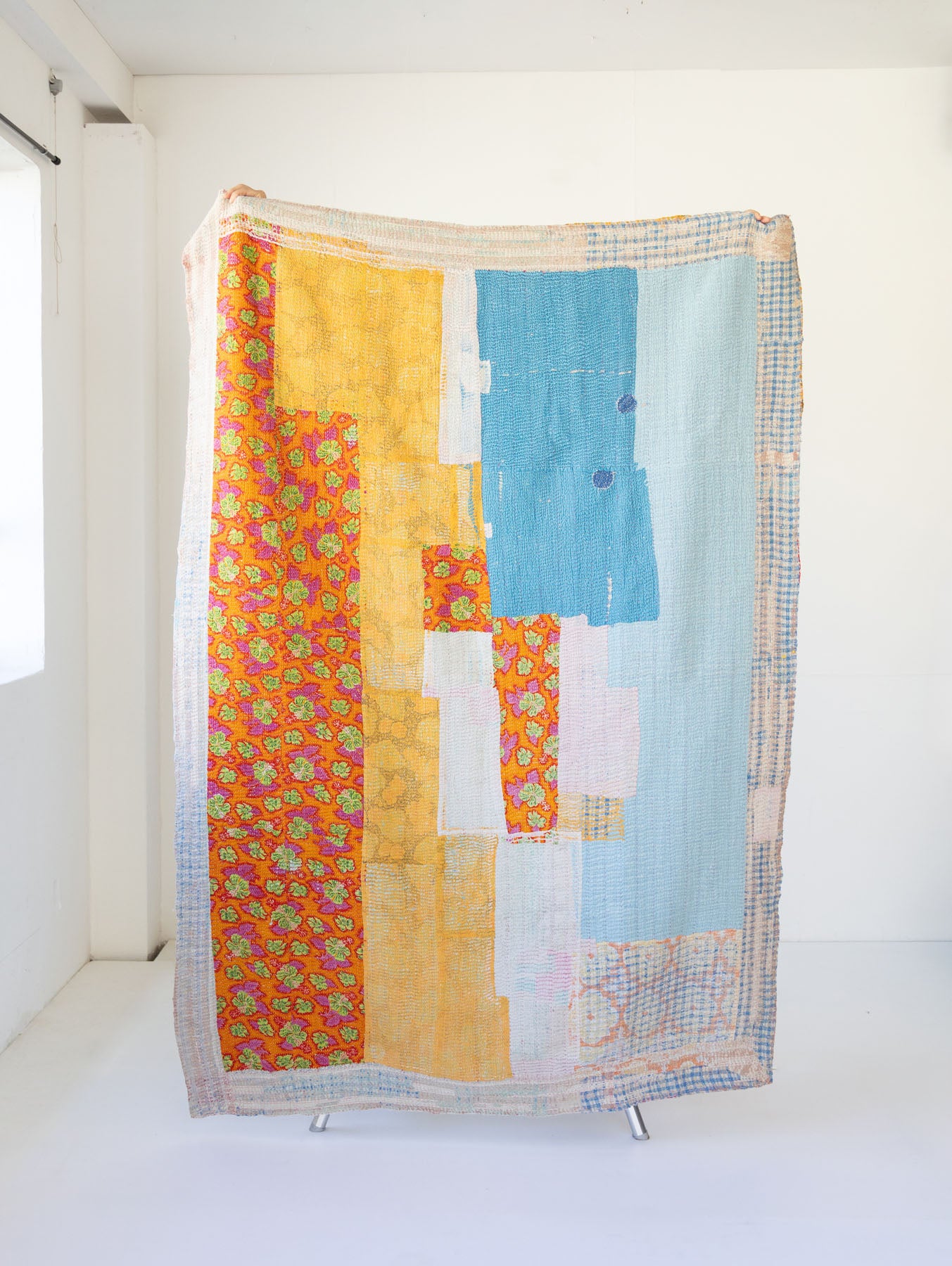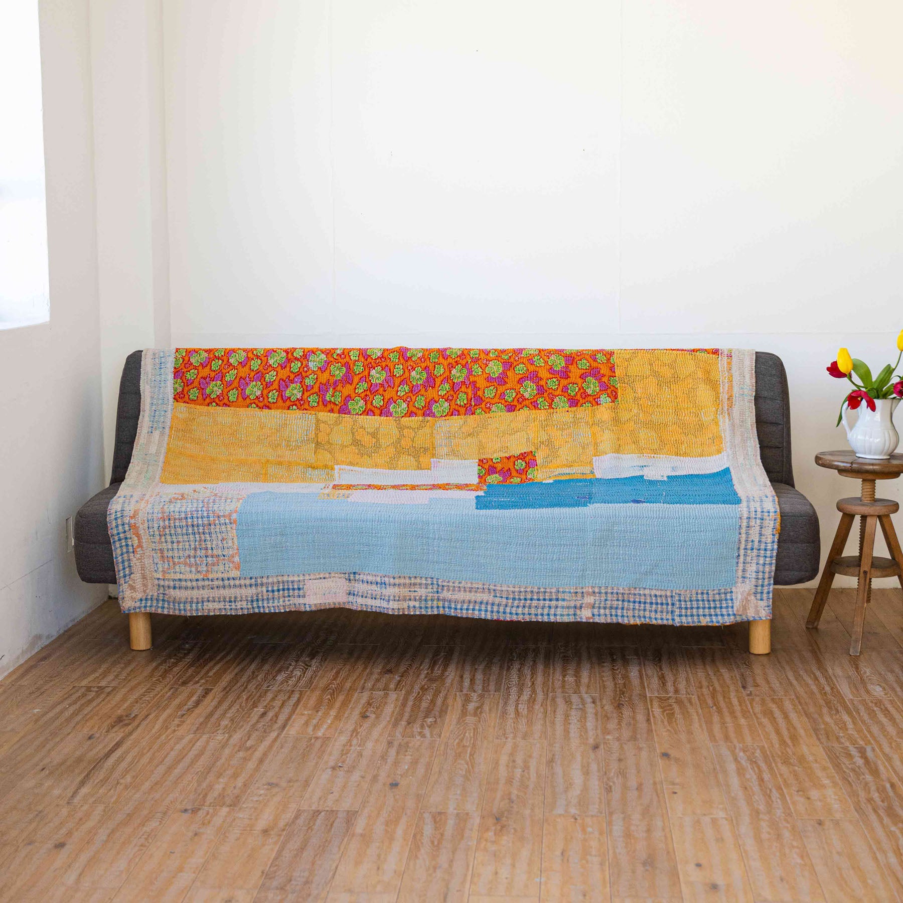古いサリーに新たな命を吹き込むように、ひと針ひと針丁寧に手仕事で仕立てられたマルチカバーです。