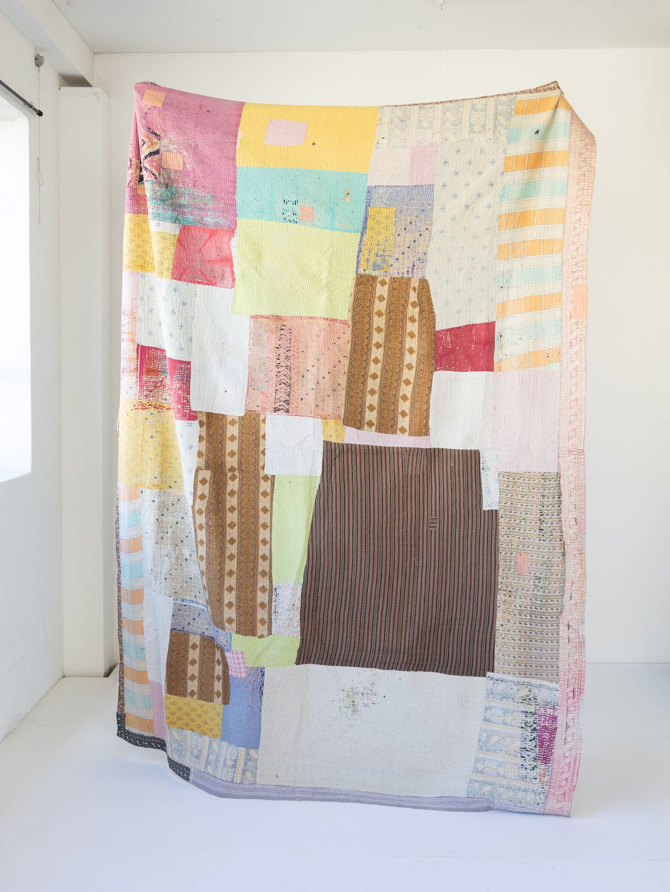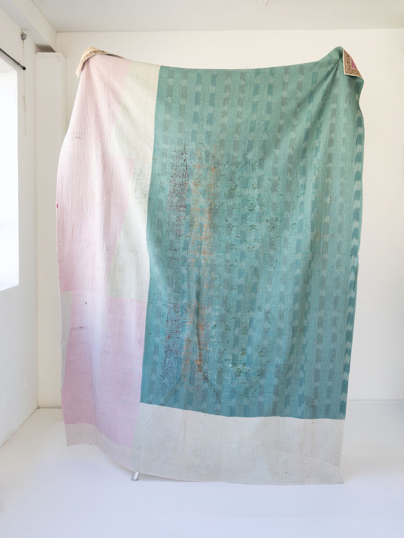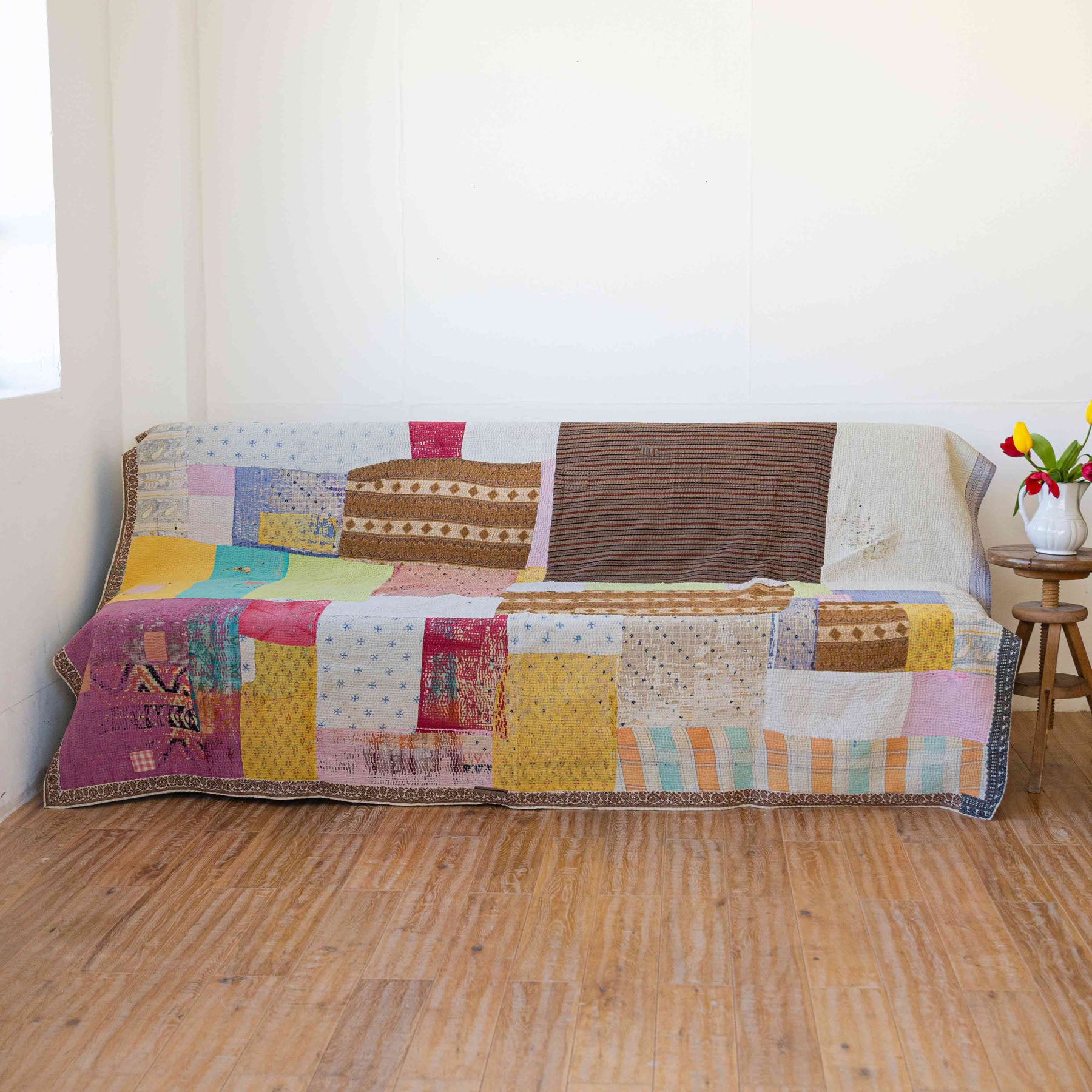 古いサリーに新たな命を吹き込むように、ひと針ひと針丁寧に手仕事で仕立てられたマルチカバーです。
