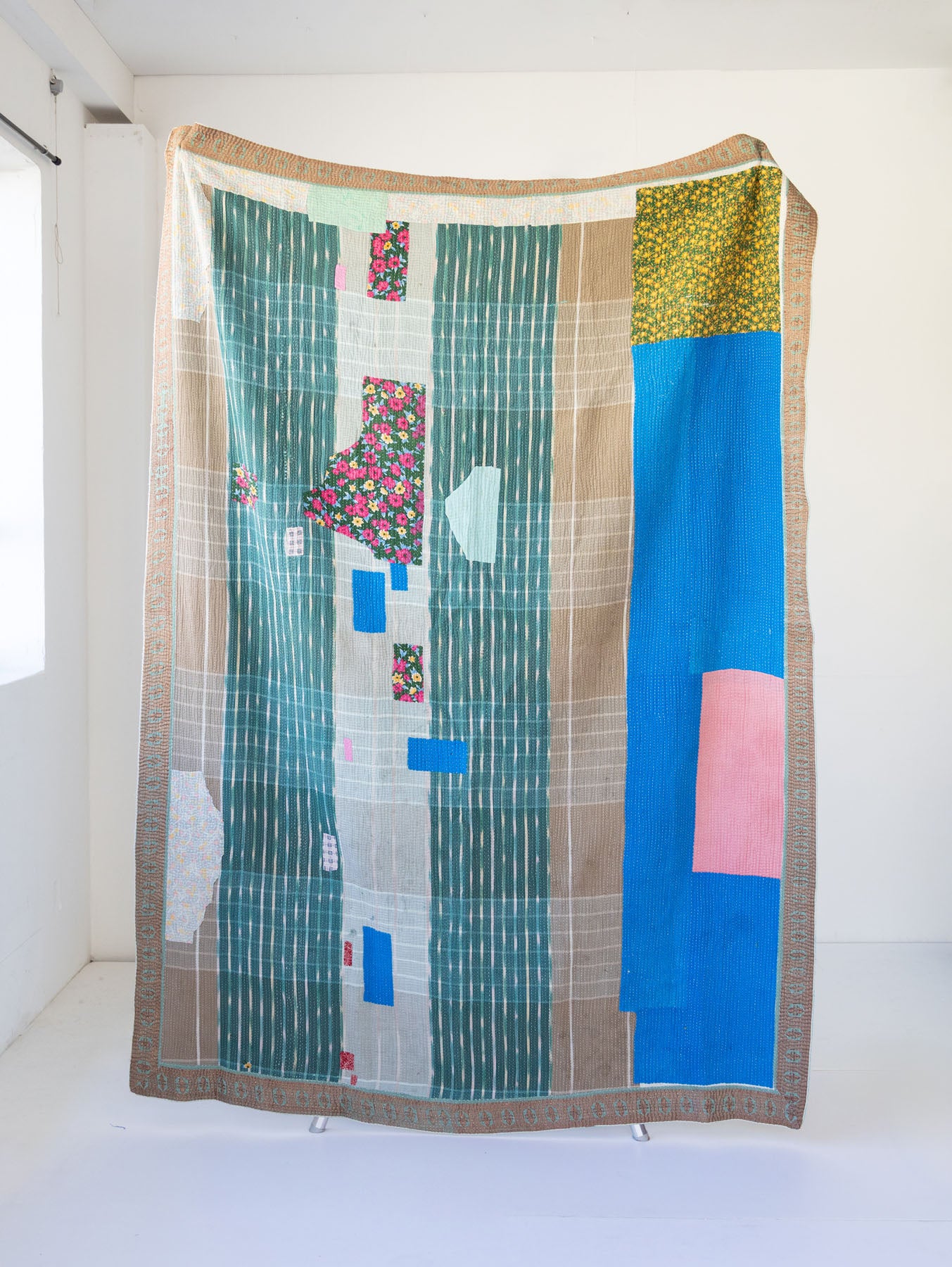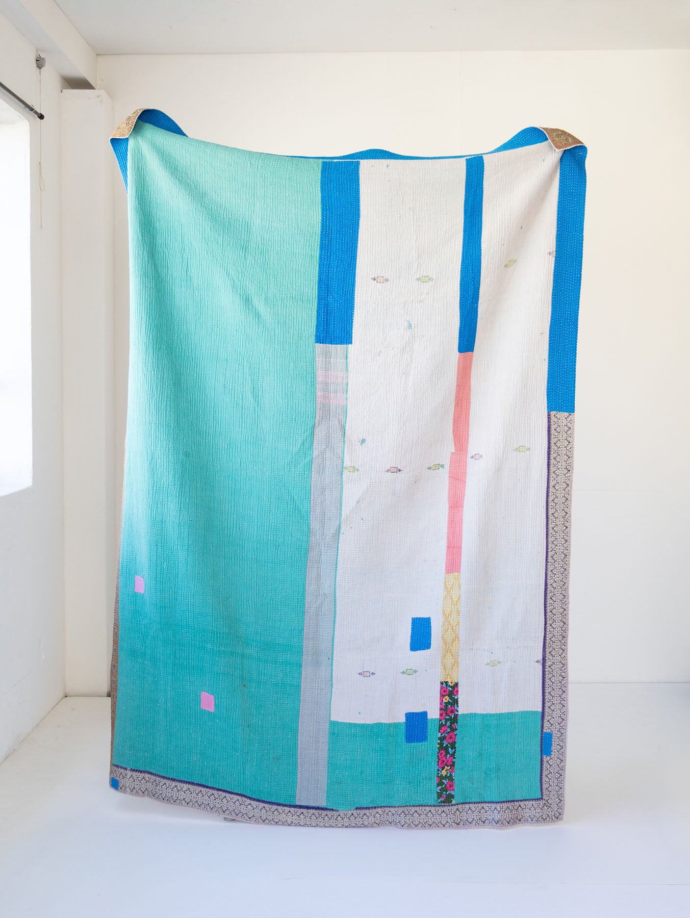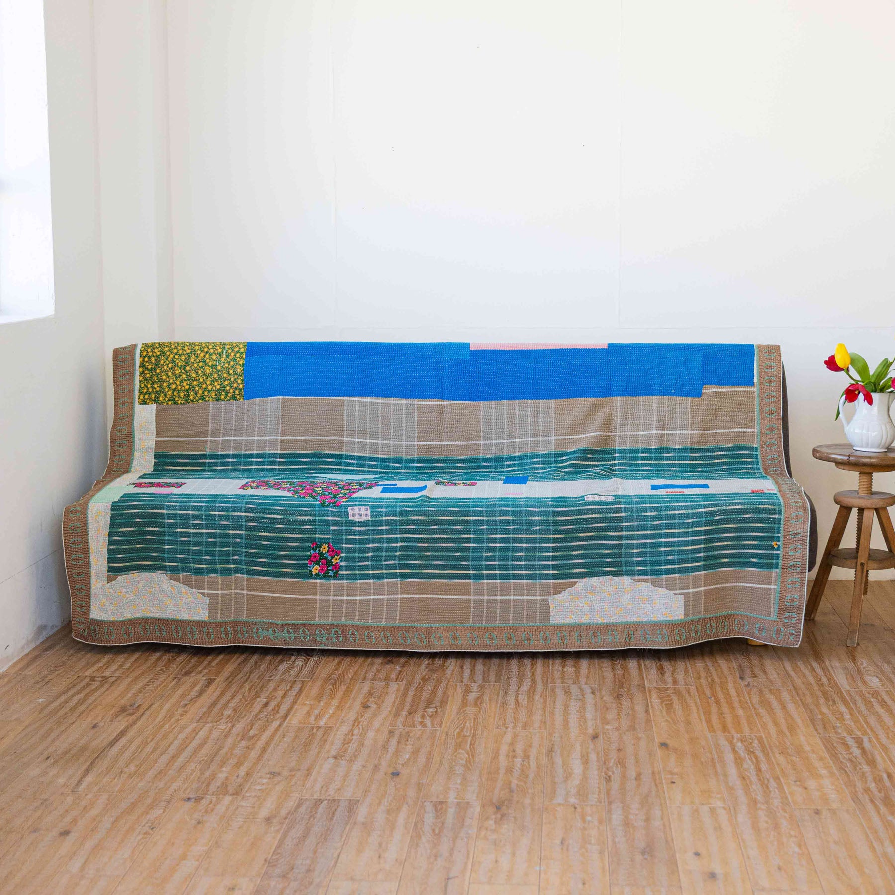 古いサリーに新たな命を吹き込むように、ひと針ひと針丁寧に手仕事で仕立てられたマルチカバーです。