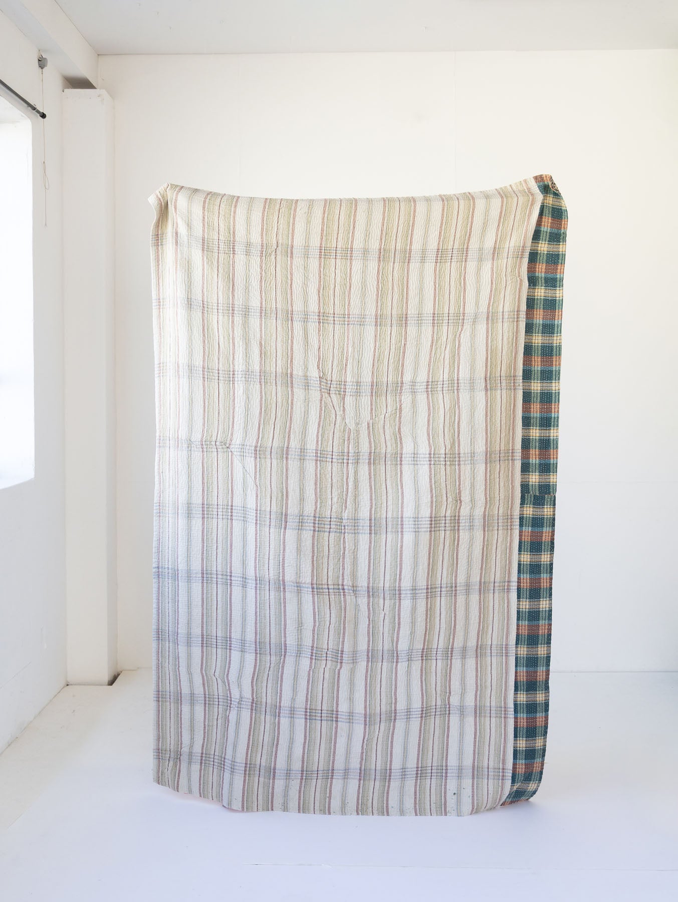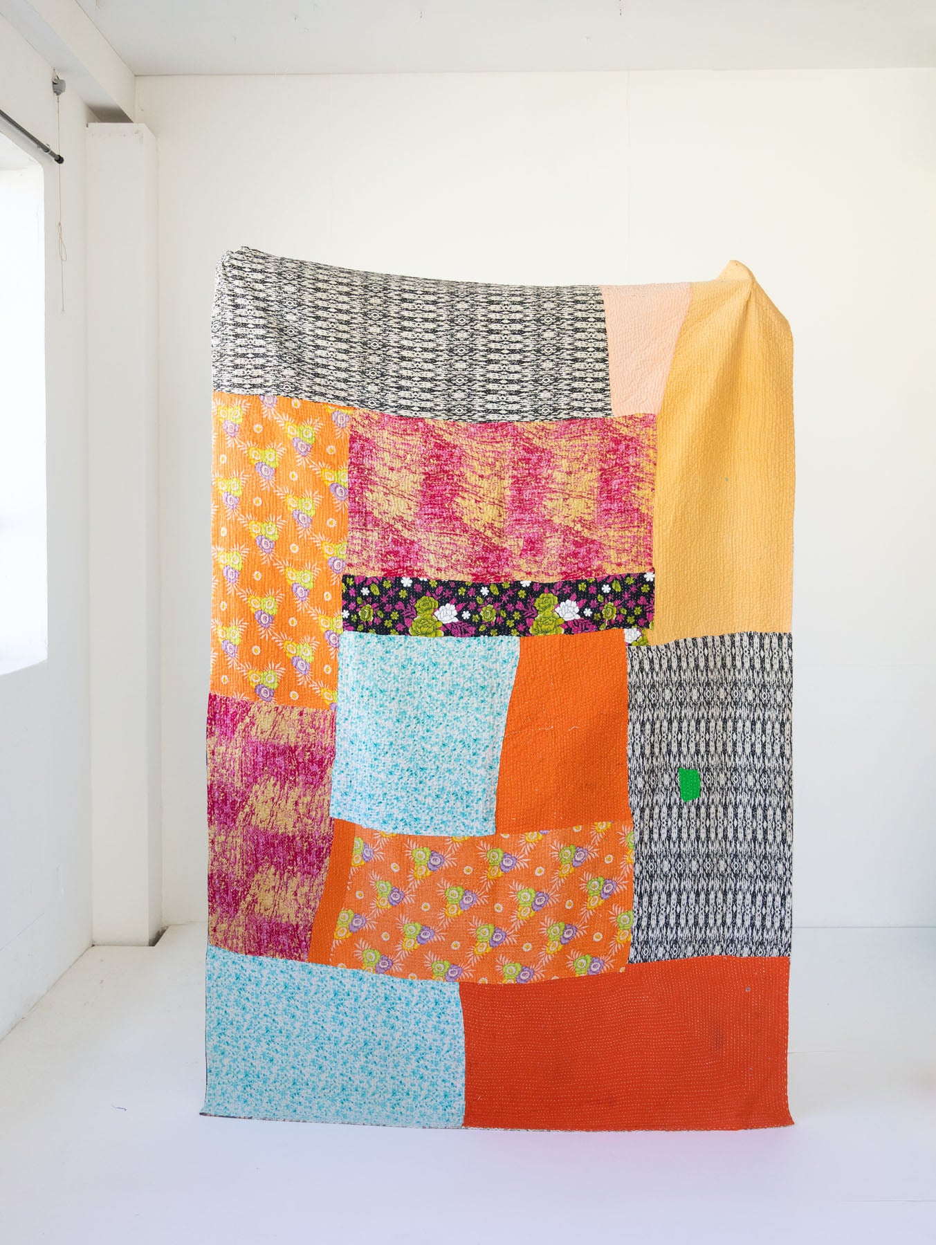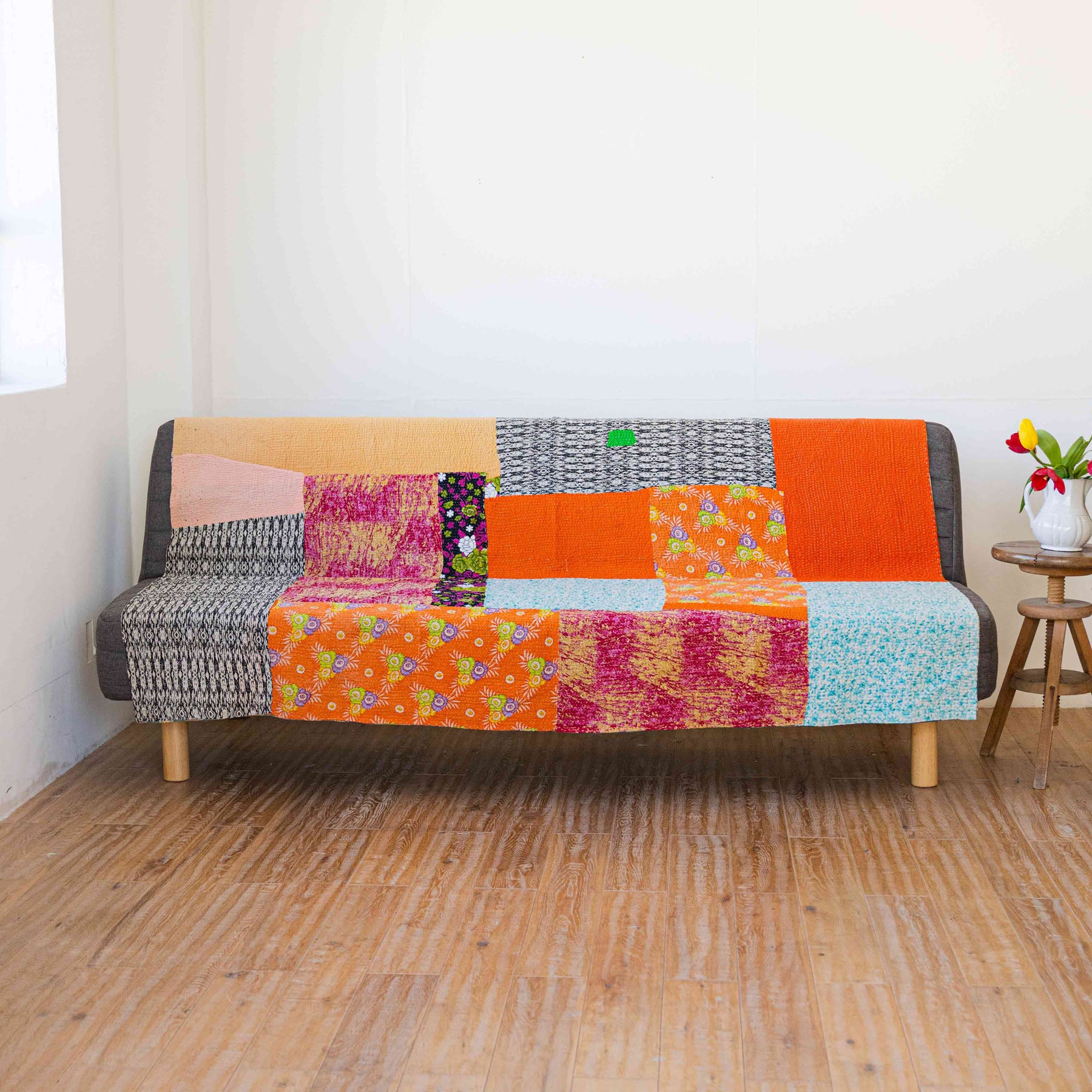古いサリーに新たな命を吹き込むように、ひと針ひと針丁寧に手仕事で仕立てられたマルチカバーです。