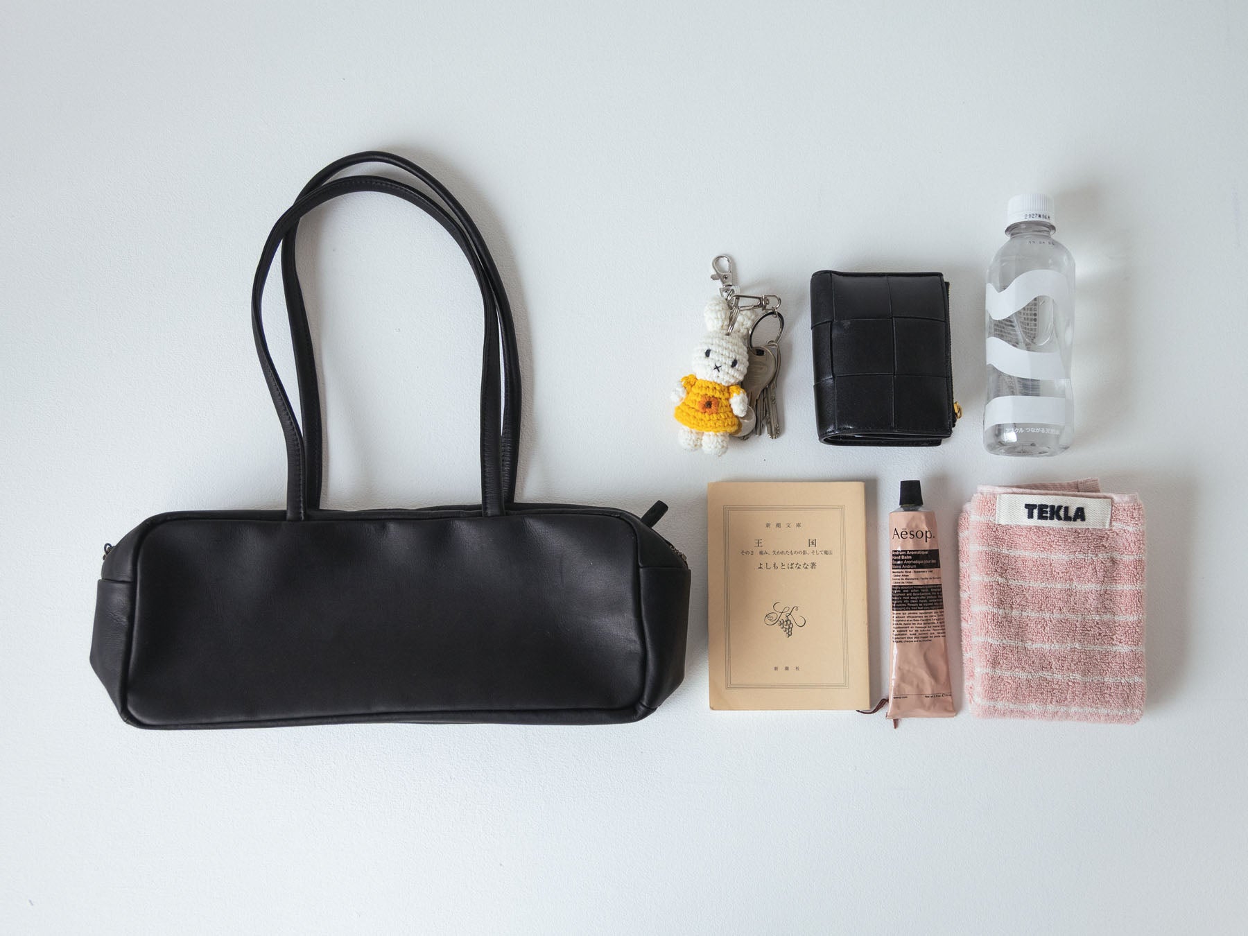 深さがなく、口が大きく開くので、中身も確認しやすいですよ。傘や水筒など長めのものもOK。コンパクトに見えて意外と色々入ります。