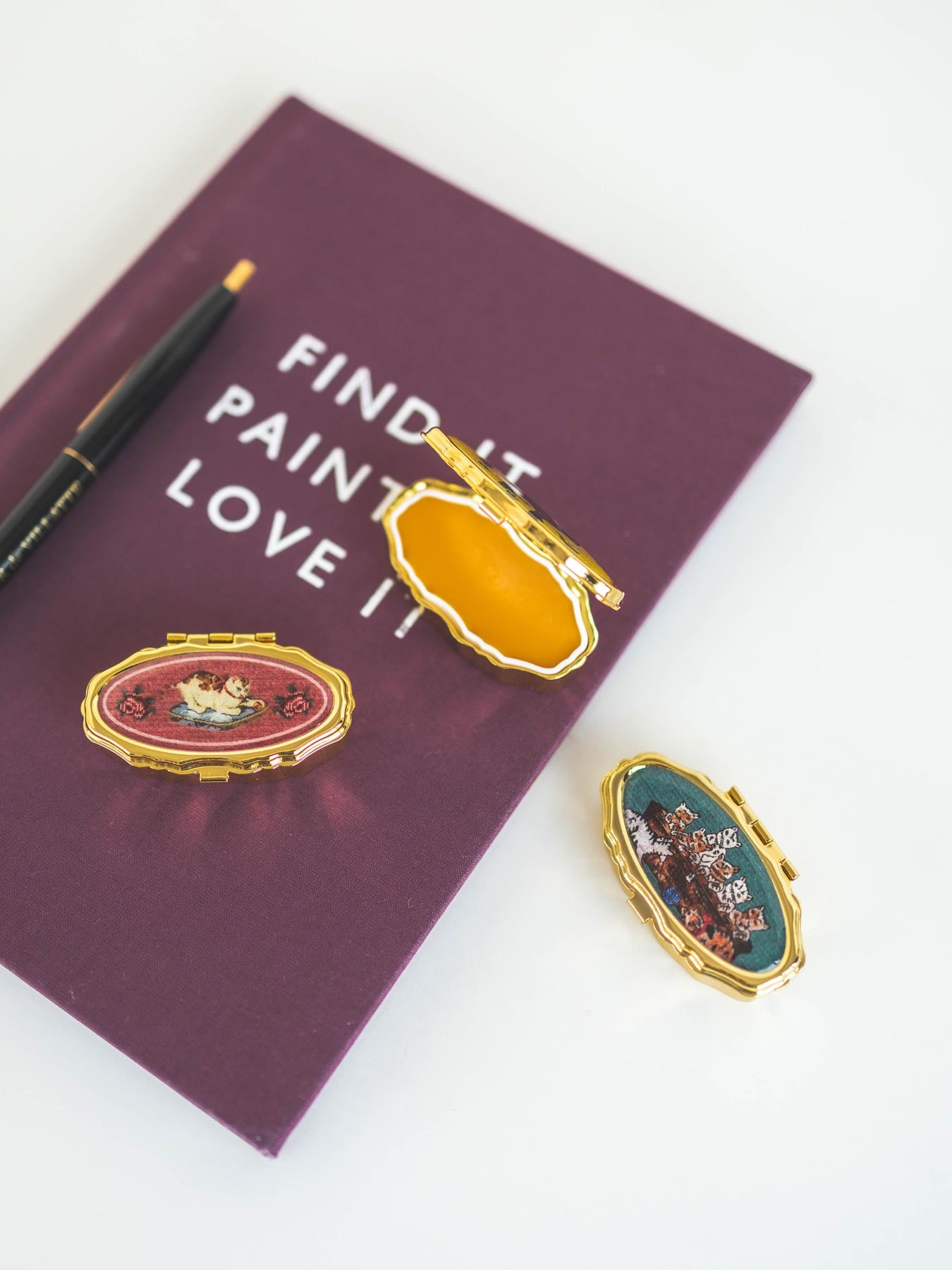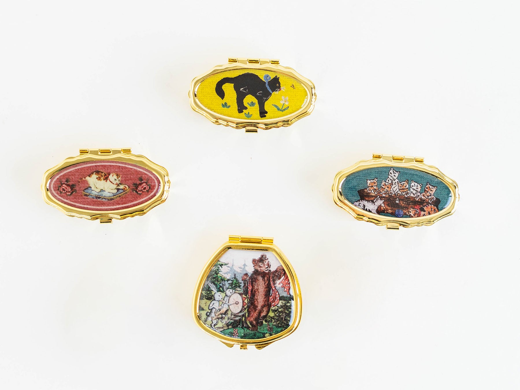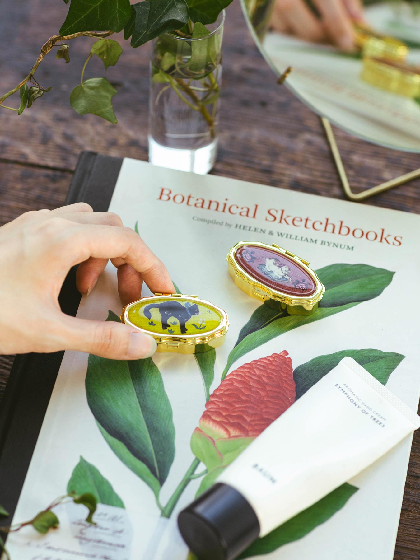 ヴィンテージ缶をモチーフにしたケースは、ミラーが付いたコンパクト仕様。 手のひらにすっぽり収まるサイズ感で、持ち歩きにぴったりです。