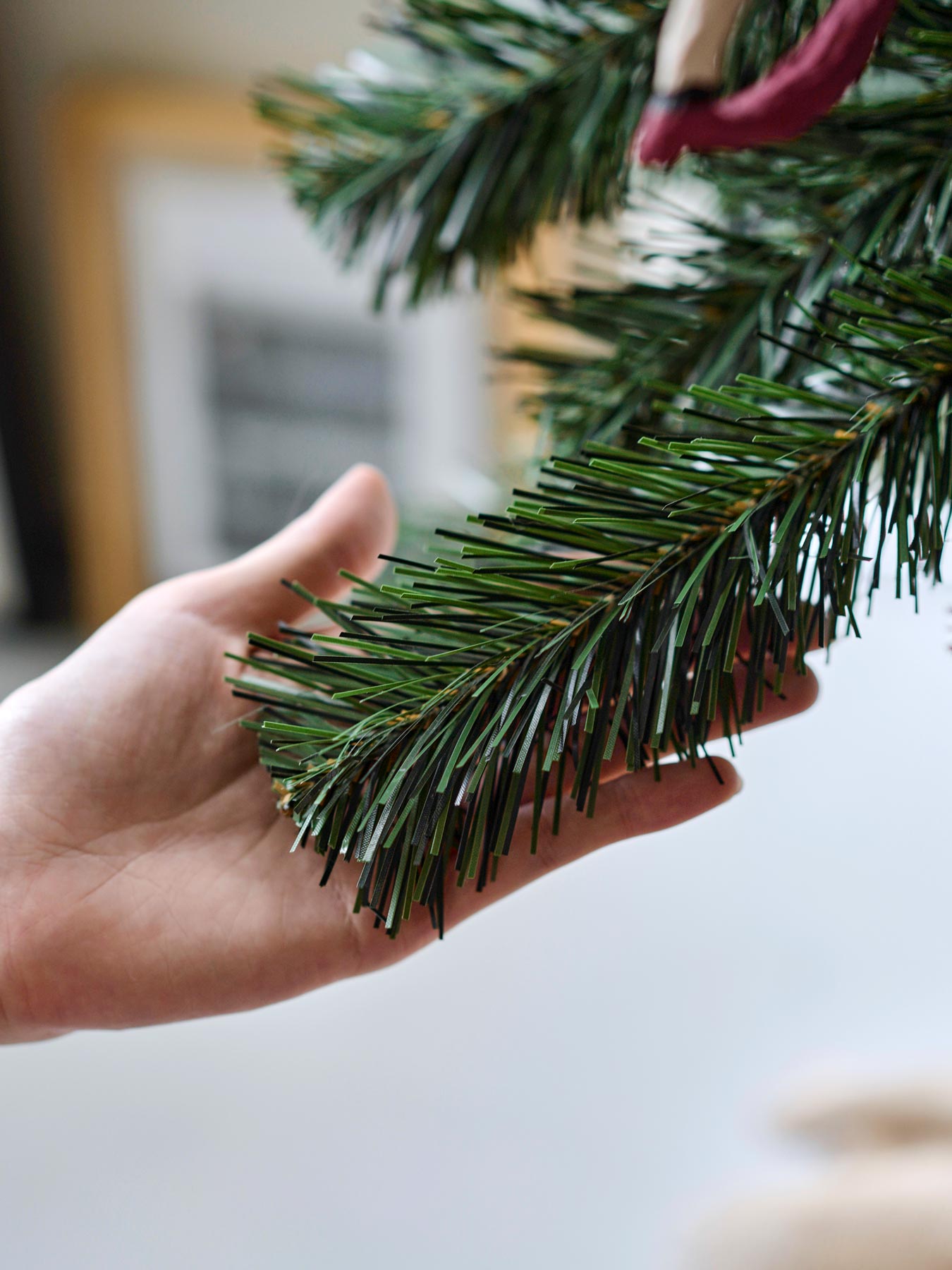 枝を下向きにしている場合、重いオーナメントはずり落ちてしまう可能性があります。