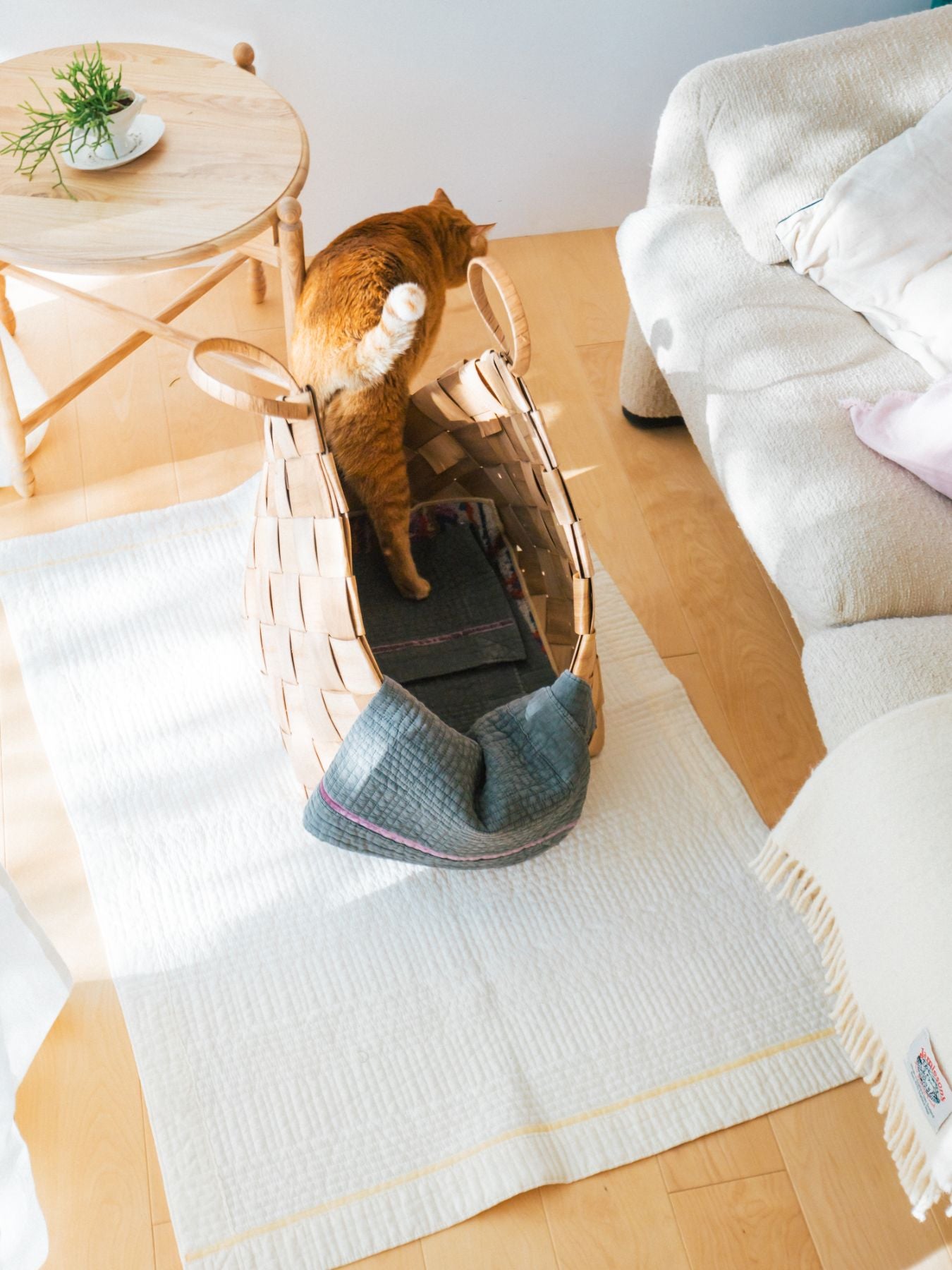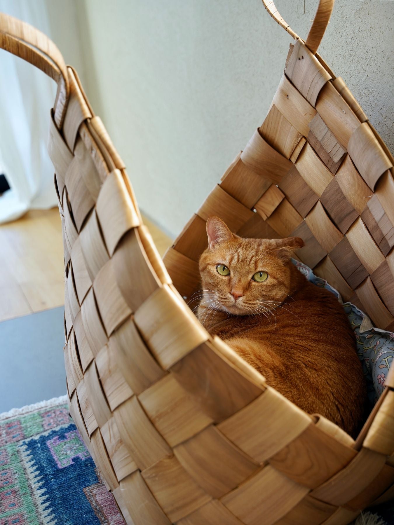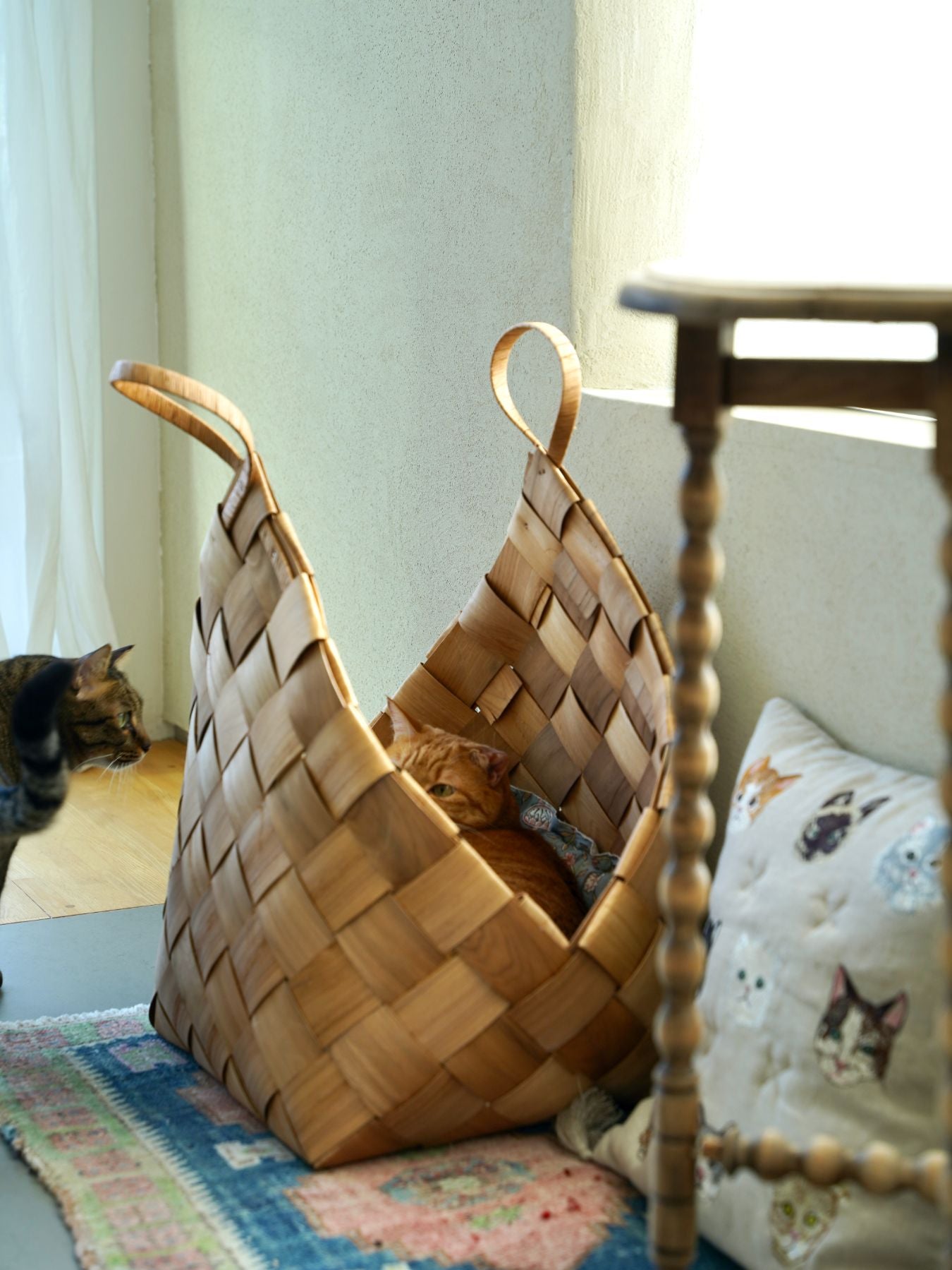 サイドが大きく開いているので出入りしやすいようで、猫たちはハウスとしてとても気に入っています。そしてとにかく収納としても優秀です。 このバスケットに入れてしまえばなんでも素敵に隠せます。