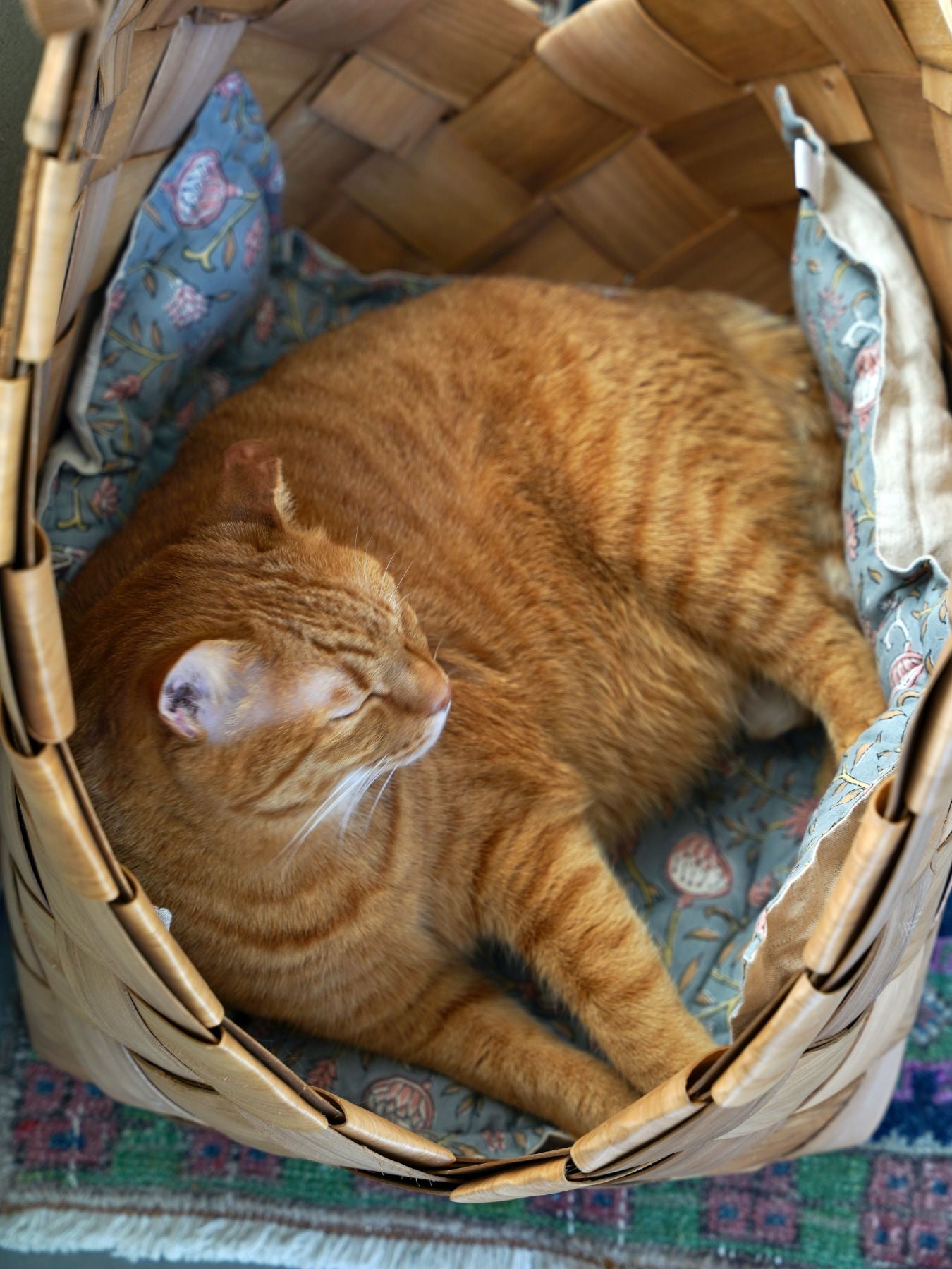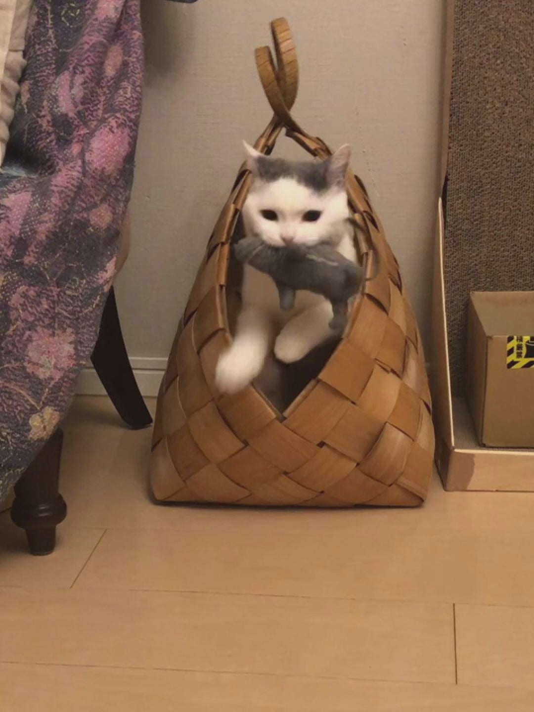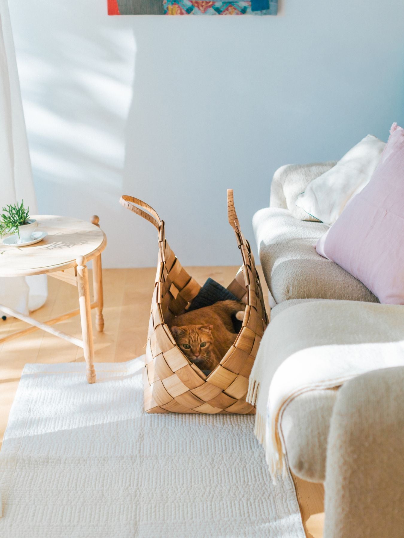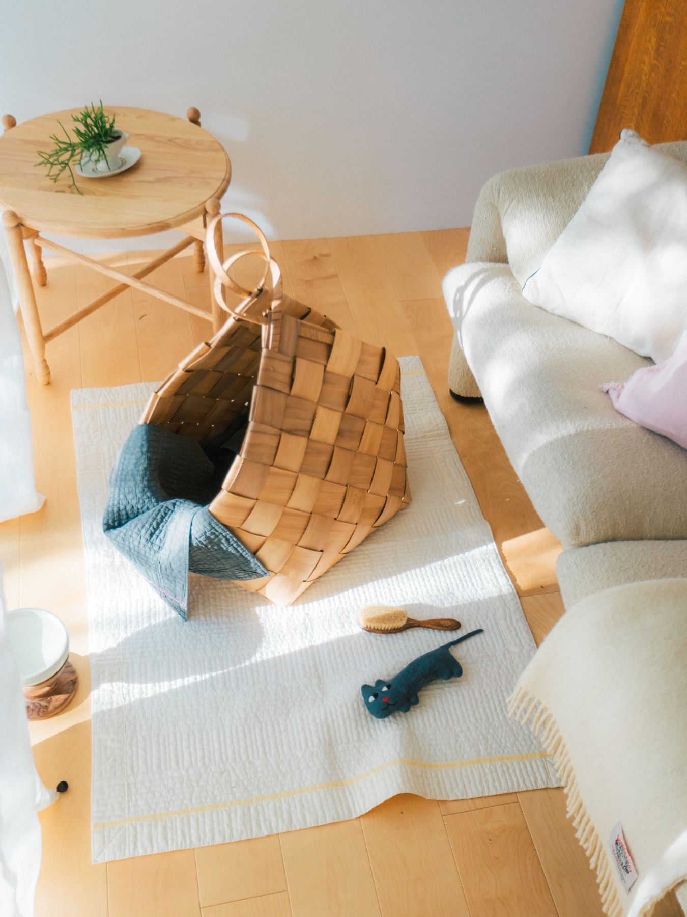 サイドが大きく開いているので出入りしやすいようで、猫たちはハウスとしてとても気に入っています。そしてとにかく収納としても優秀です。 このバスケットに入れてしまえばなんでも素敵に隠せます。