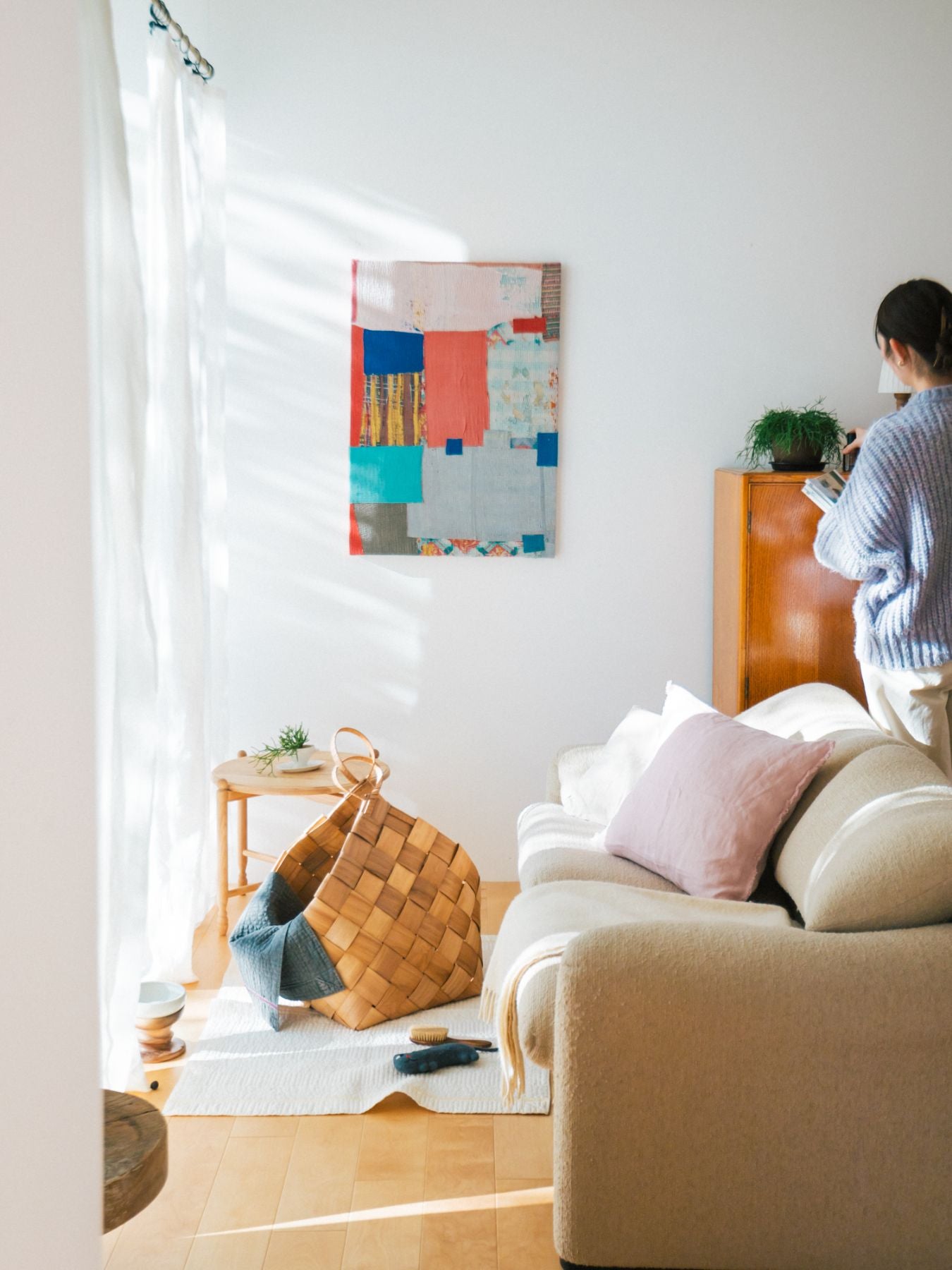 三角に尖ったフォルムがユニークで、素朴な素材を使いながらスタイリッシュな印象も与えるので、インテリアのアクセントとしてお部屋に置きながら整理収納に活躍します。
