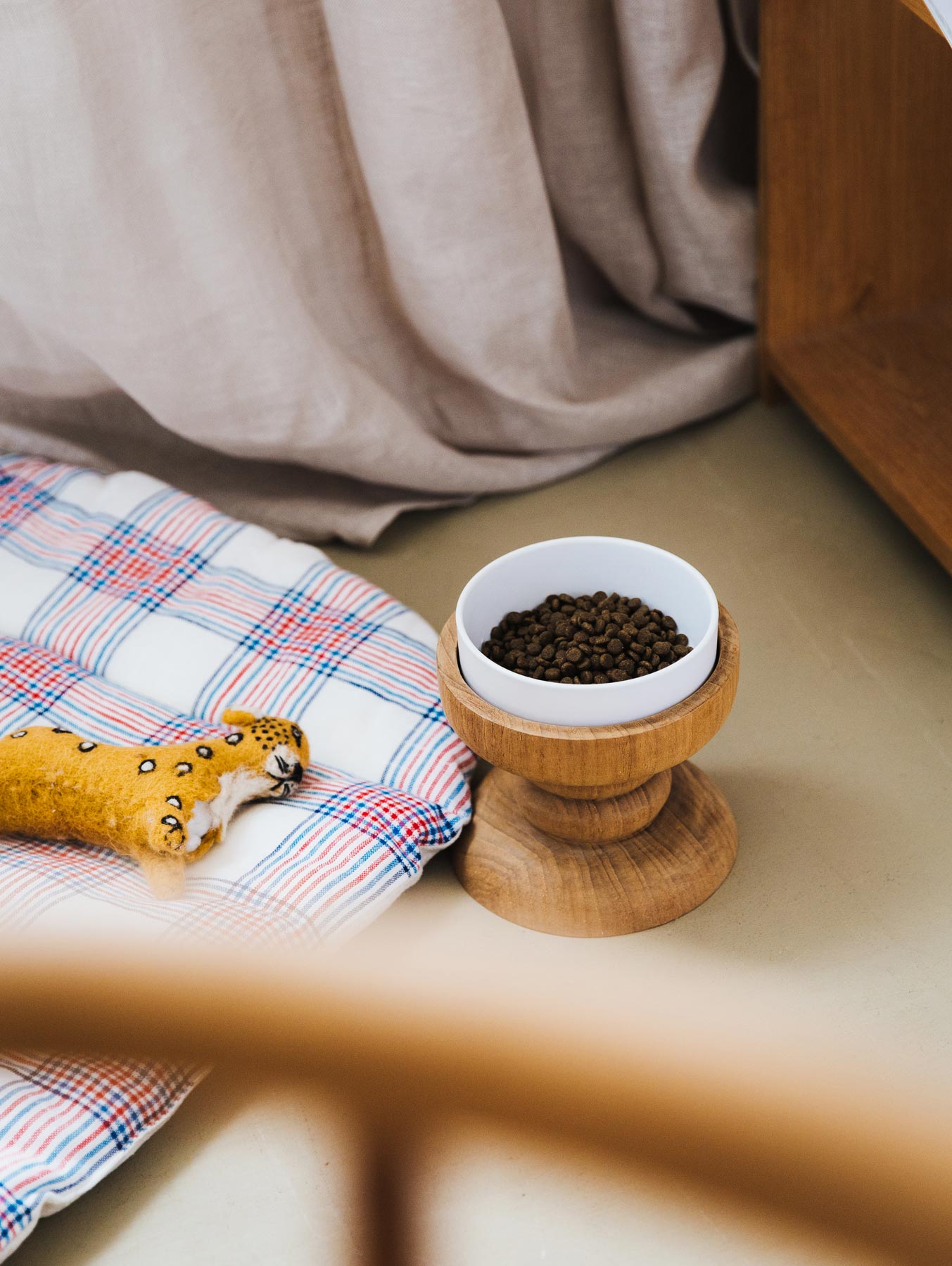 既製品ではなかなか出会えない、特別な雰囲気をまとったフードボウルスタンド。大切なワンちゃんの食事を心地よく整えつつ、インテリアにも自然に馴染むドッグアイテムです。