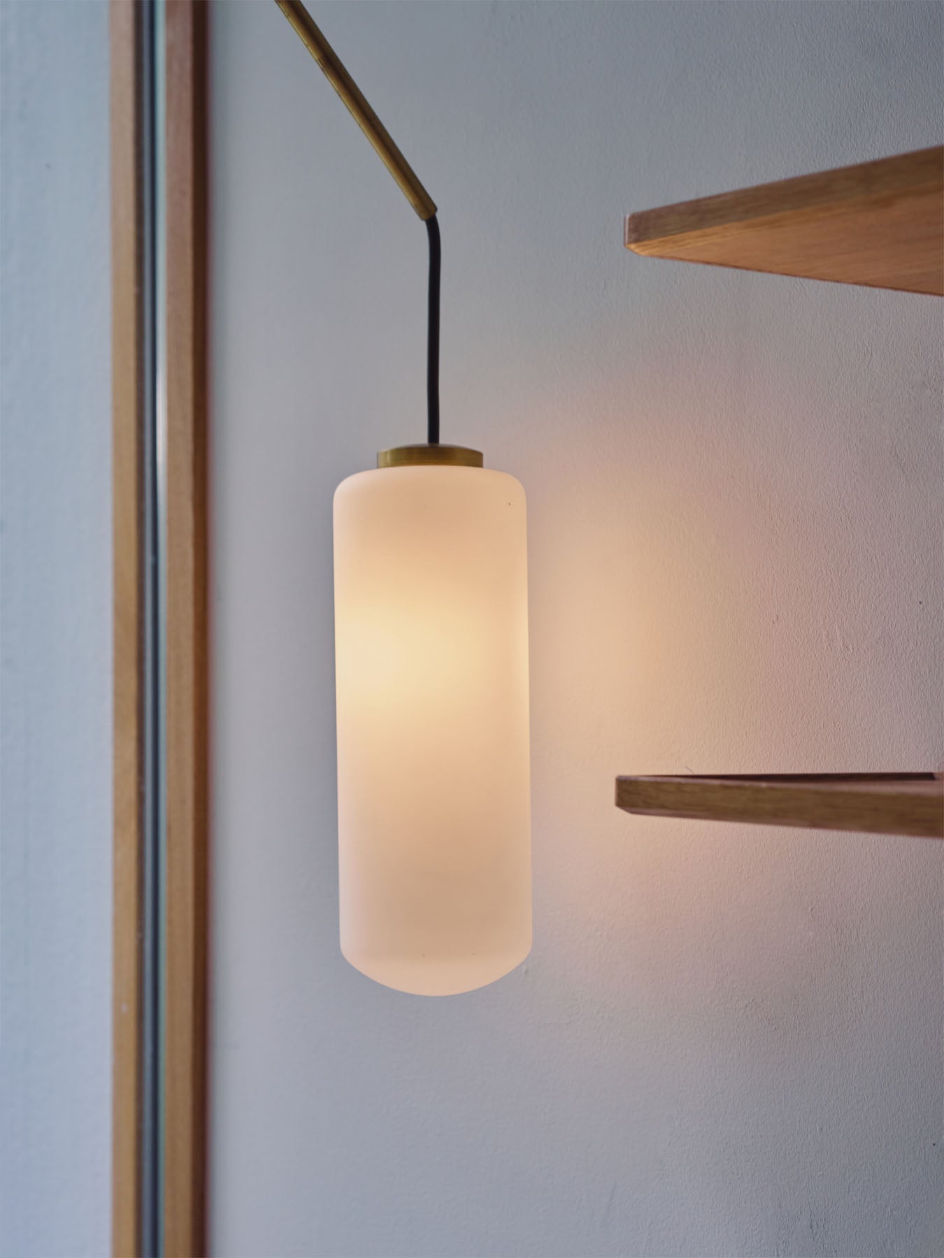 アングルをつけて曲げられた真鍮管の先に、白いガラスシェードのランプが下がる、ジオメトリックなフォルムのペンダントランプ。