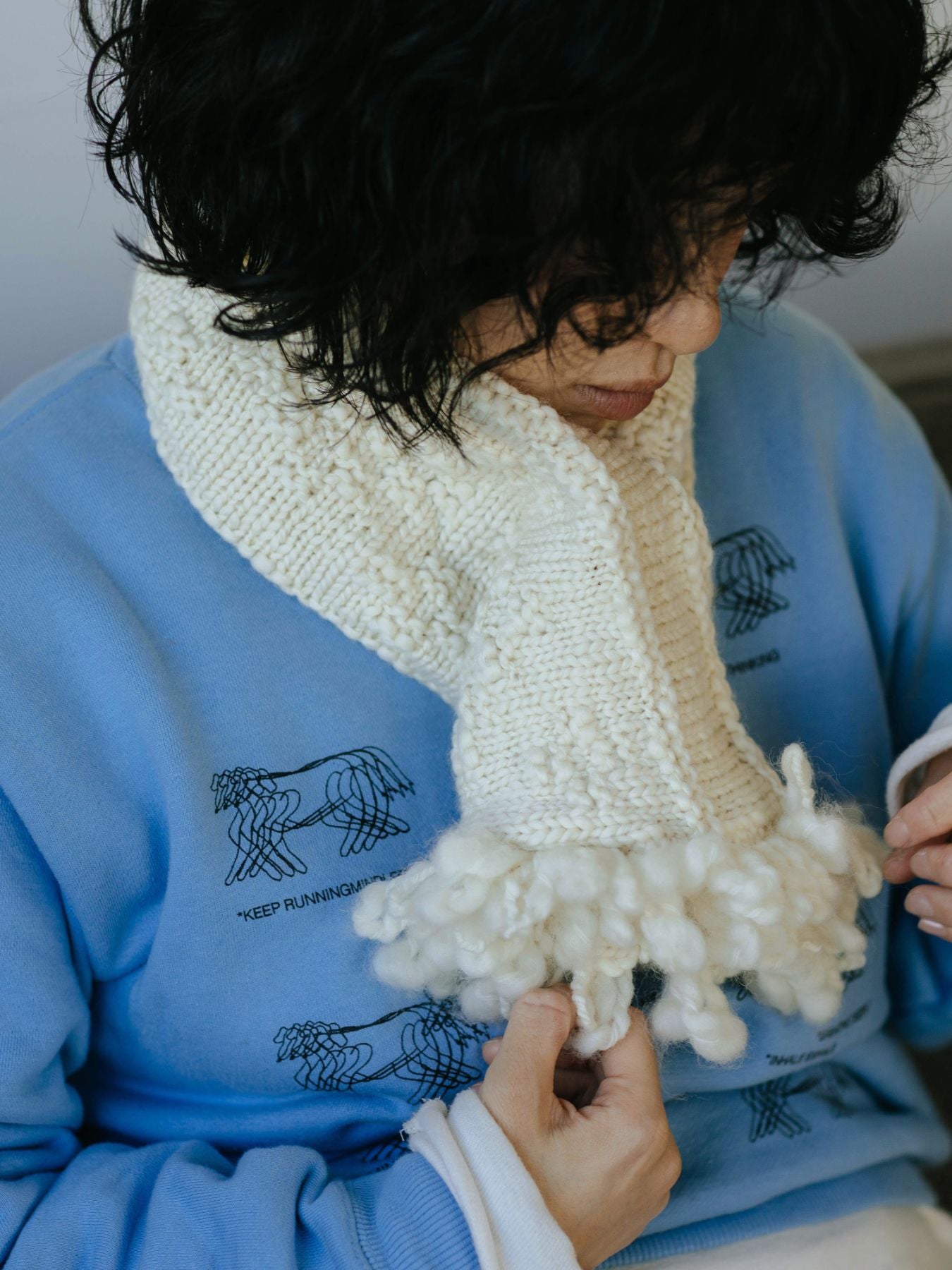 立体感のある編み模様が愛らしく、両端のループのボリュームもアクセントに。片方の端を裏側に通すだけできれいにまとまる、簡単に巻けるデザインになっています。